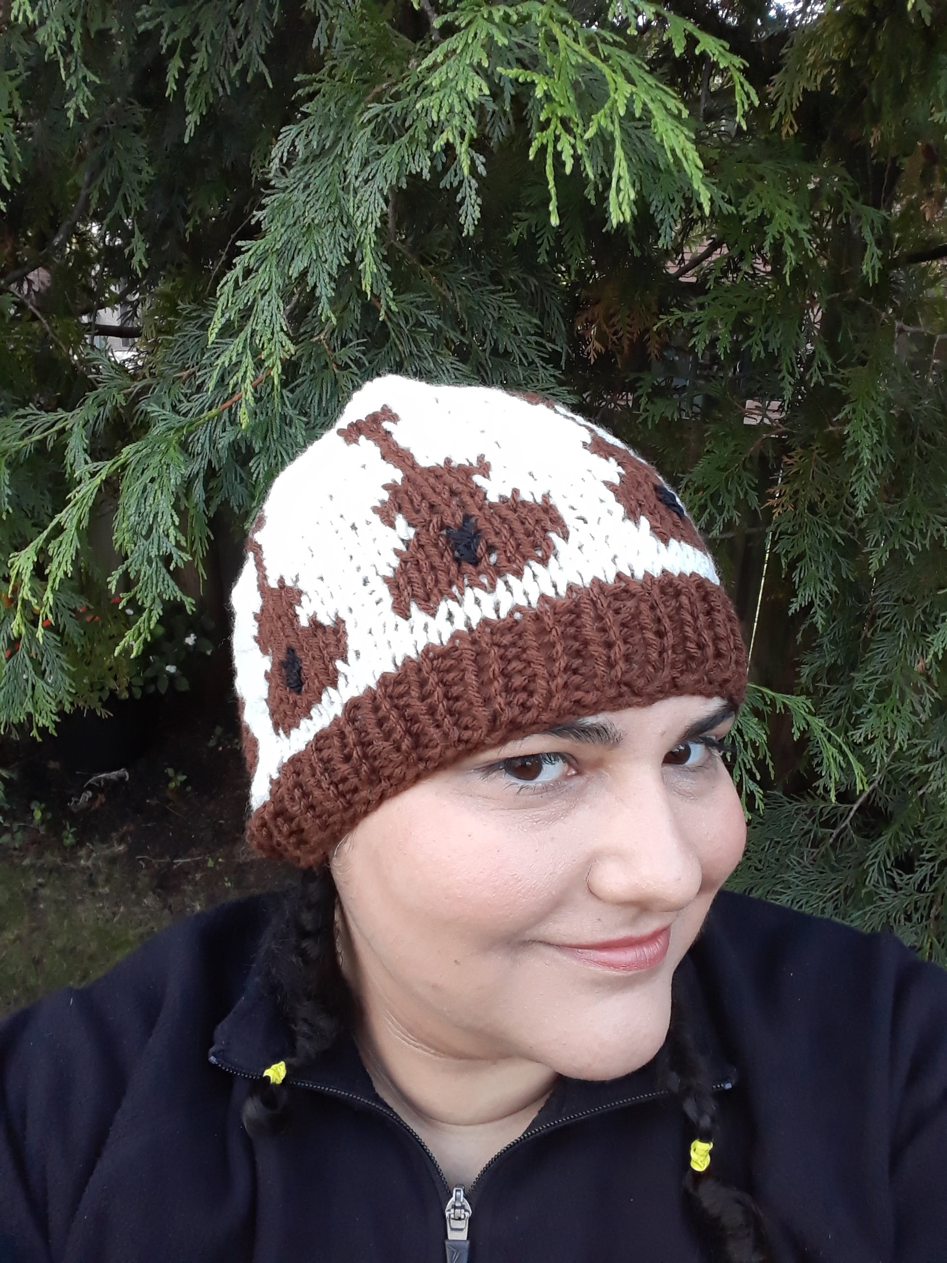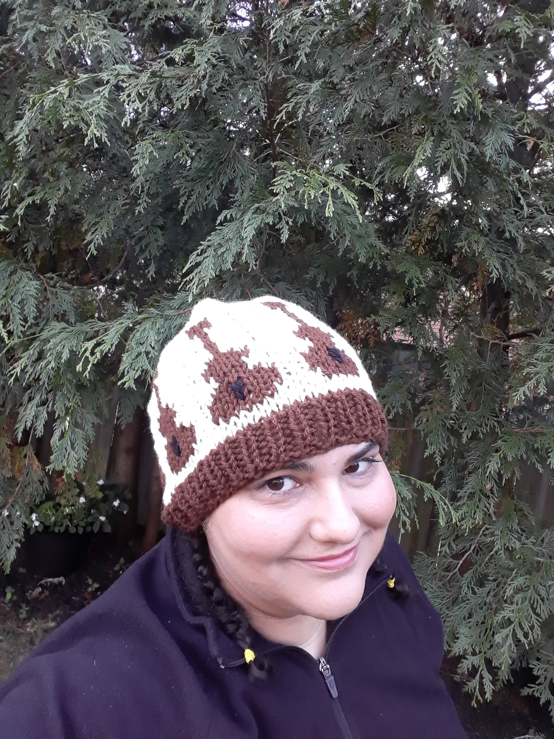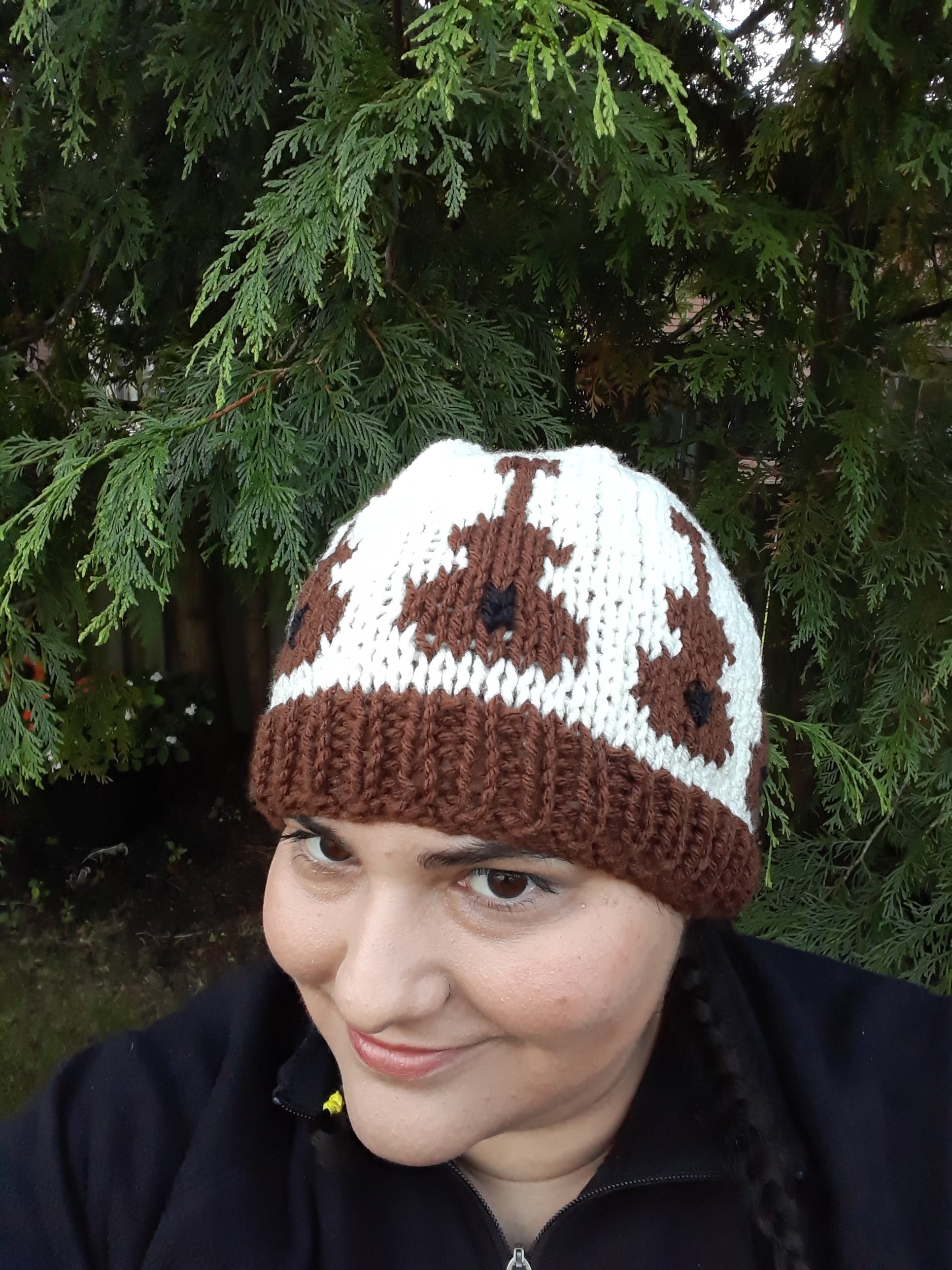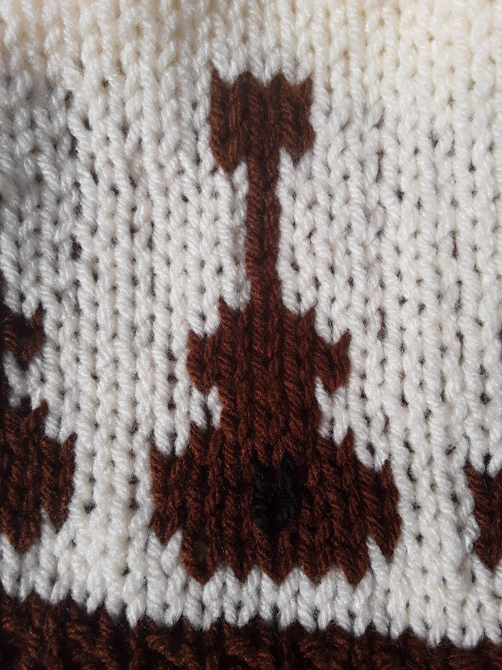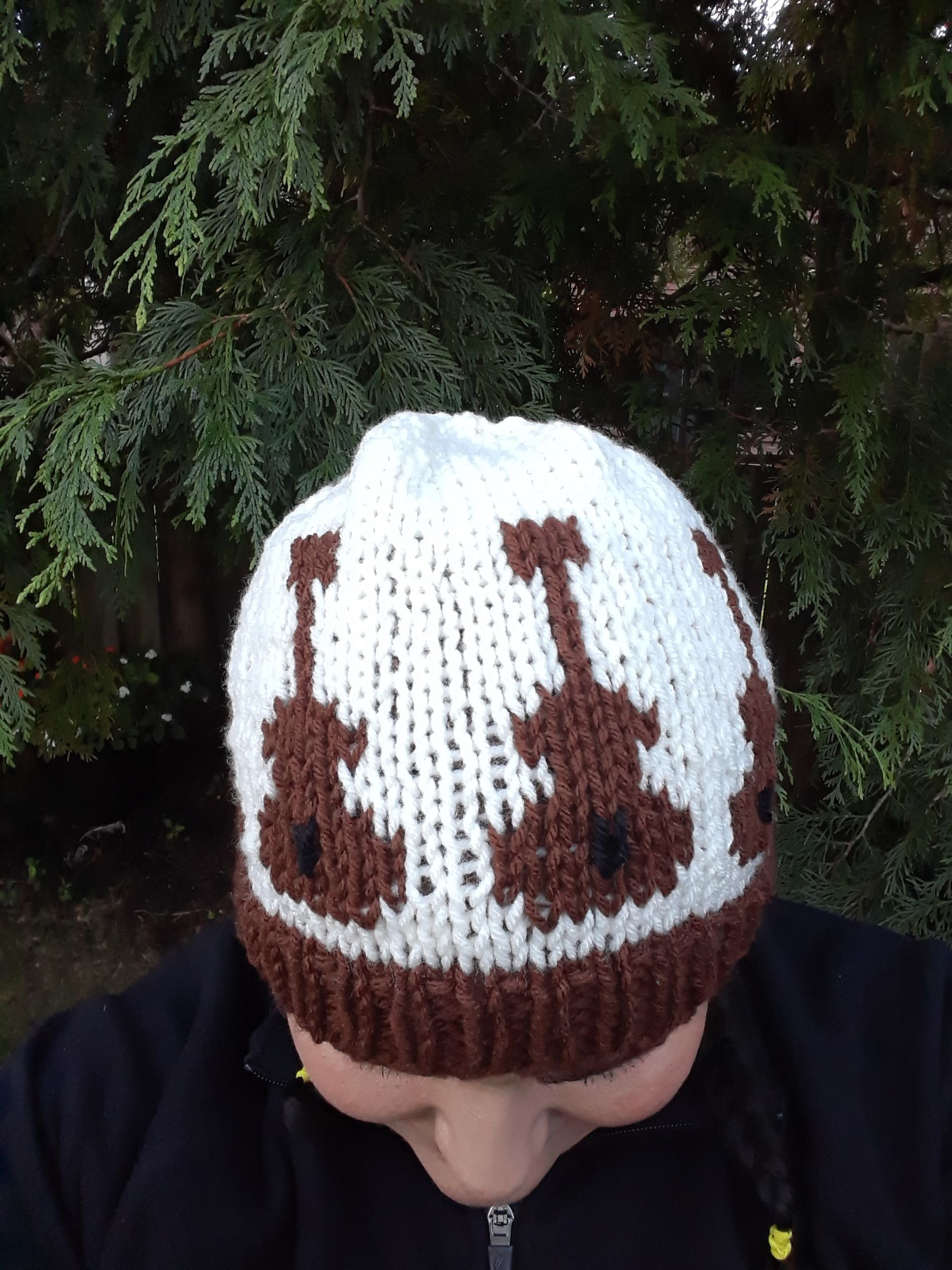The rich brown of the guitars pops from the soft cream background. This neutral-coloured hat should match with most people's wardrobe, while the guitar design makes it anything but plain.