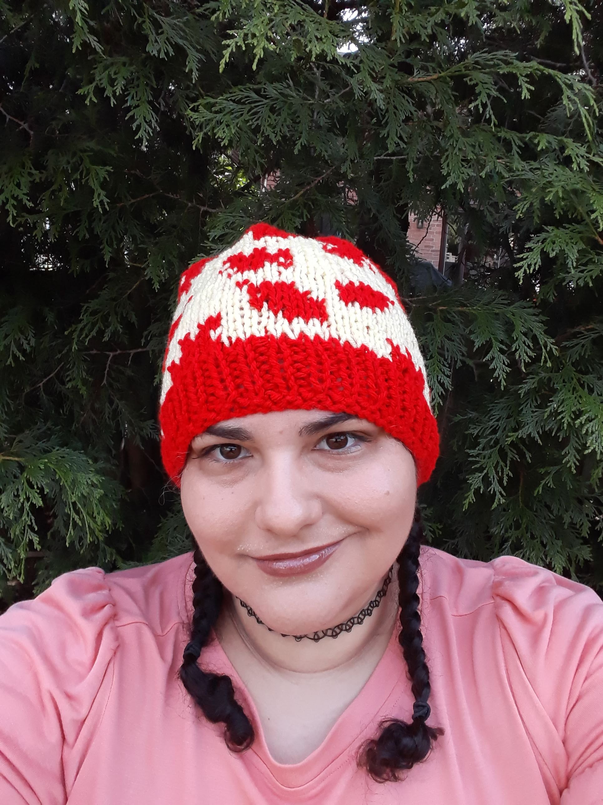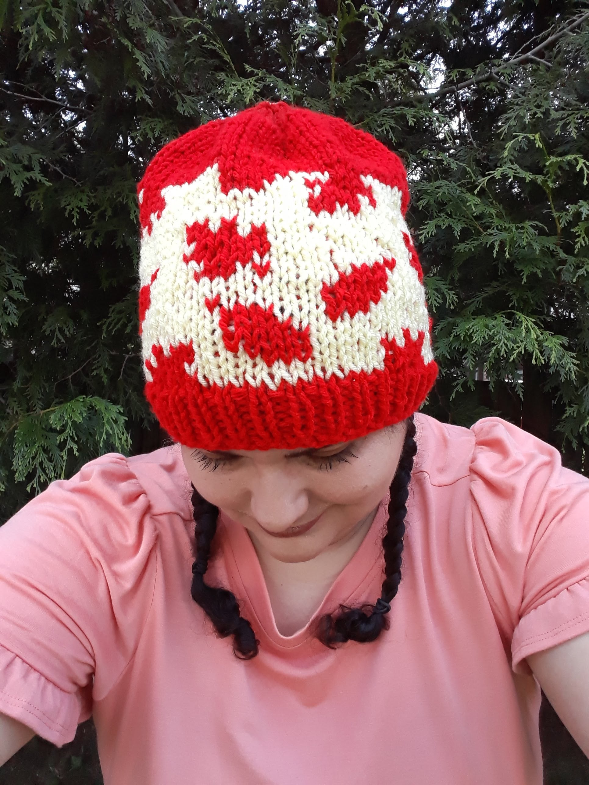 Handknit in Canada, 100% acrylic yarn. Can go in the washing machine; air dry recommended. One size fits most adults.