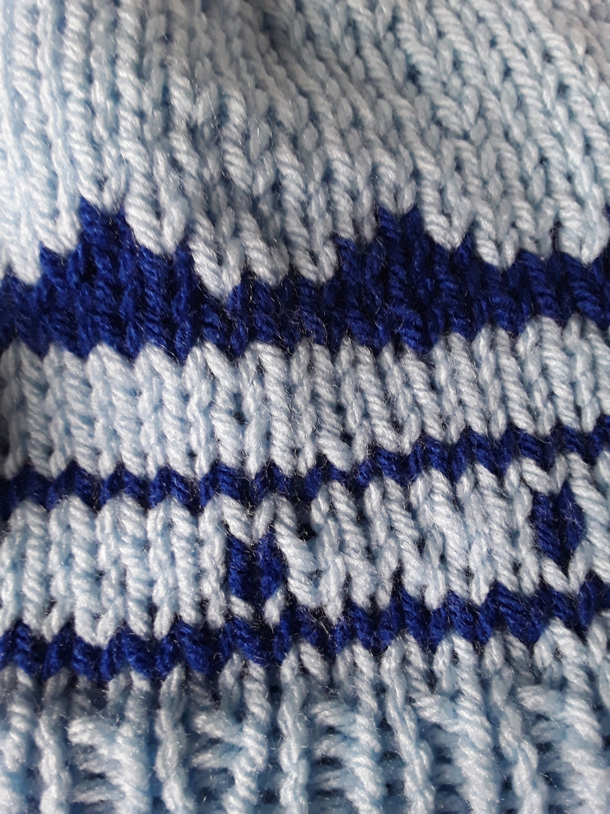 Handknit in Canada, 100% acrylic yarn. Can go in the washing machine; air dry recommended. One size fits most adults.
