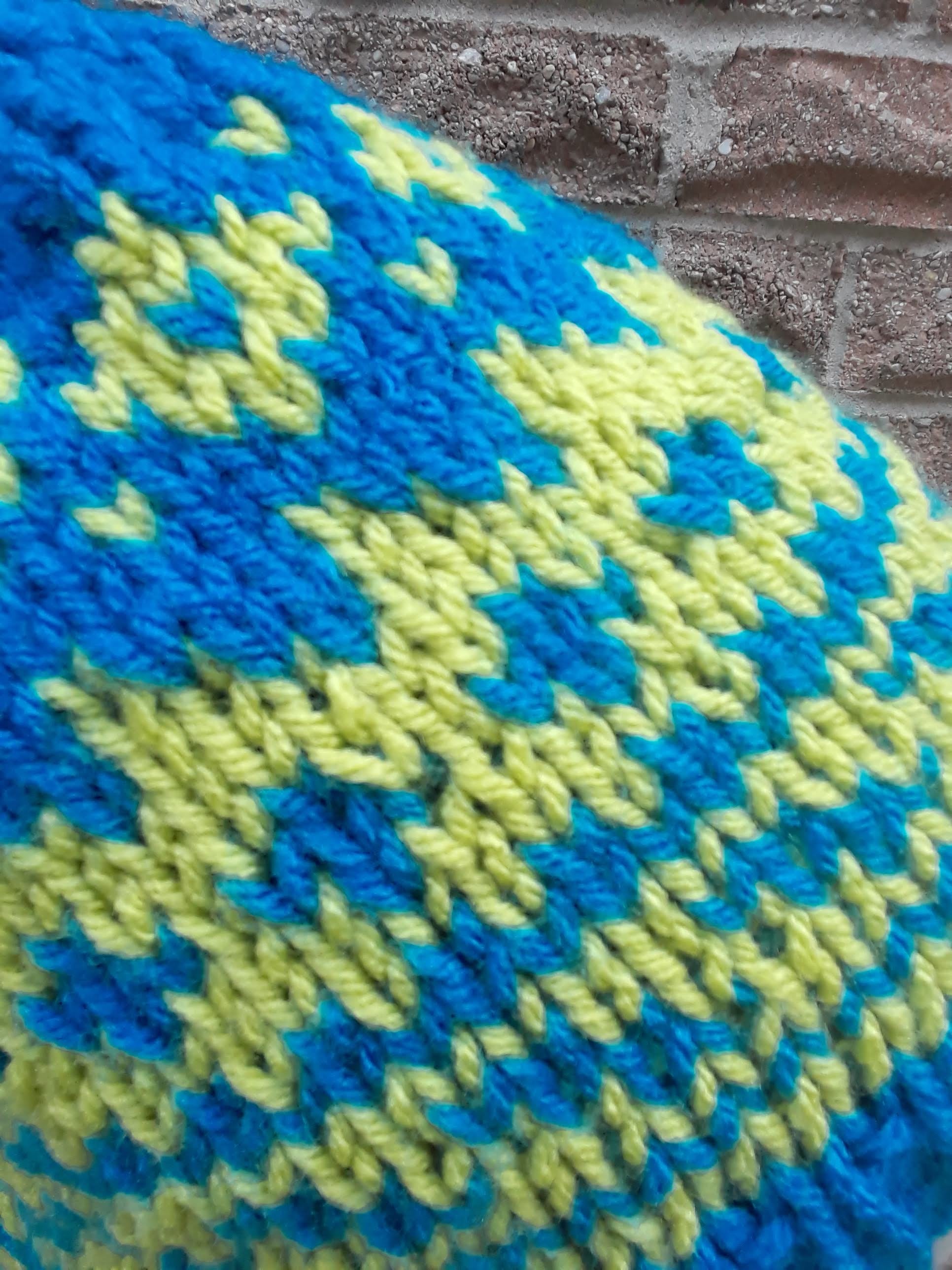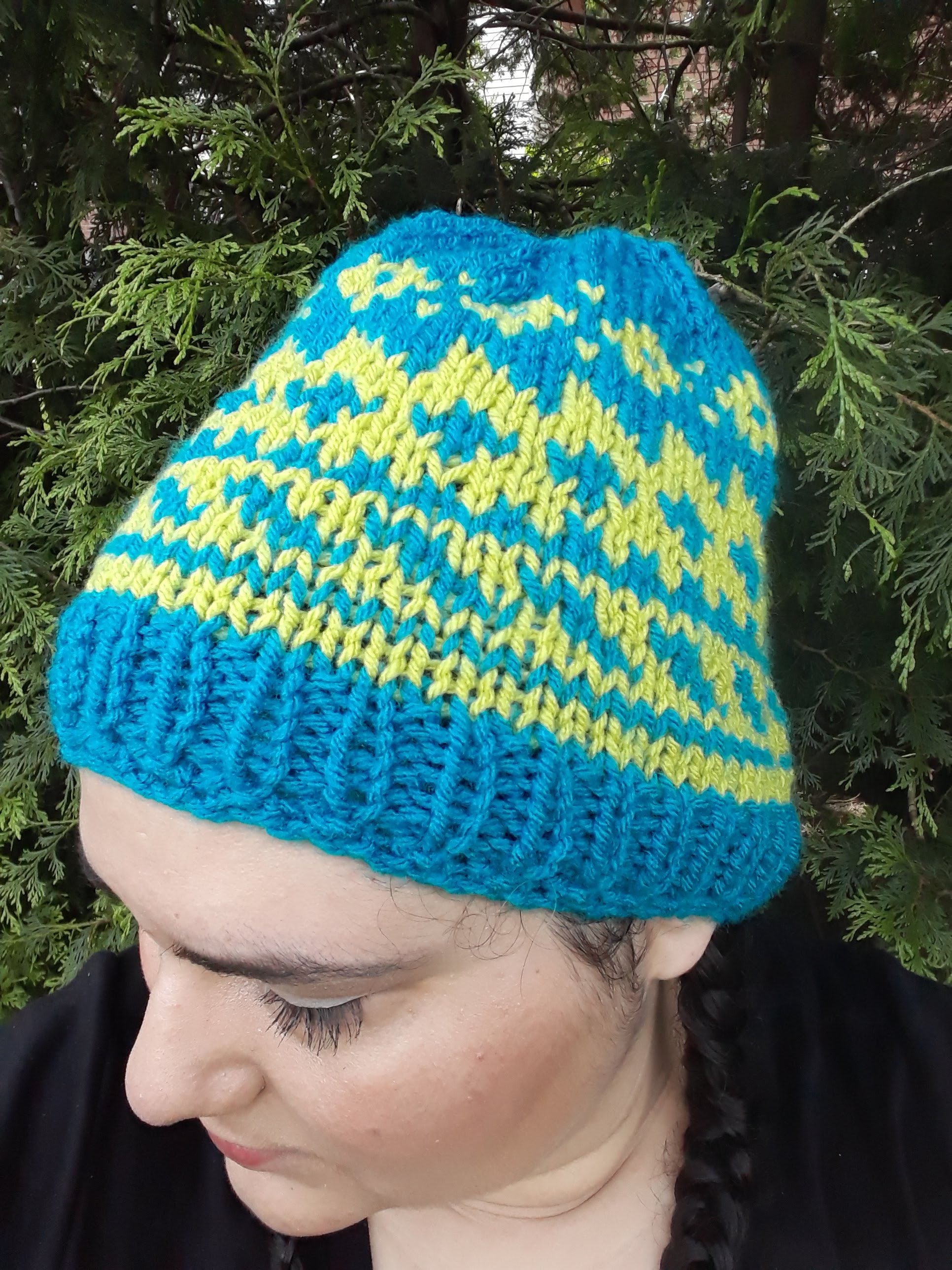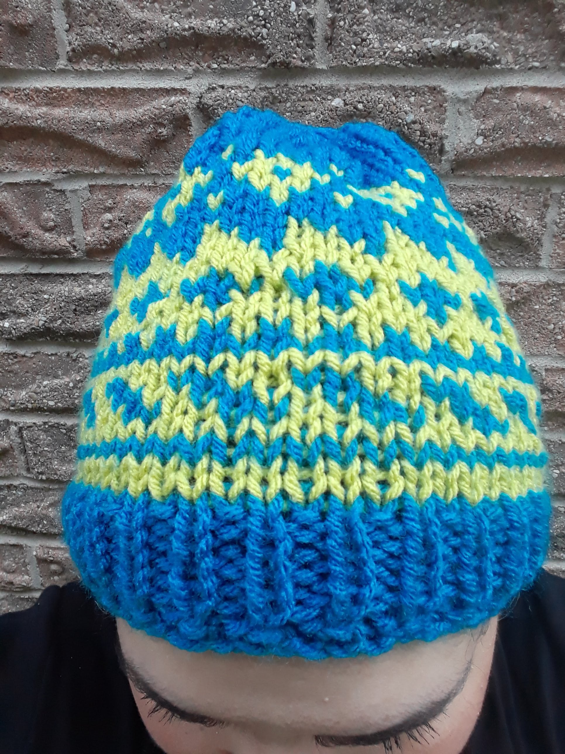 This handmade hat adds a pop of bright fun colour to any outfit. Repeating patterns of aqua blue and lime green decorate this hat in chunky geometric style. It would make a great gift, but it's so cool you might want to keep it for yourself.