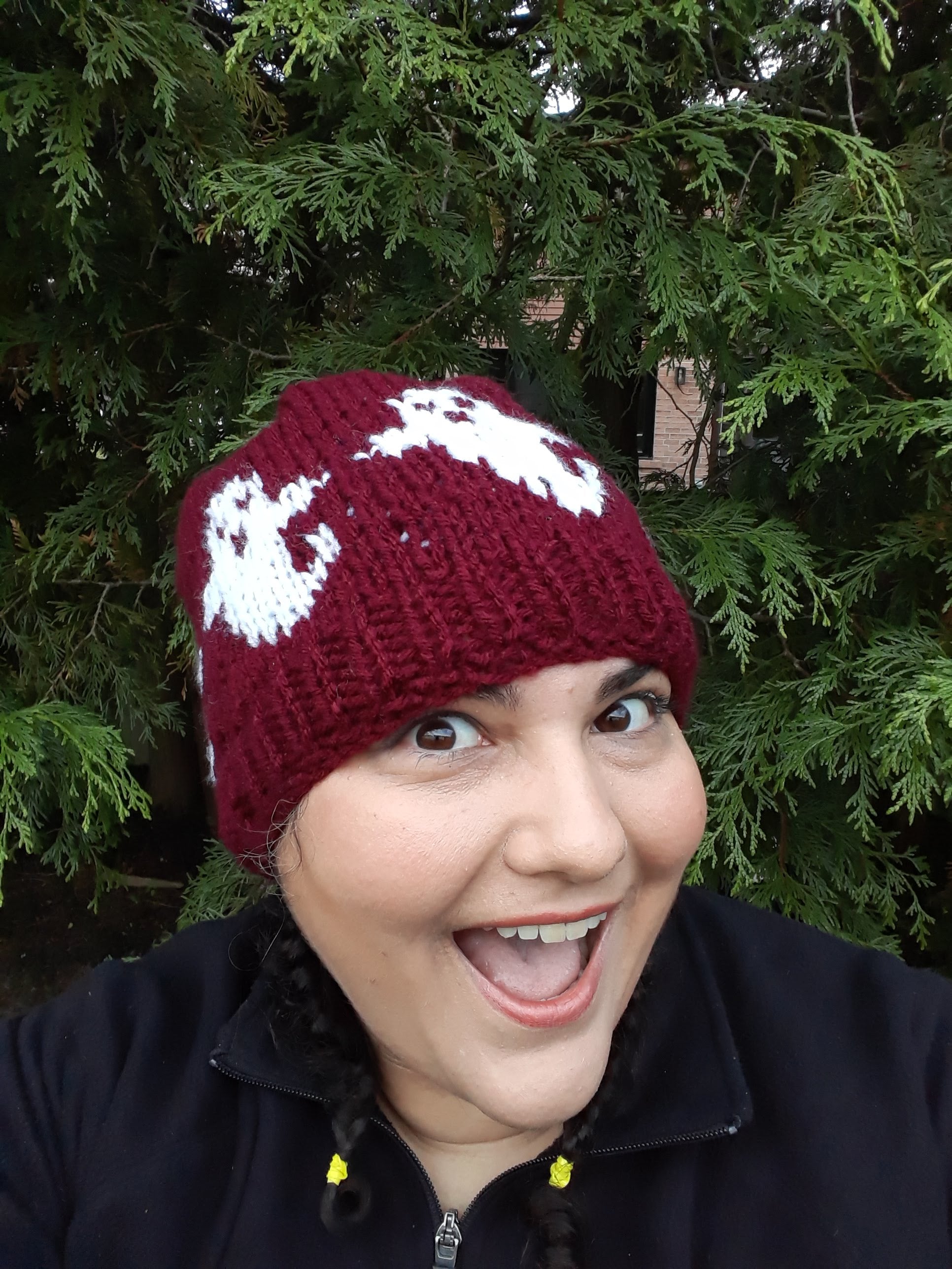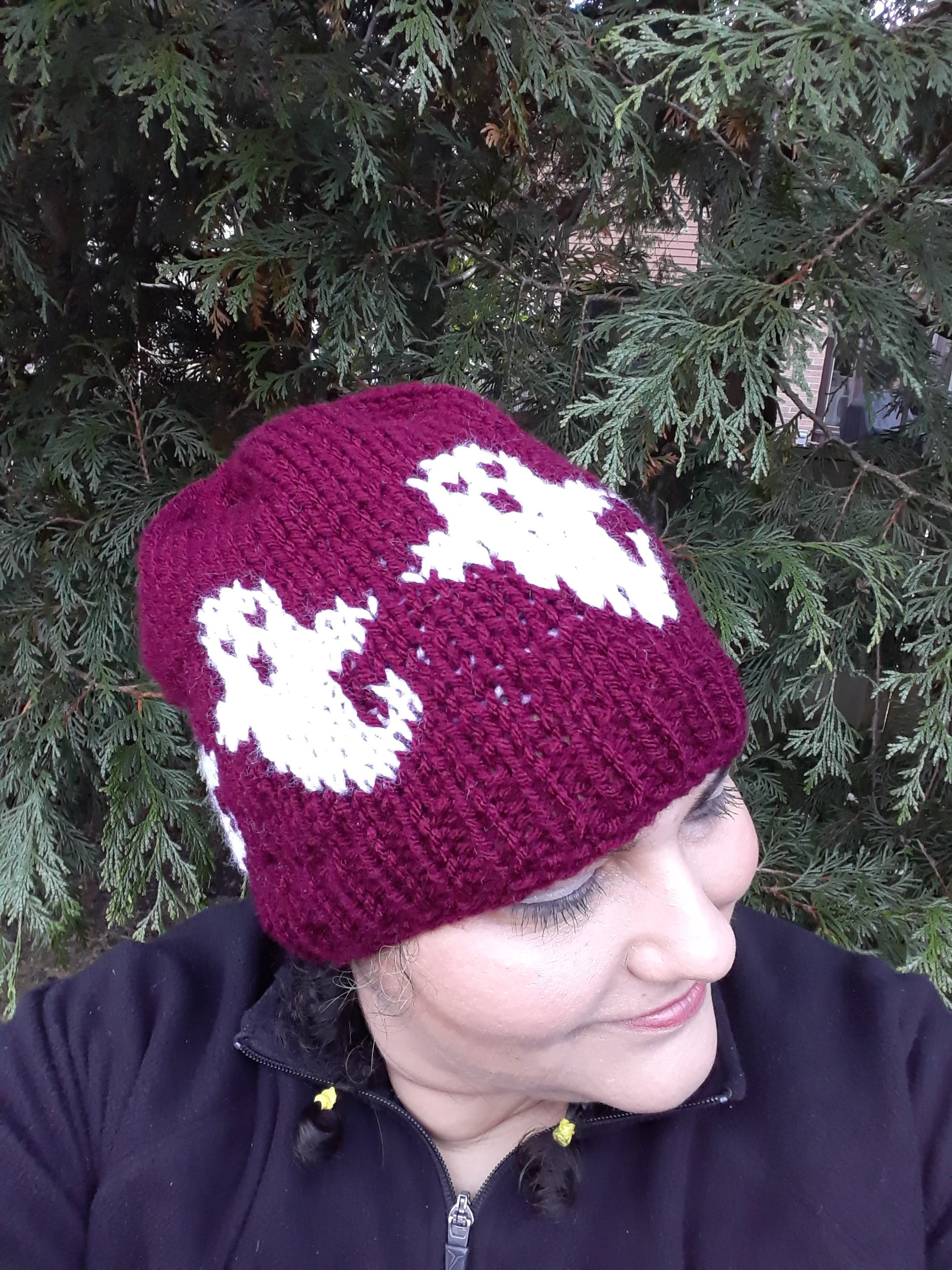 Handknit in Canada, 100% acrylic yarn. Can go in the washing machine; air dry recommended. One size fits most adults.