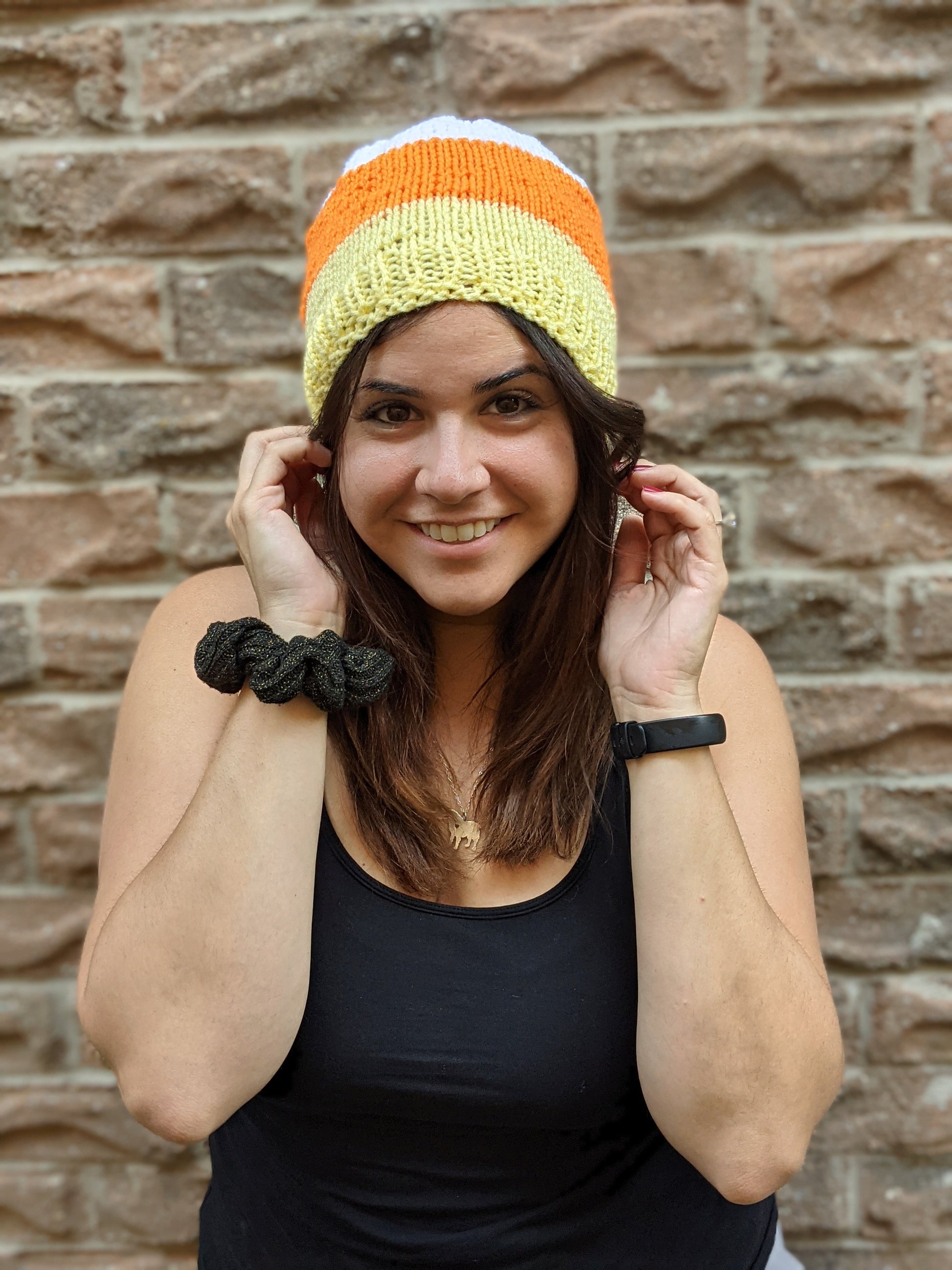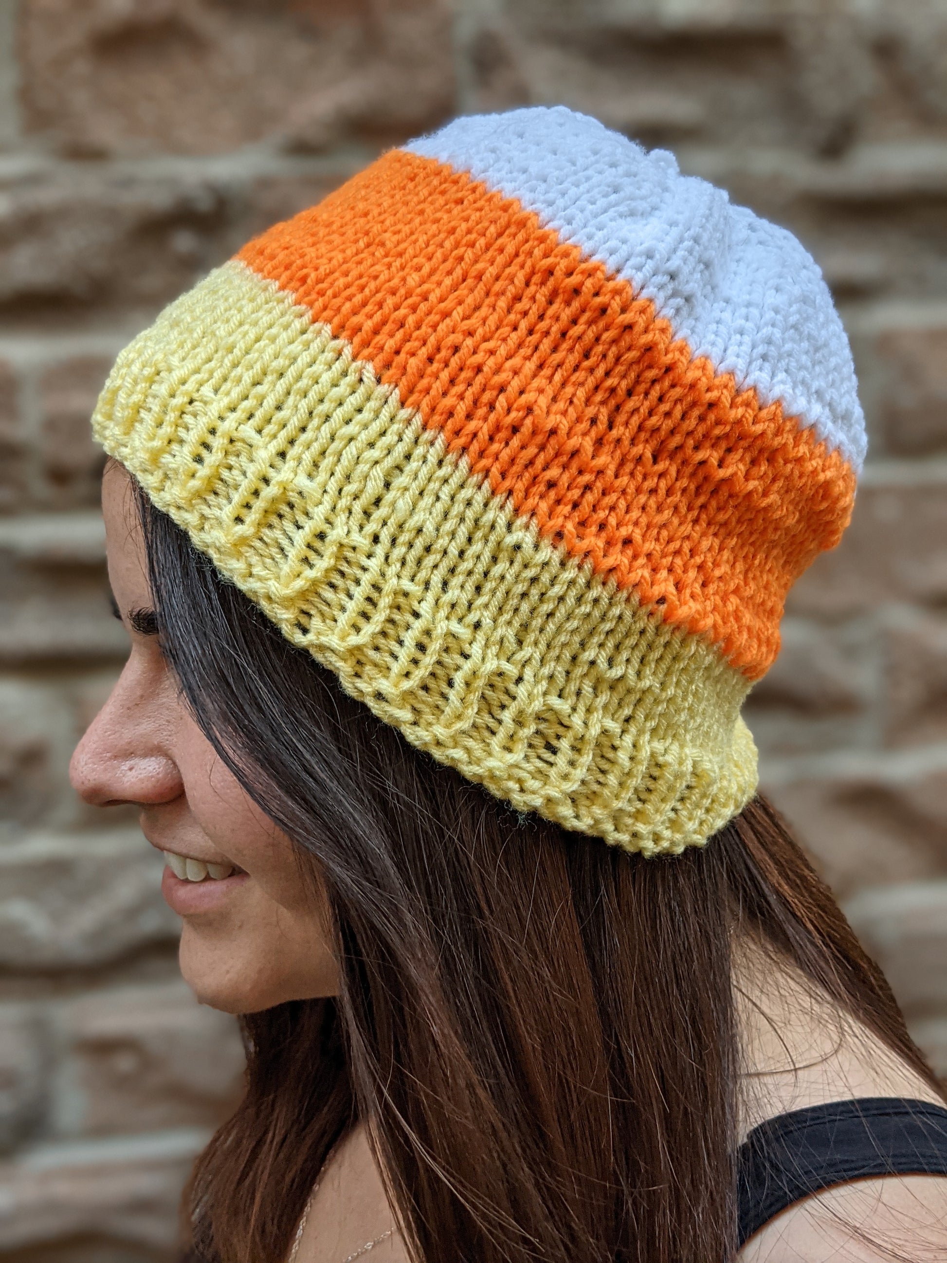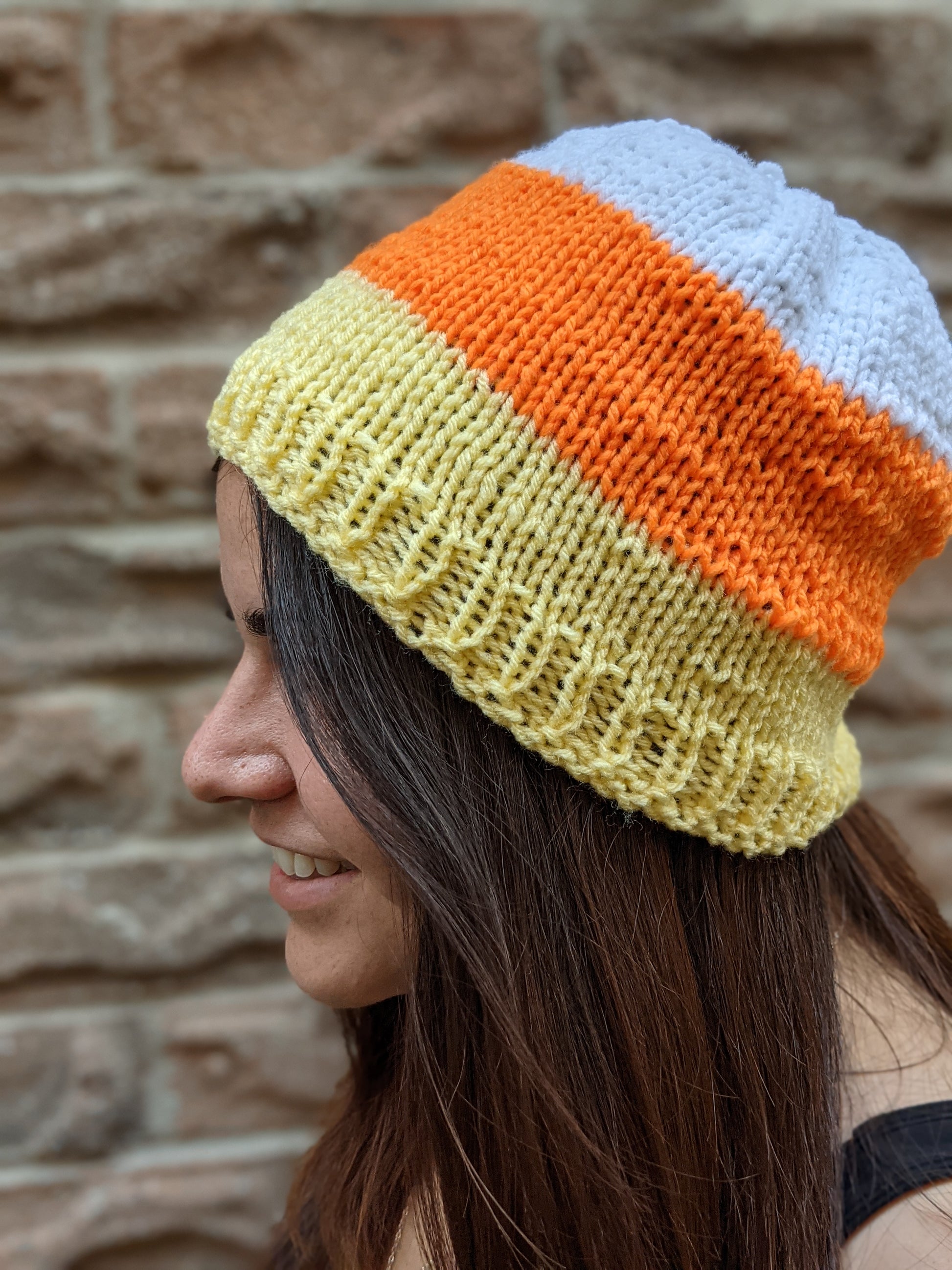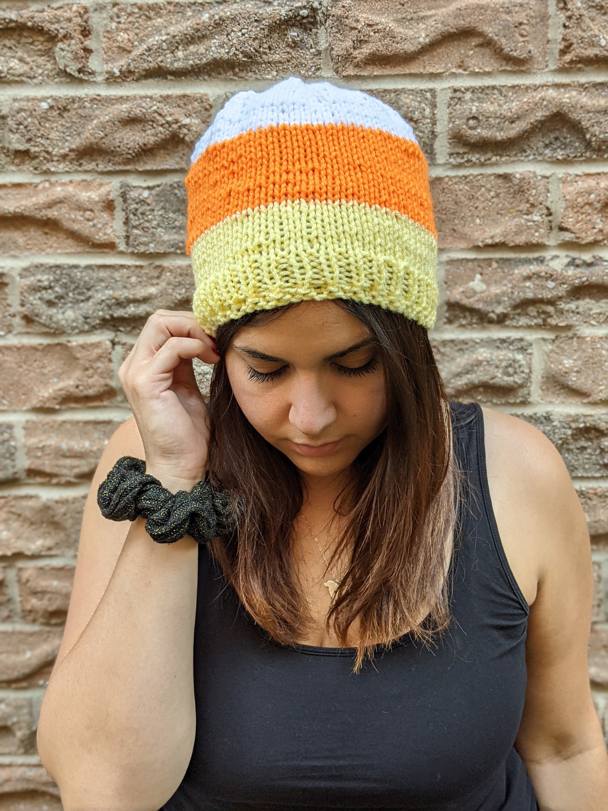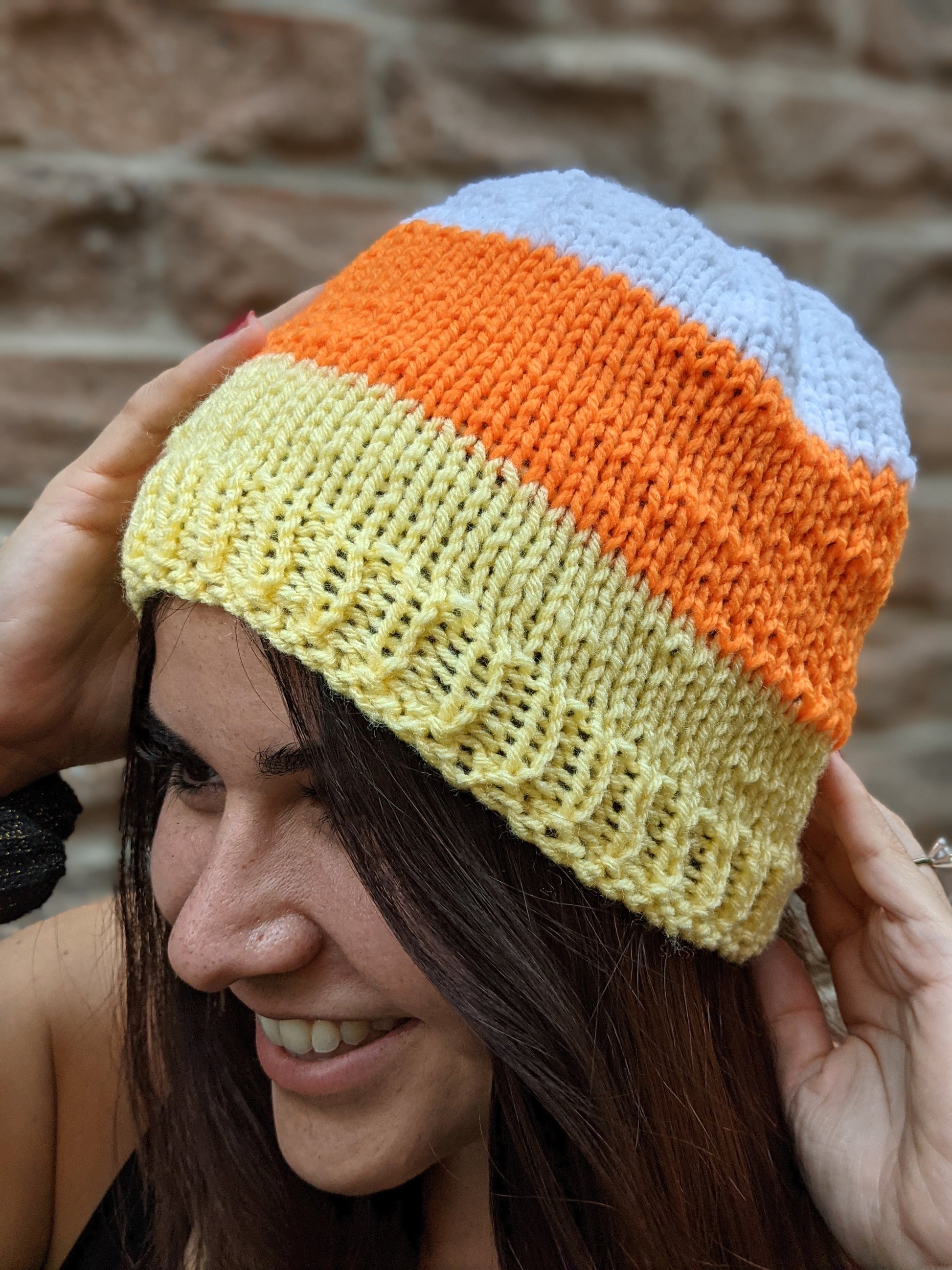 Perfect for spooky season and all year long. Show the world your love for Halloween with this hauntingly cozy candy corn stripes hat.