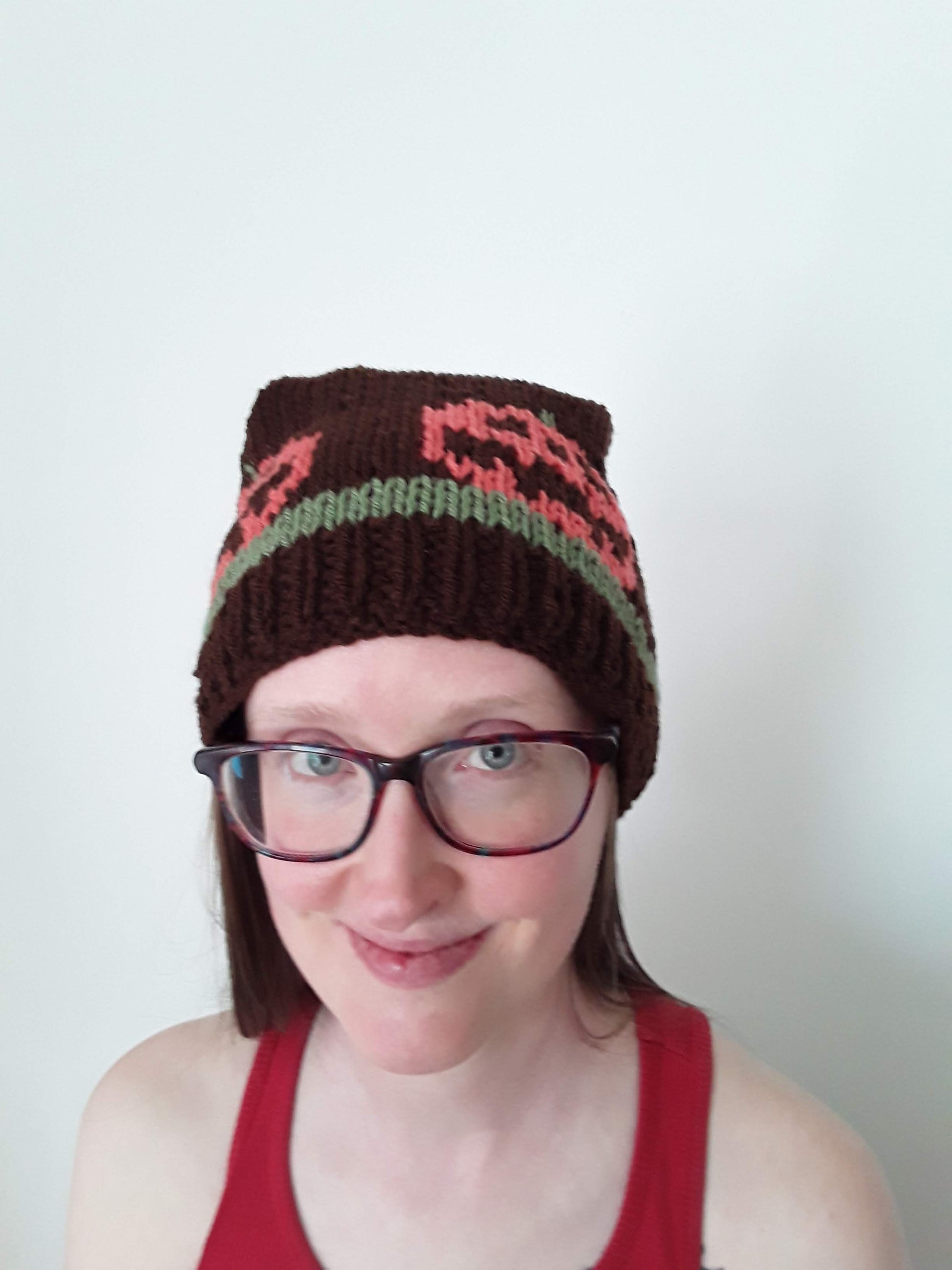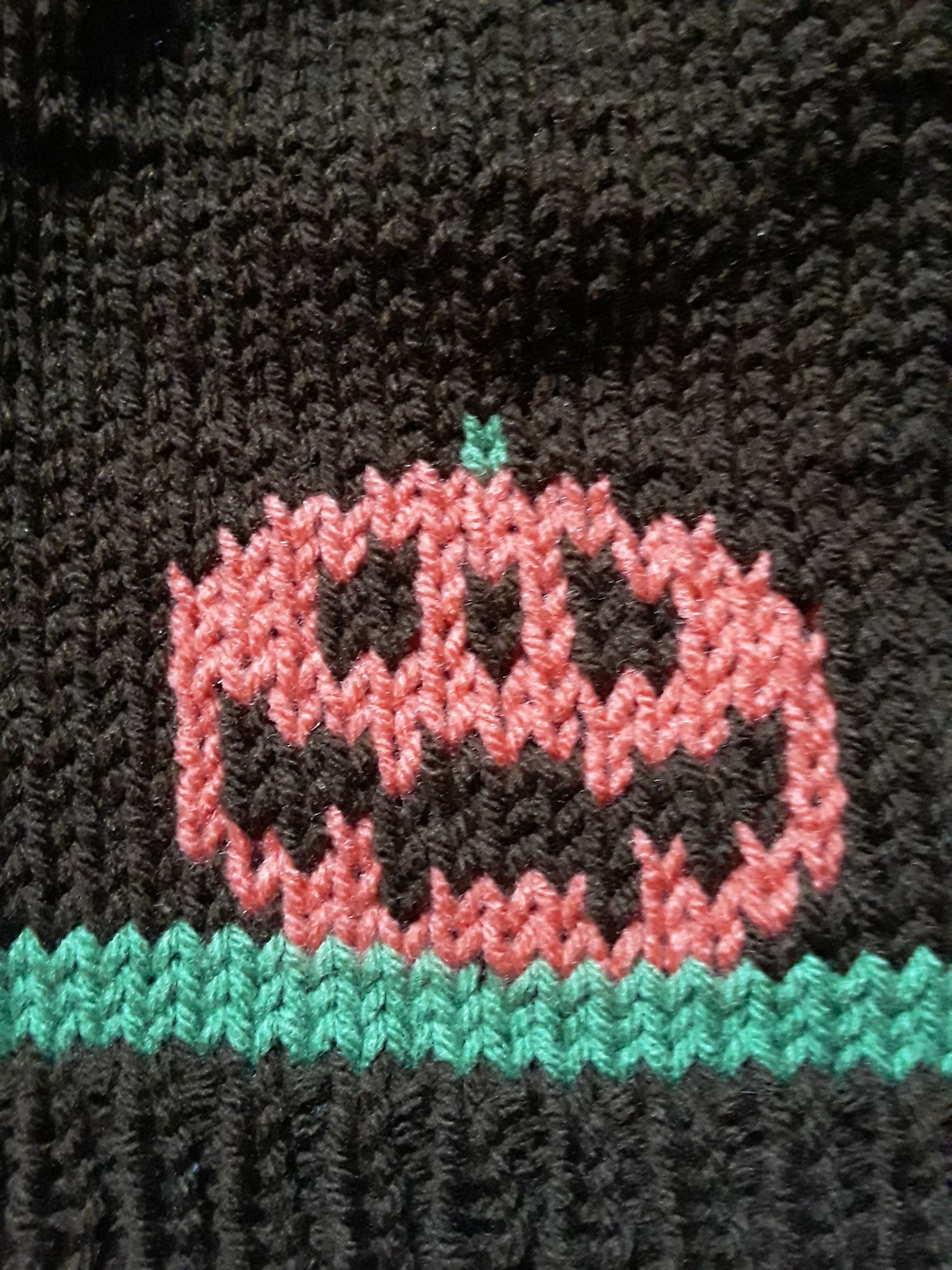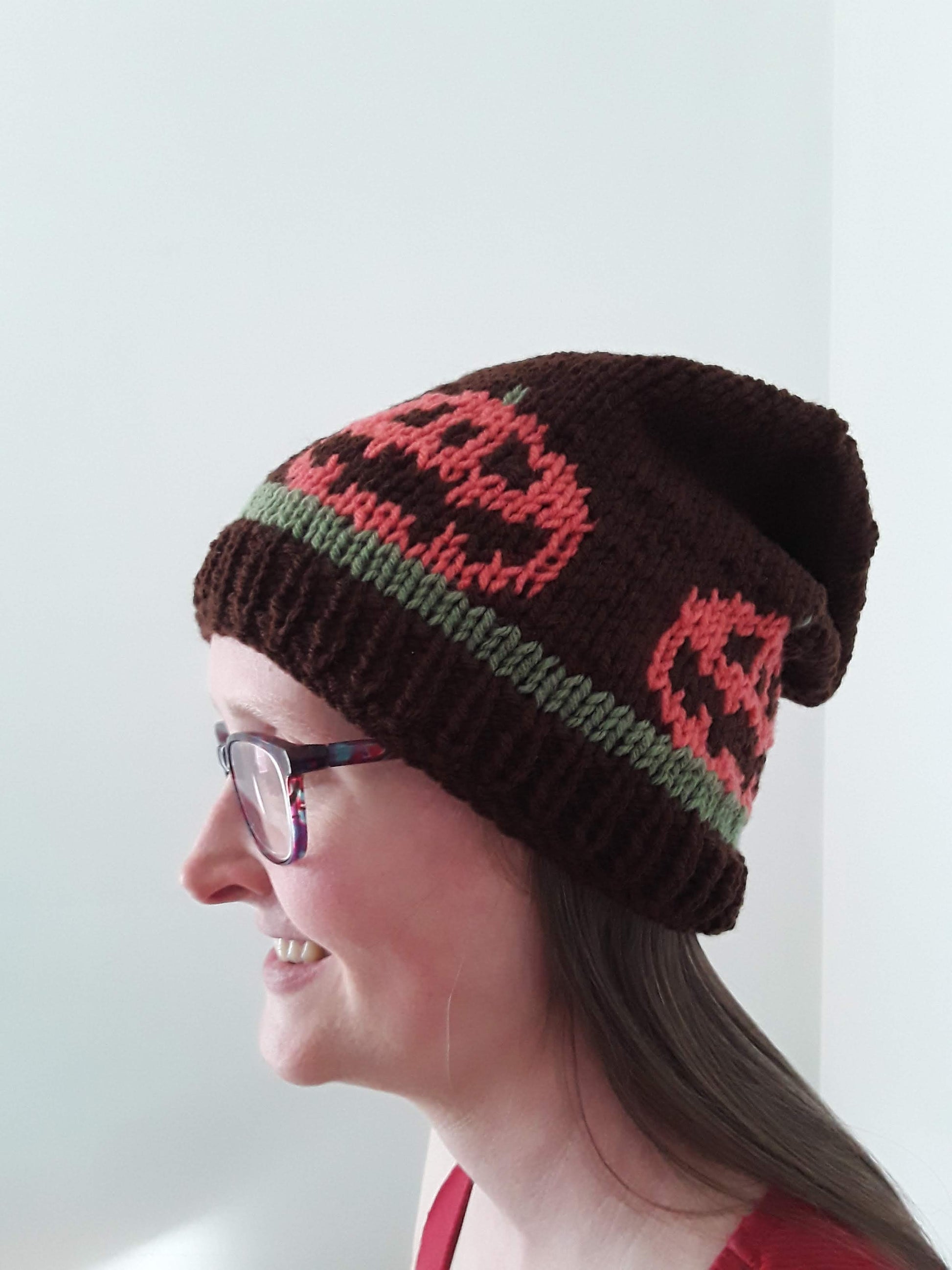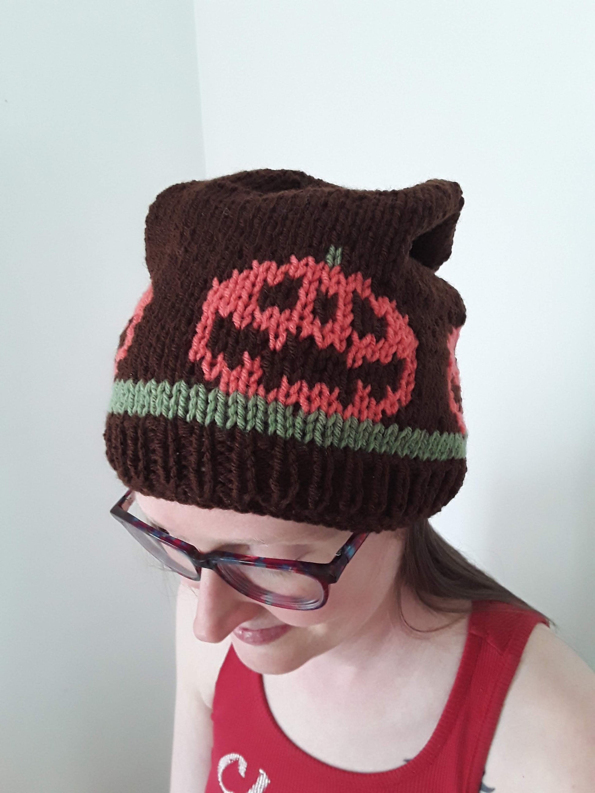 Handknit in Canada, 100% acrylic yarn. Can go in the washing machine; air dry recommended. One size fits most adults.