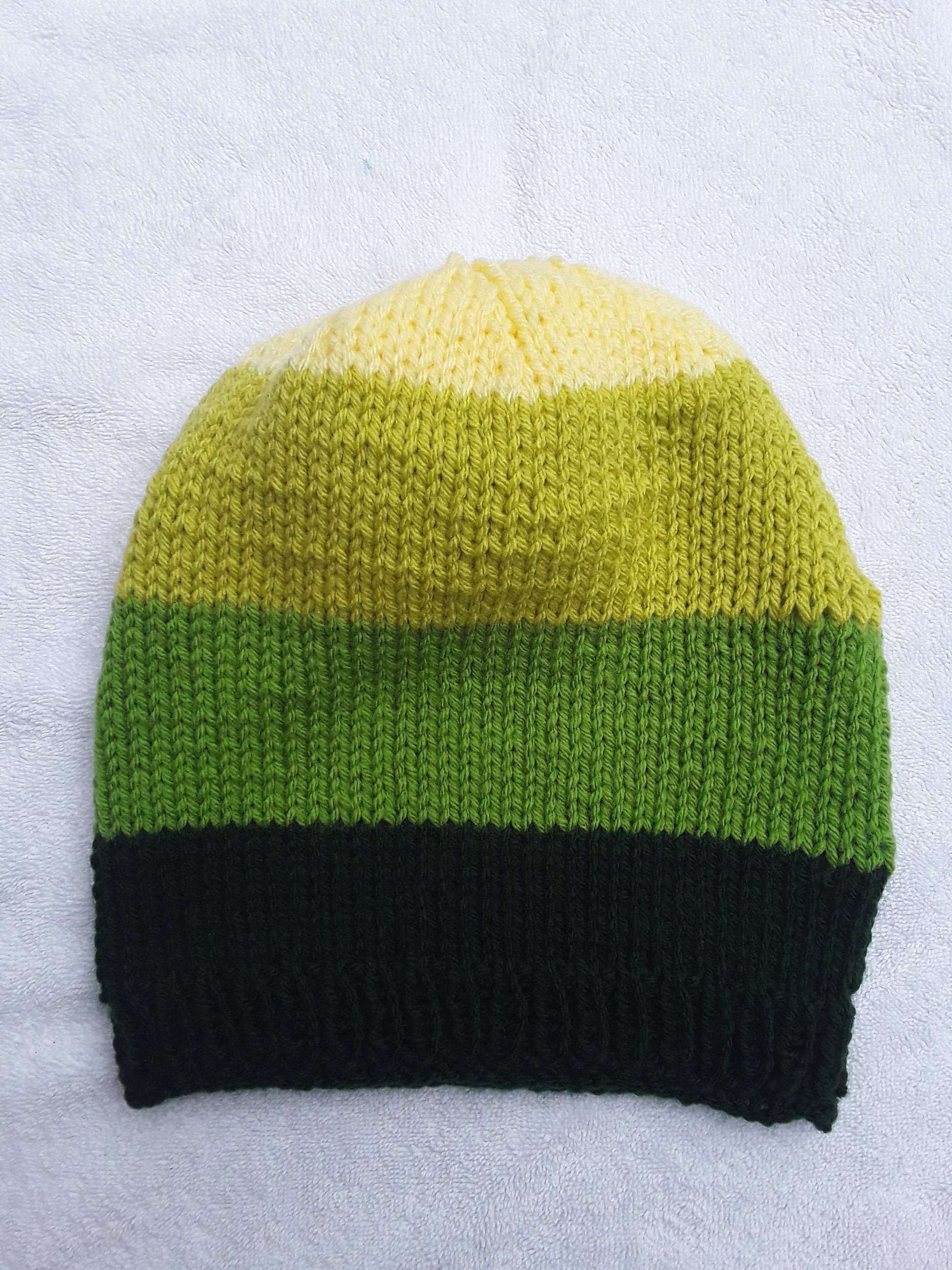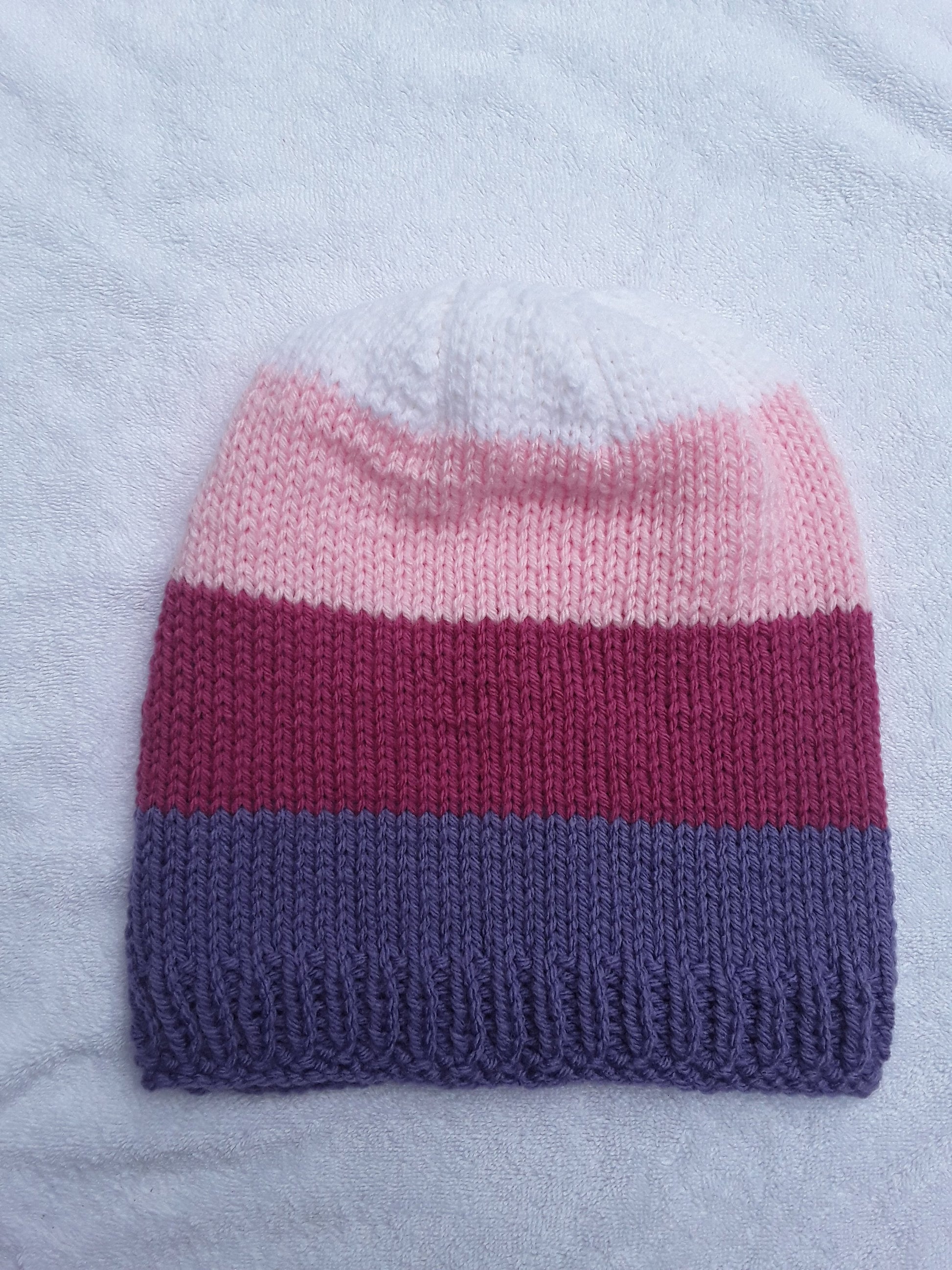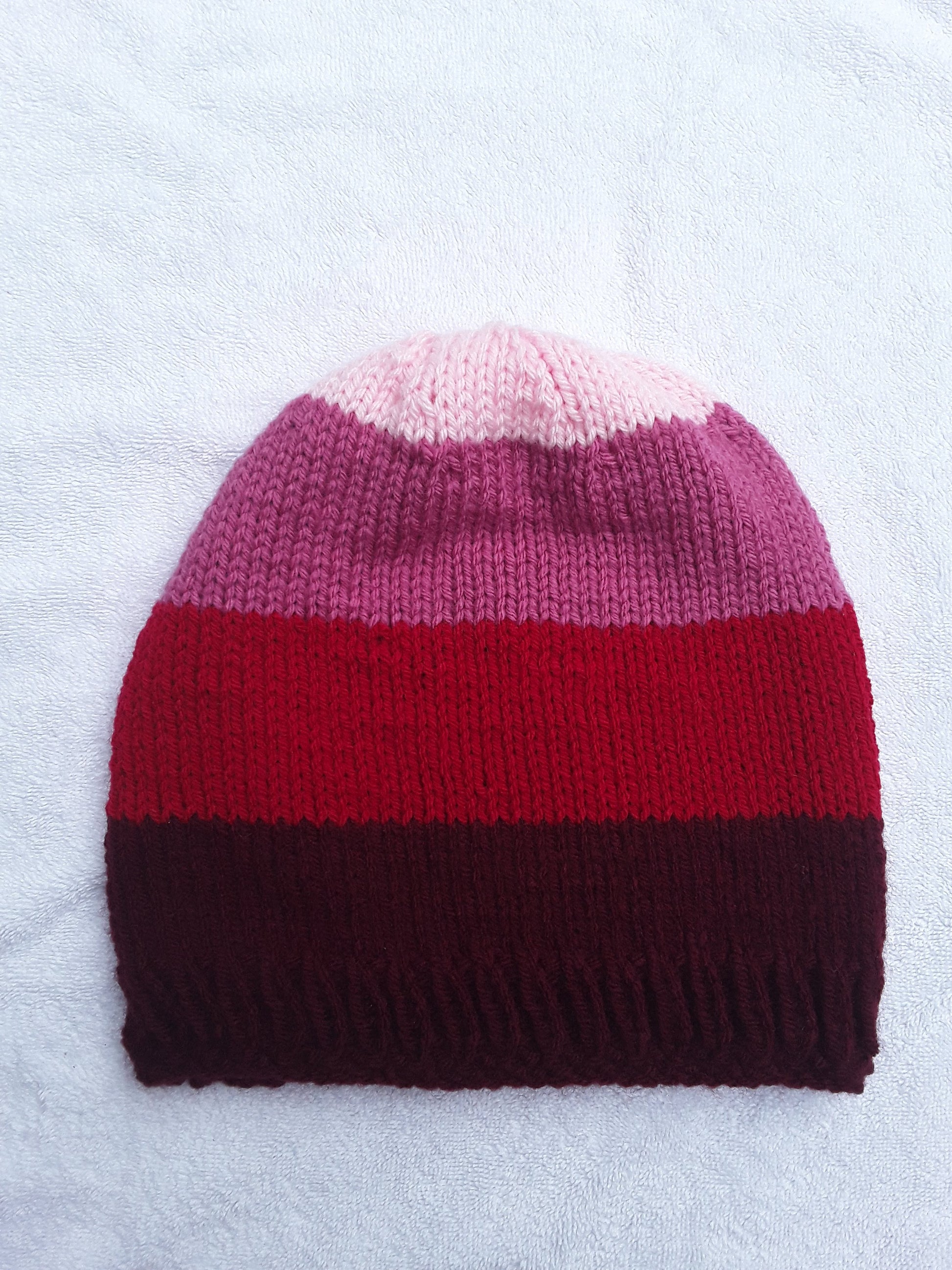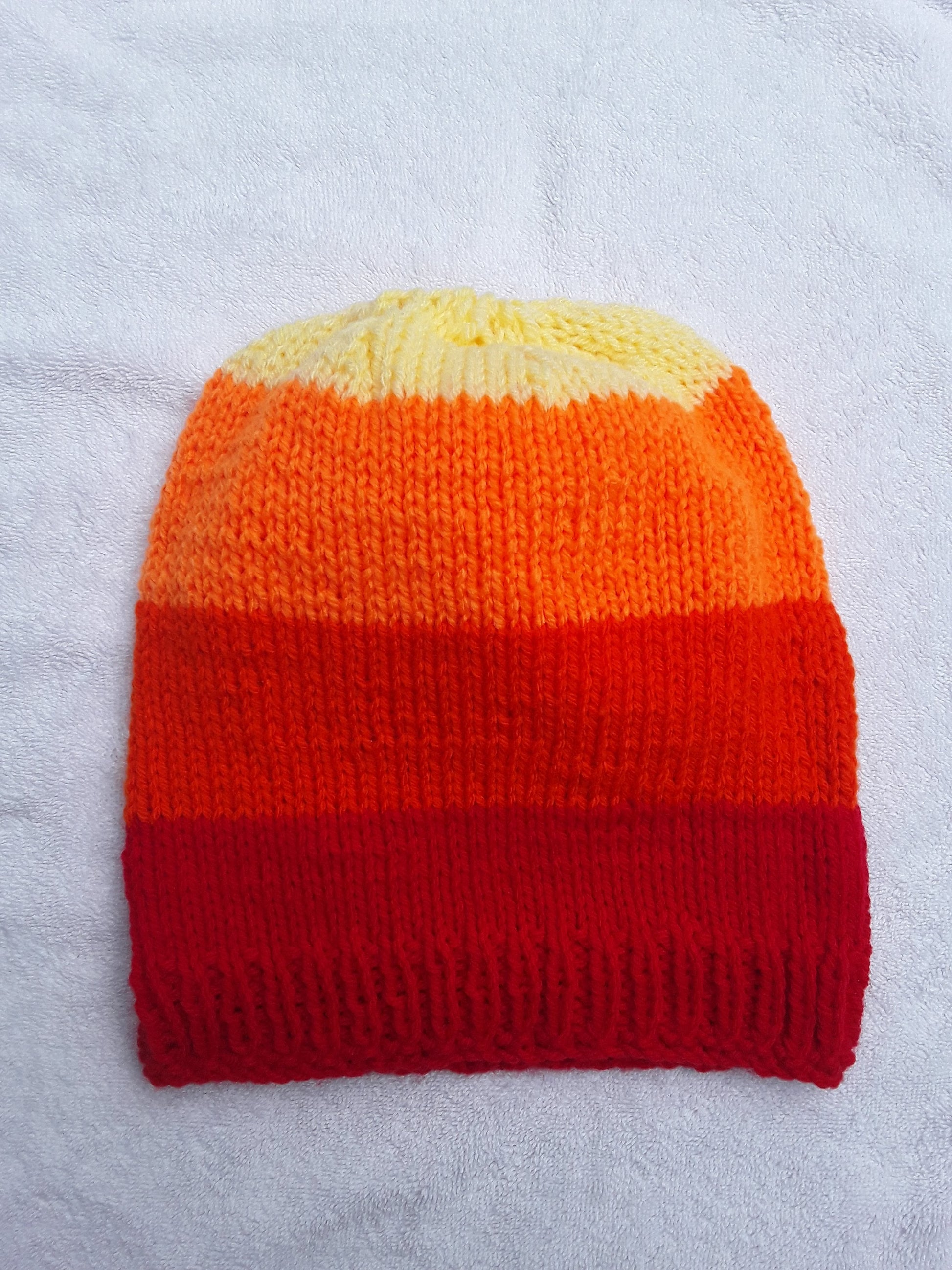 Handknit in Canada, 100% acrylic yarn. Can go in the washing machine; air dry recommended. One size fits most adults.