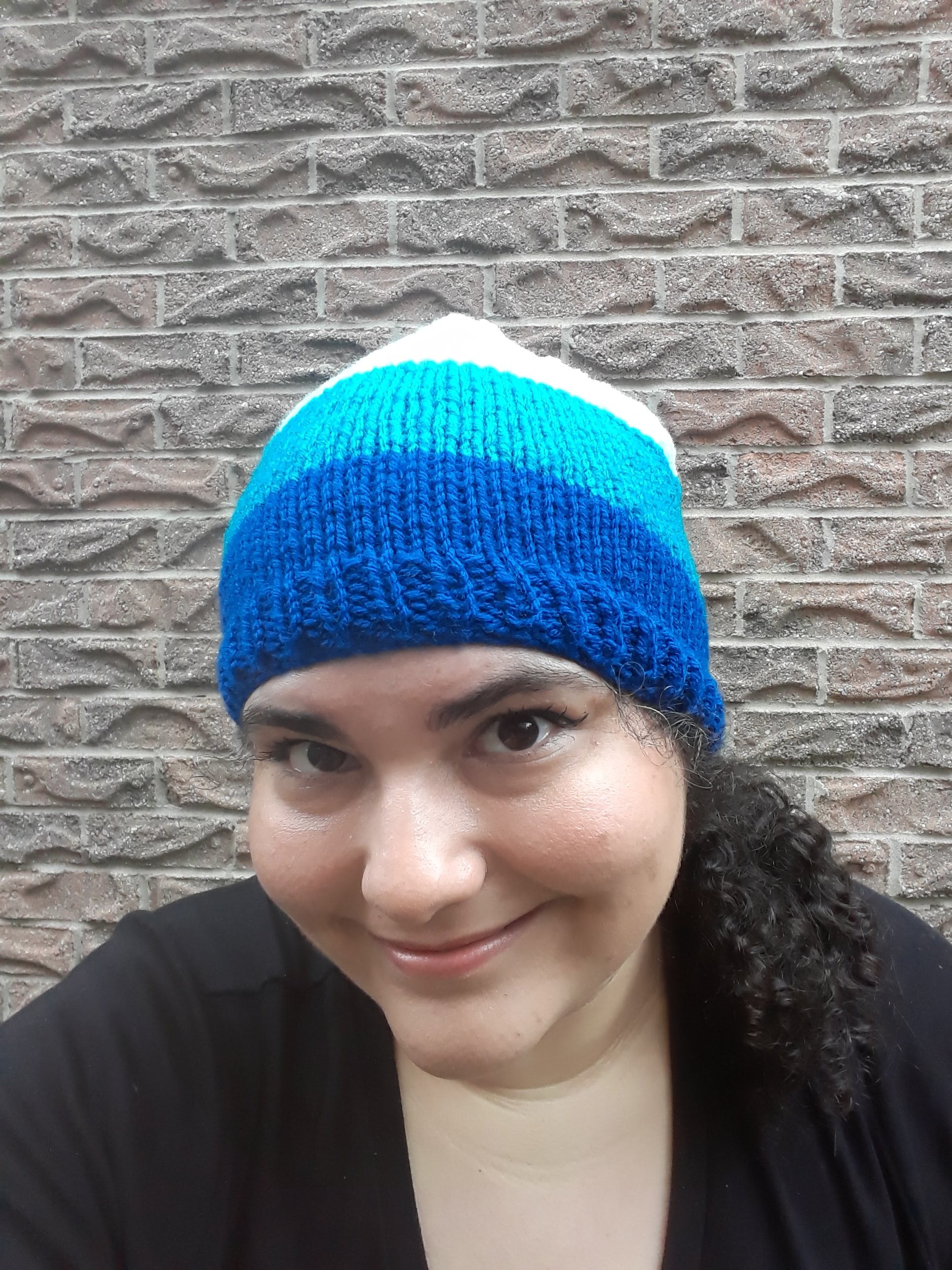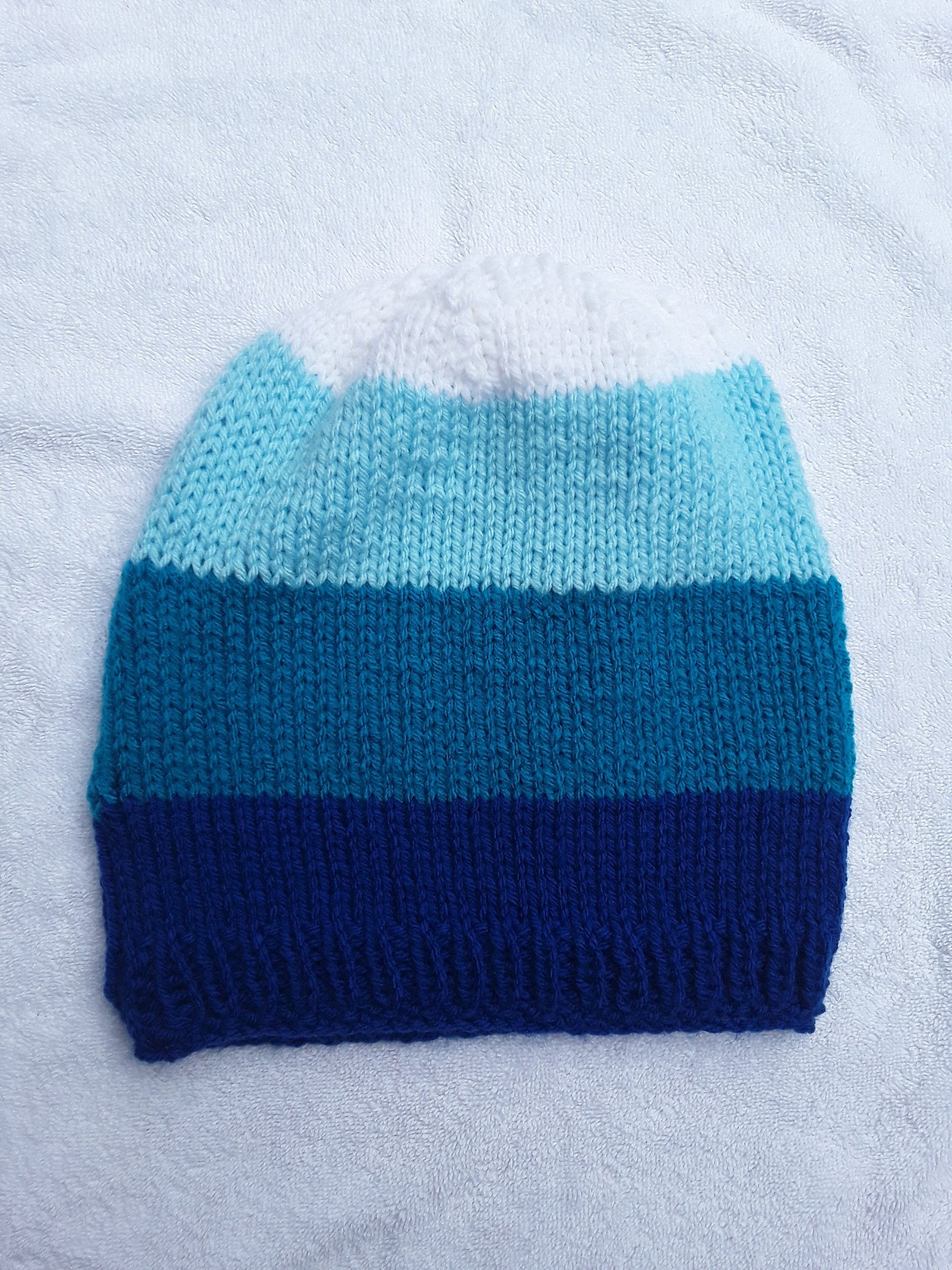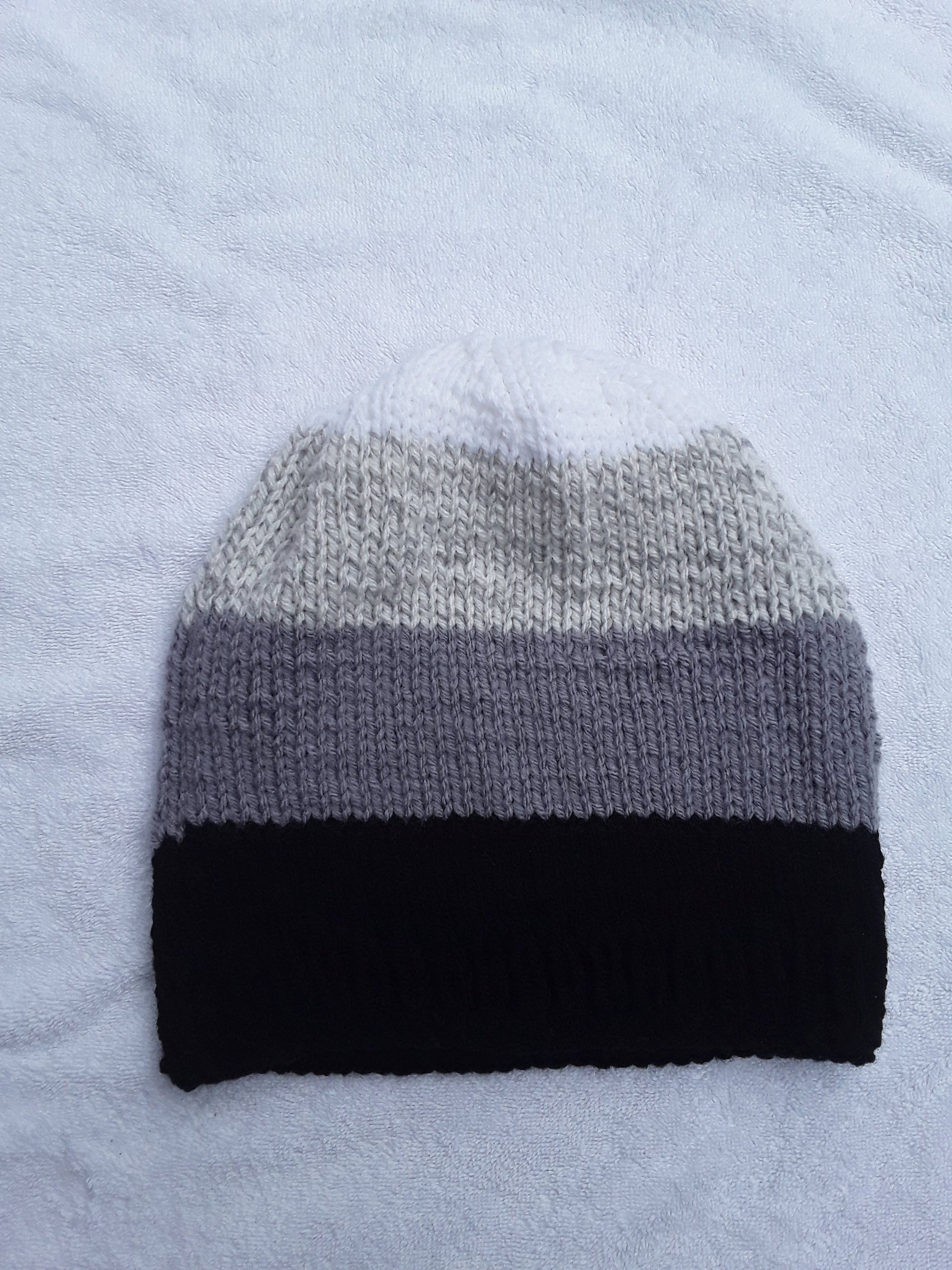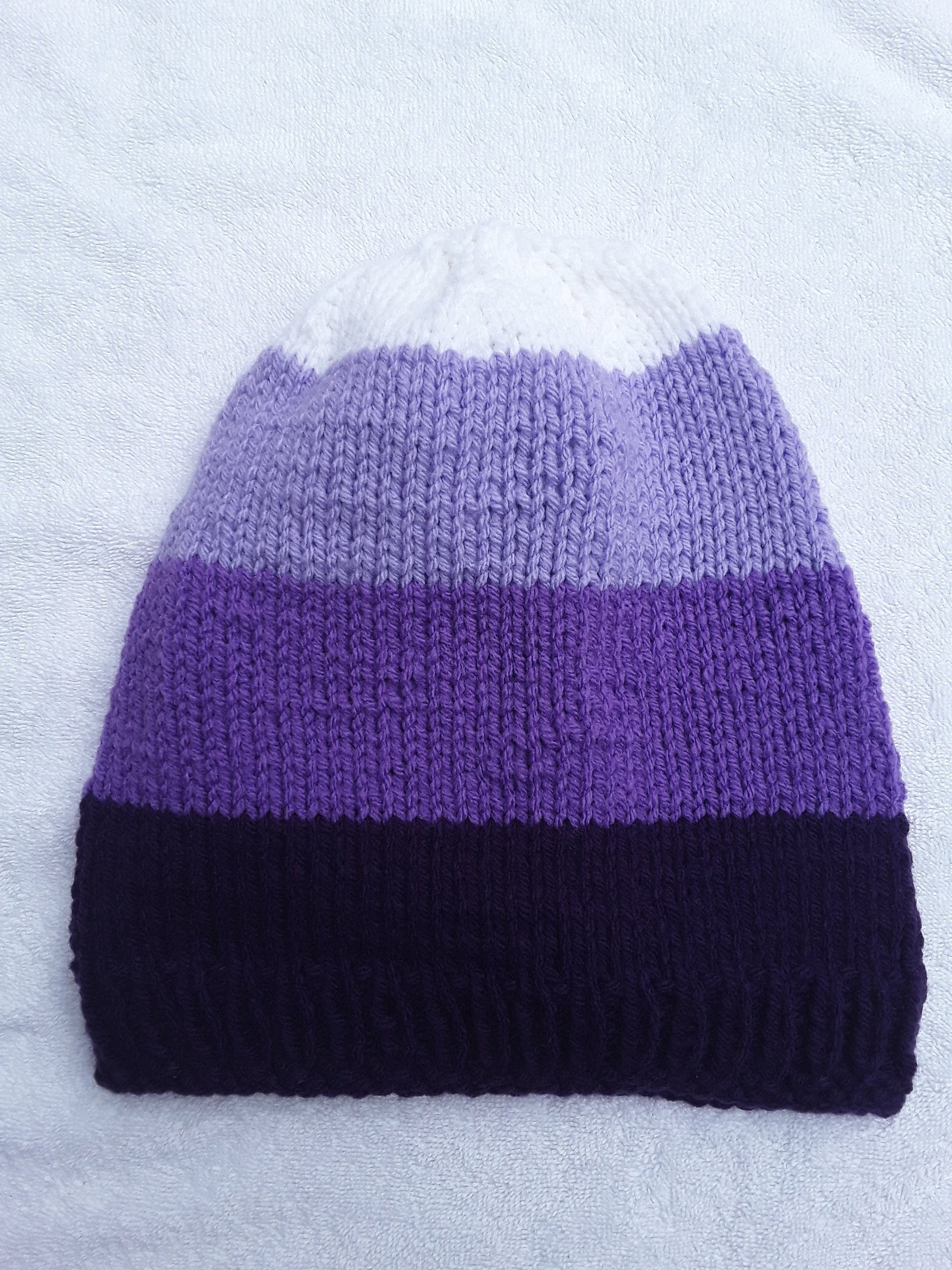 Handknit in Canada, 100% acrylic yarn. Can go in the washing machine; air dry recommended. One size fits most adults.