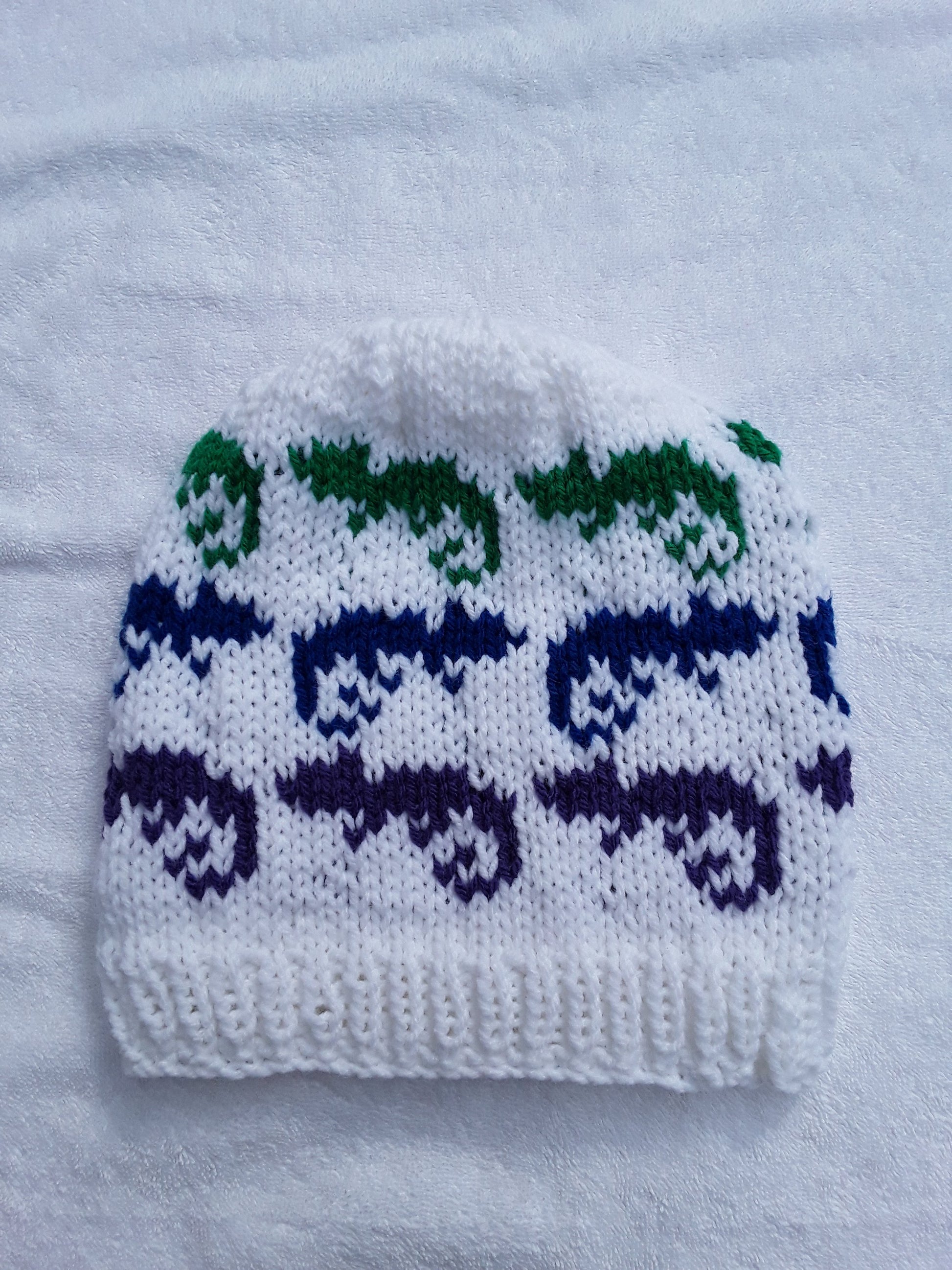 Handknit in Canada, 100% acrylic yarn. Can go in the washing machine; air dry recommended. One size fits most adults.