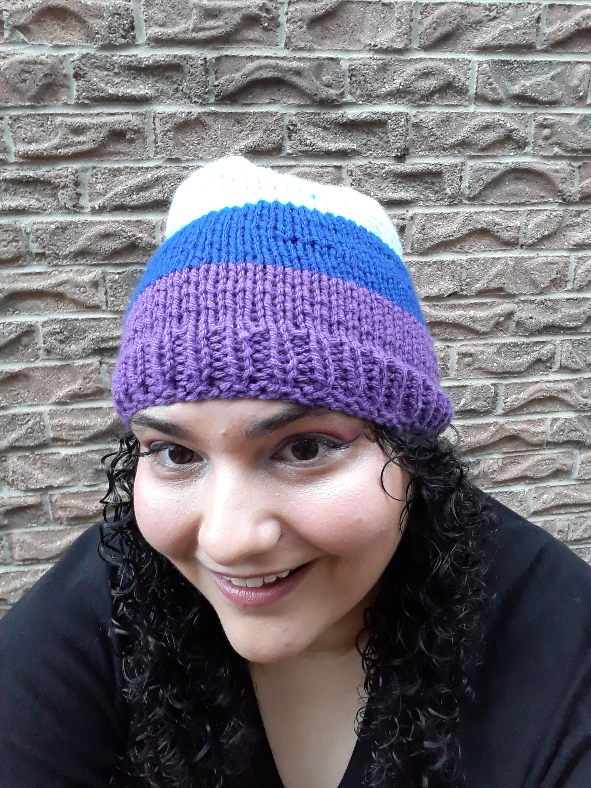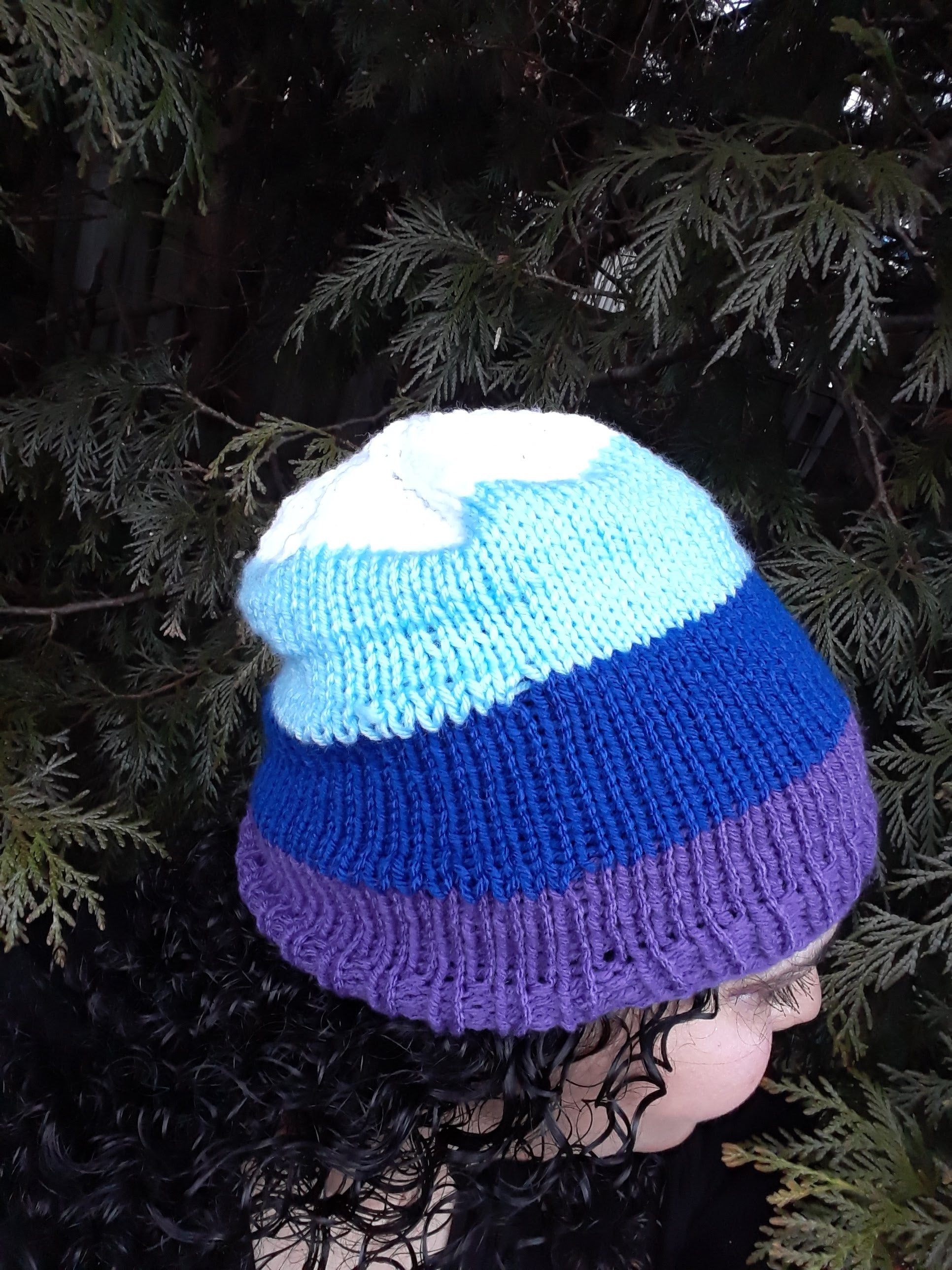 This handmade hat is striped in cool colours to look striking all year long. This colour combo is inspired by winter - icy skies and fresh snow.