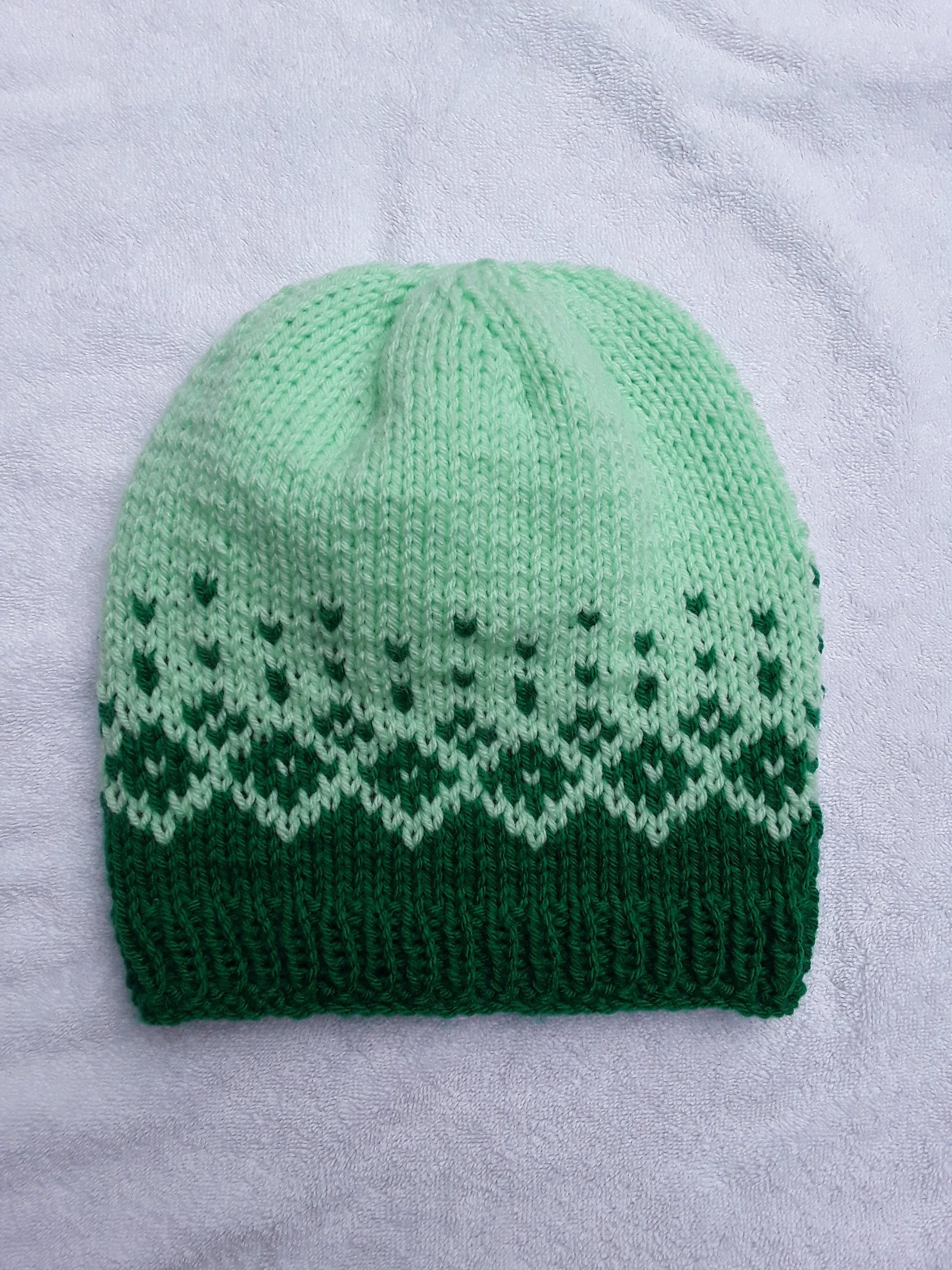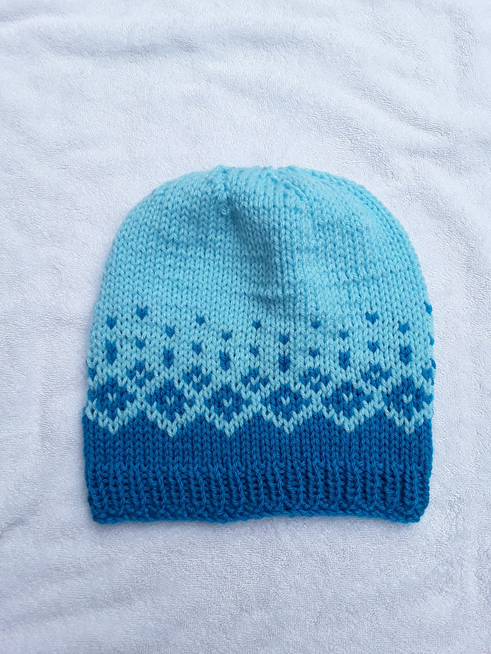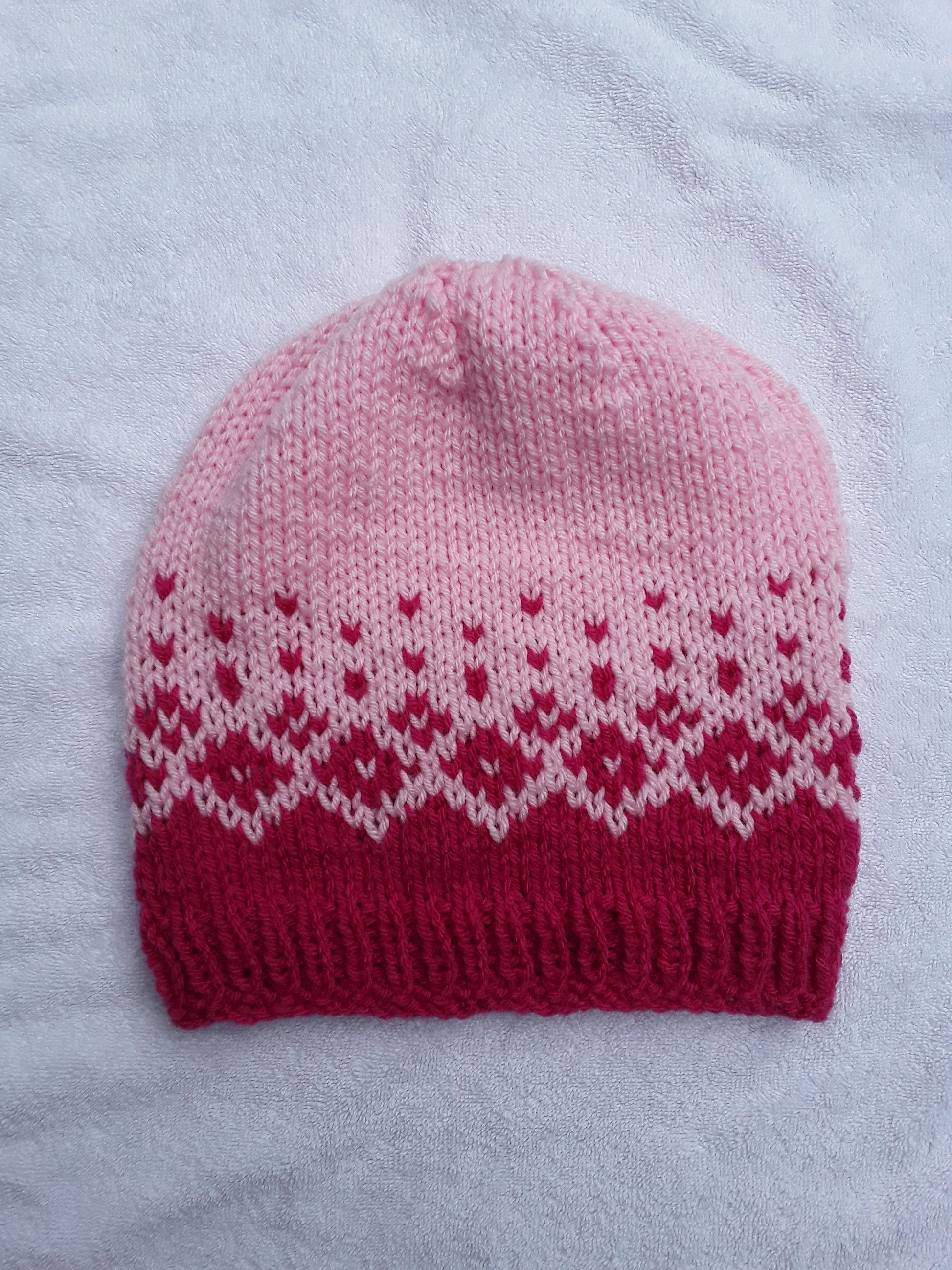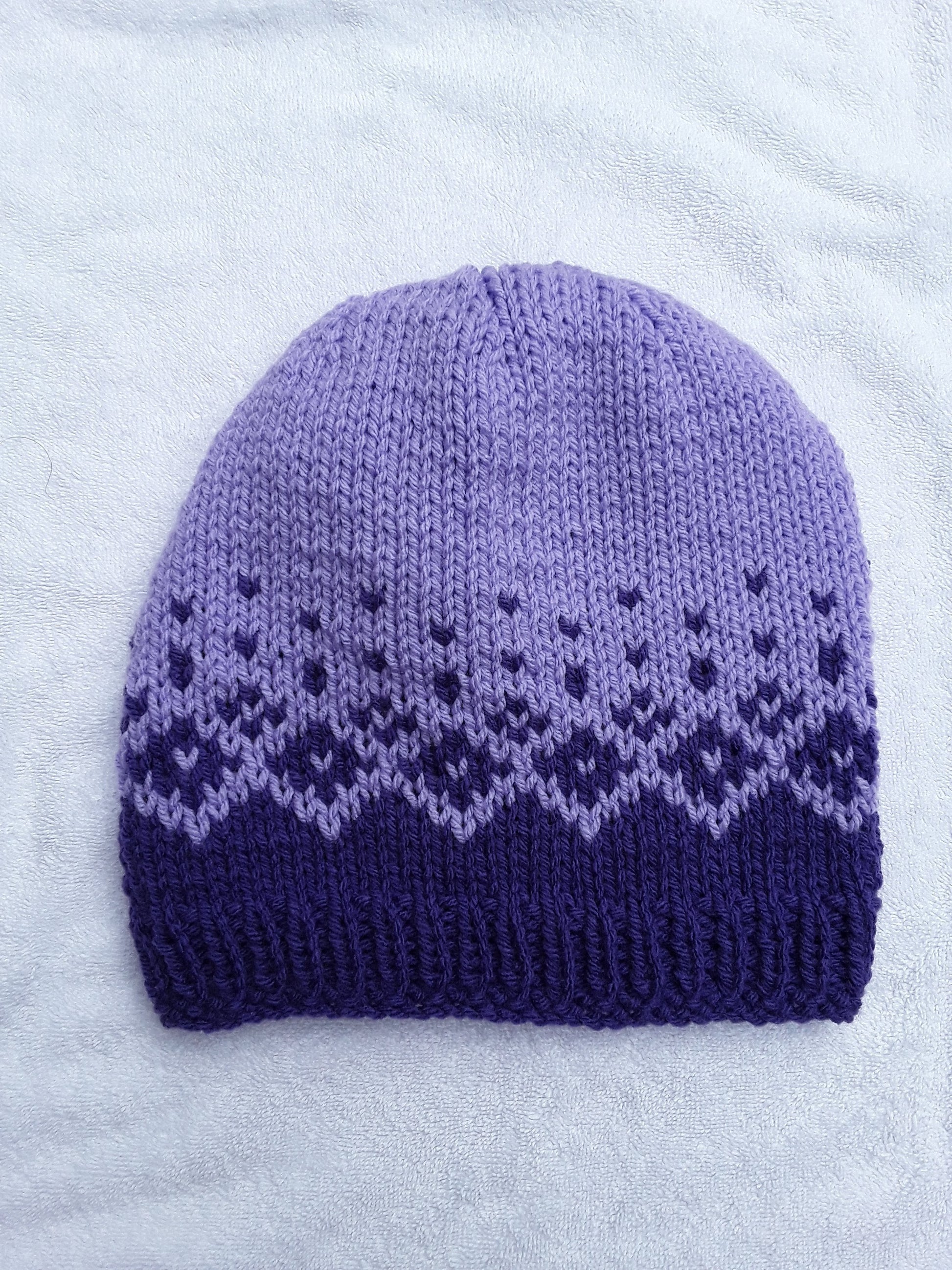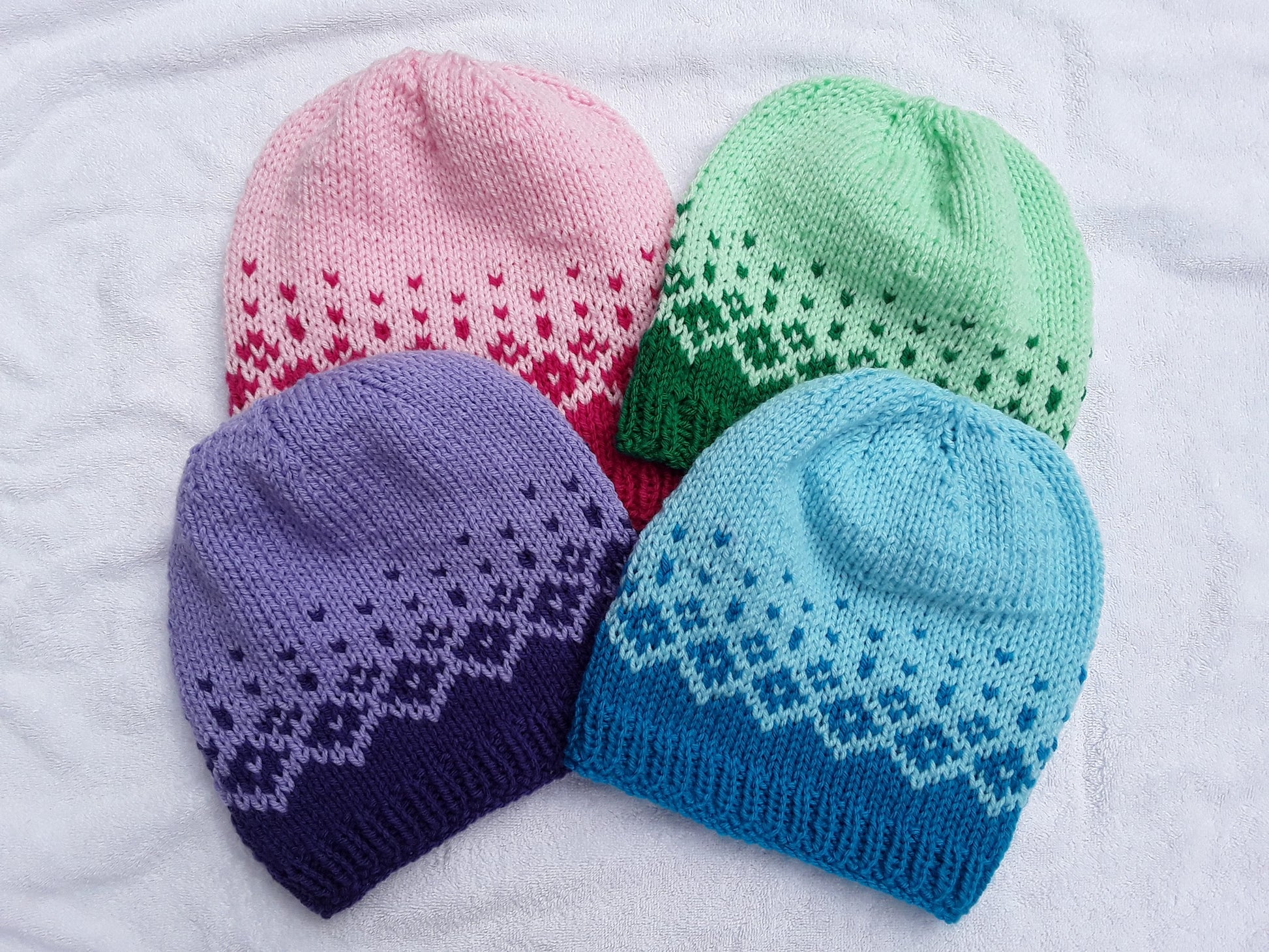 Here's a hat to keep you warm and stylish. This cute design fades from a bright colour to its pastel version, all with a design of beautiful diamonds. Available in four different colours: pink, purple, green, and blue.