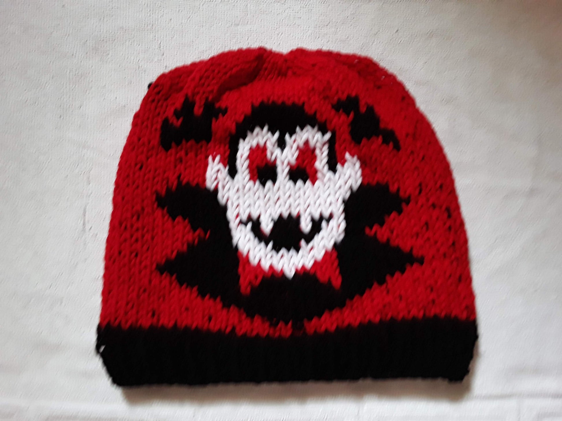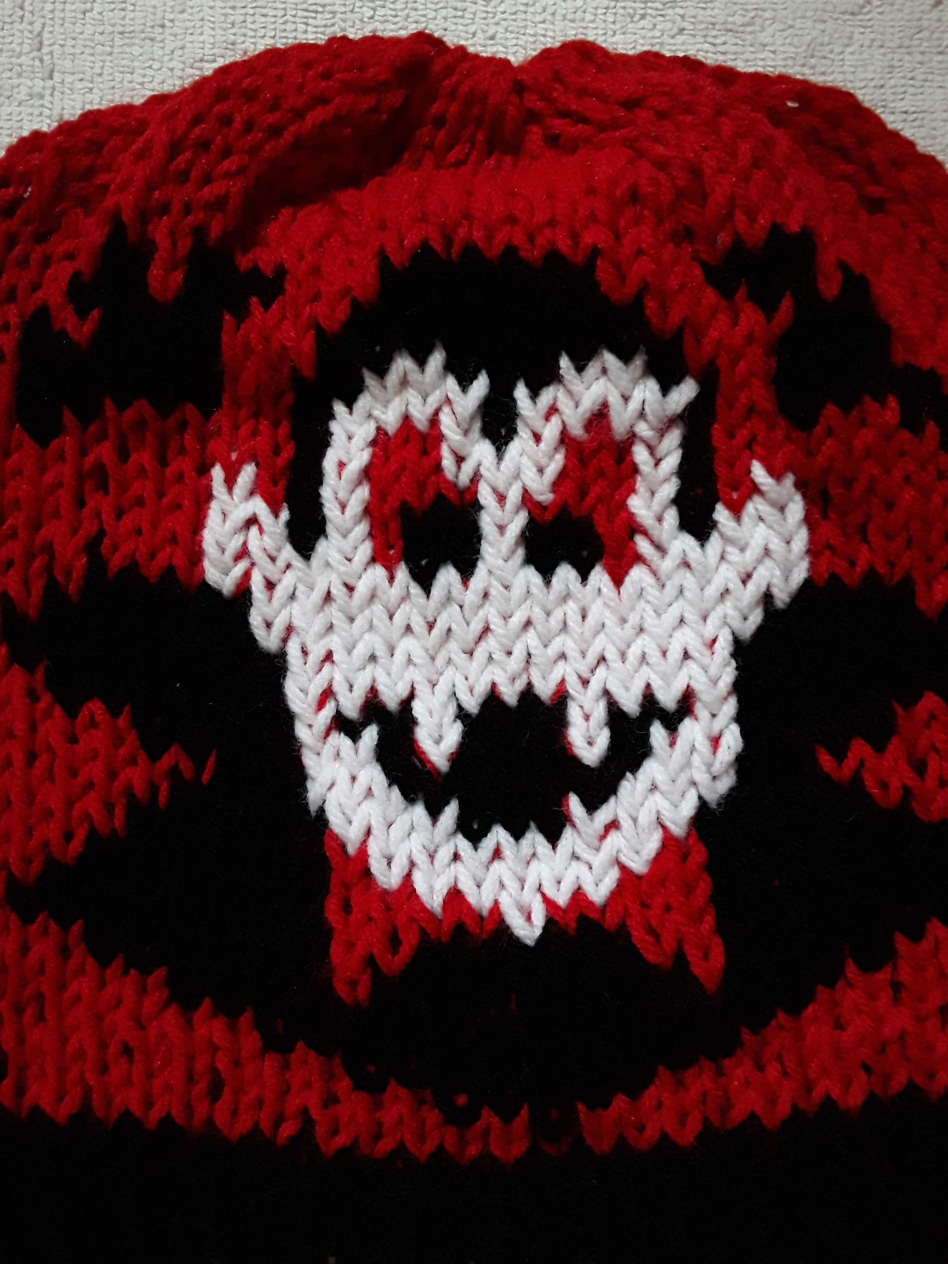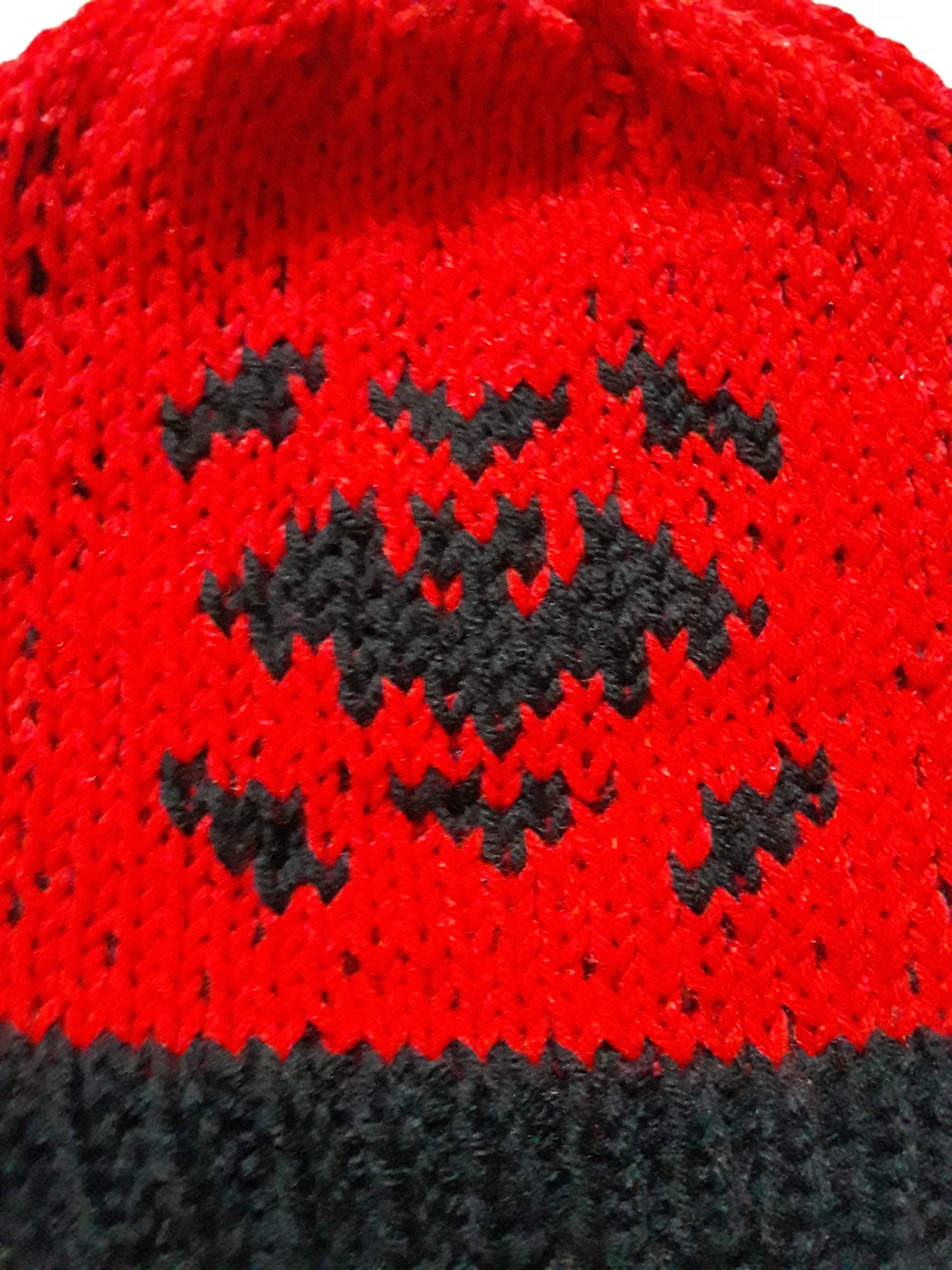 Handknit in Canada, 100% acrylic yarn. Can go in the washing machine; air dry recommended. One size fits most adults.