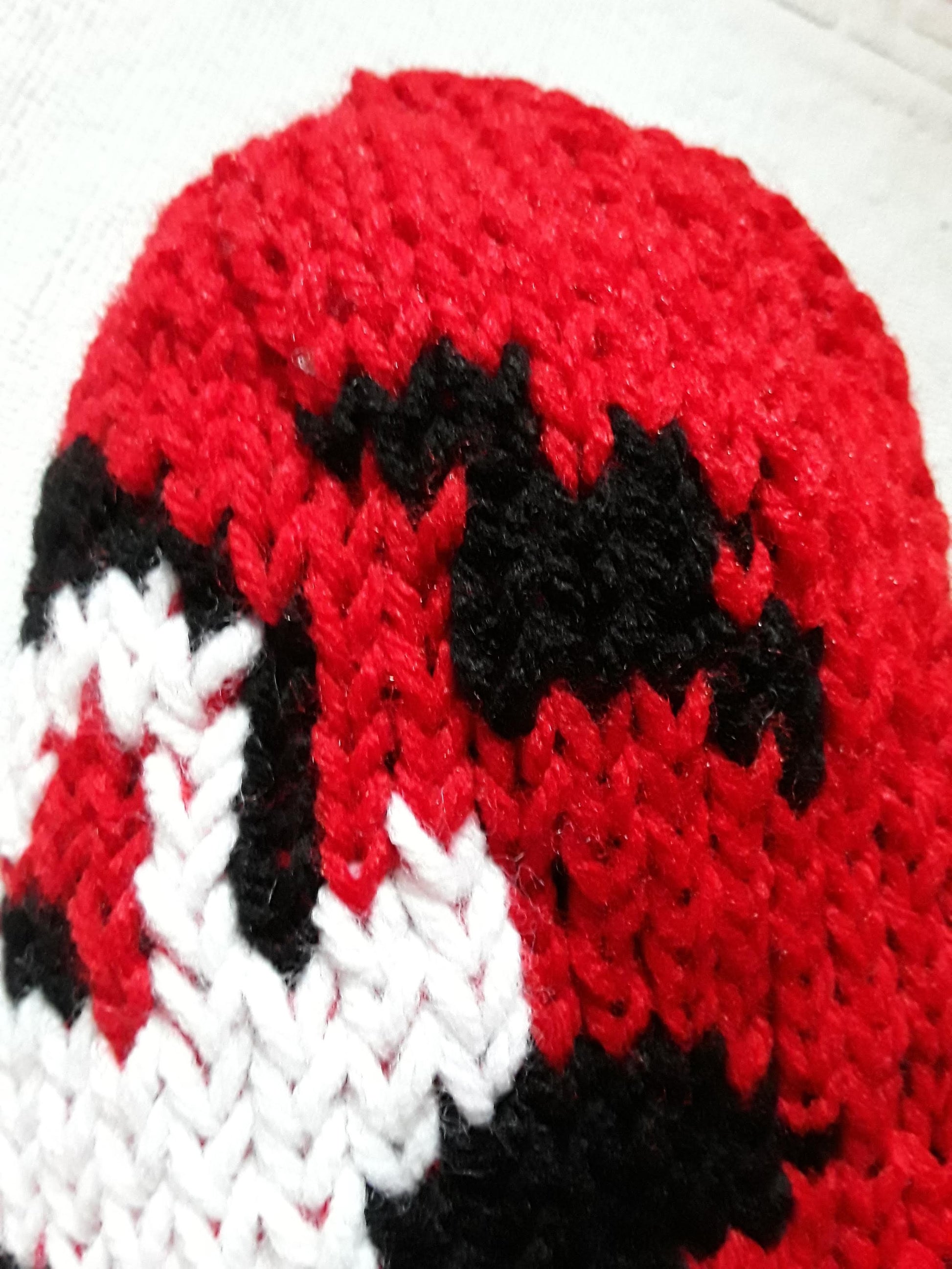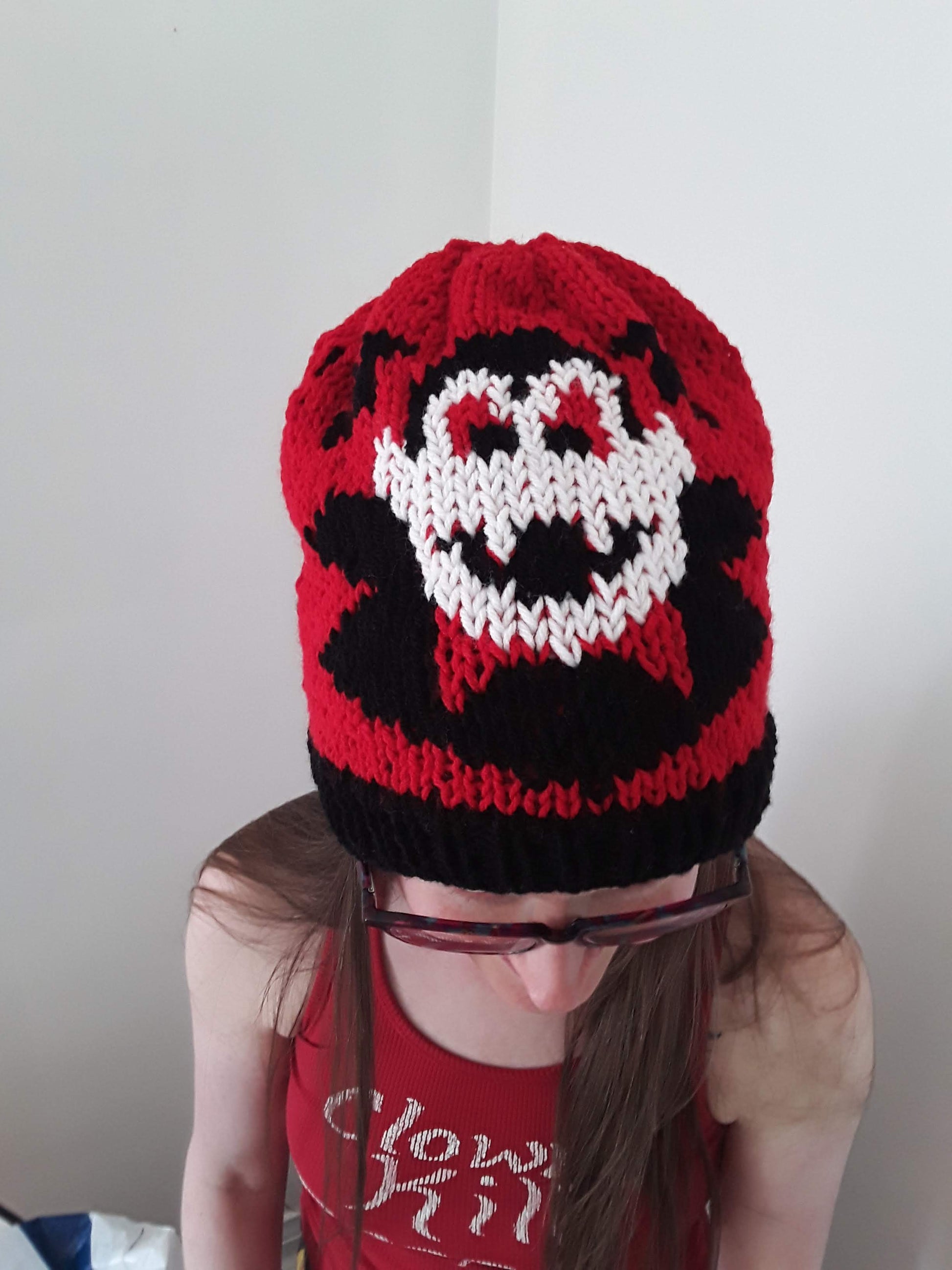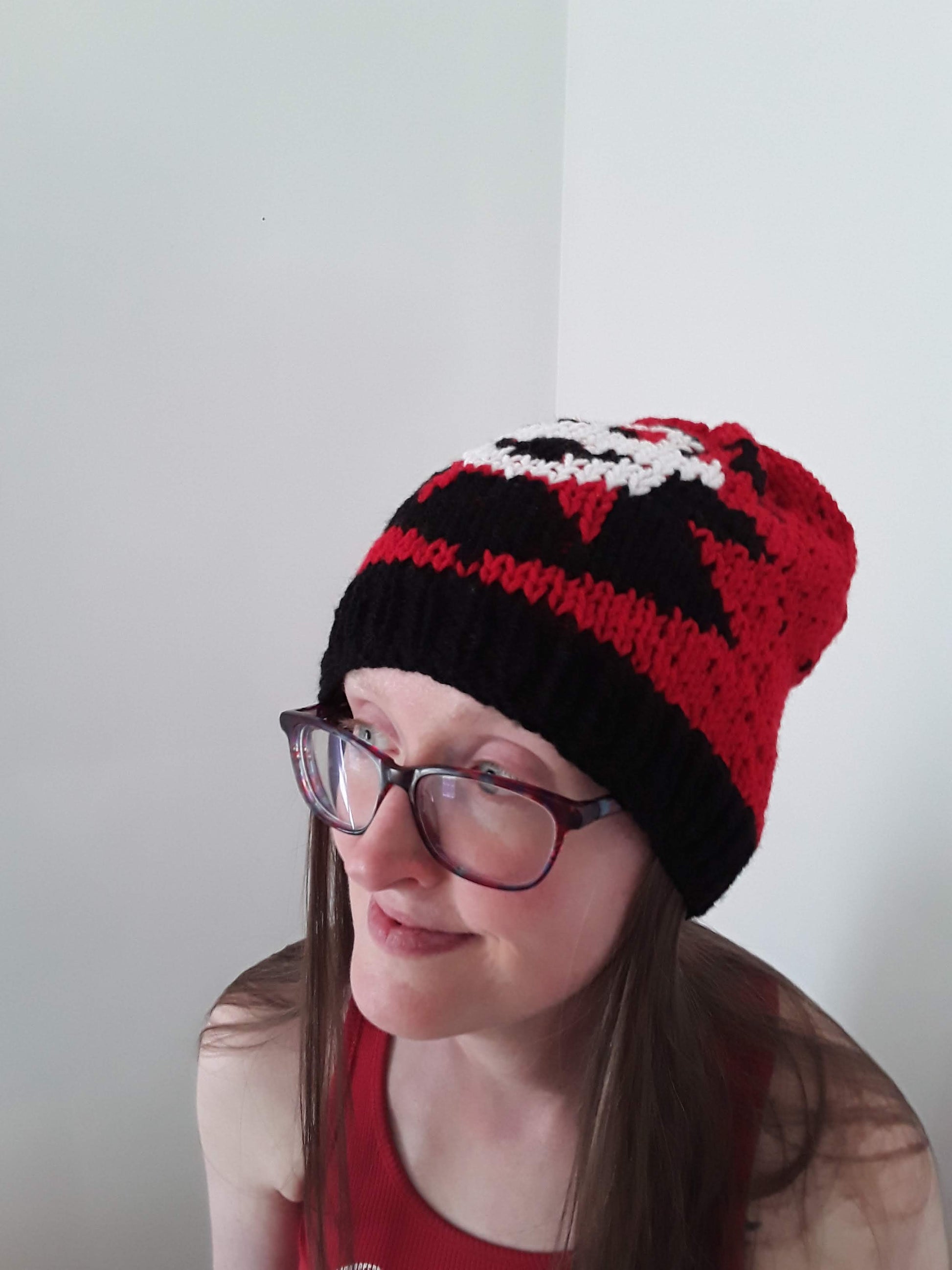 Handknit in Canada, 100% acrylic yarn. Can go in the washing machine; air dry recommended. One size fits most adults.