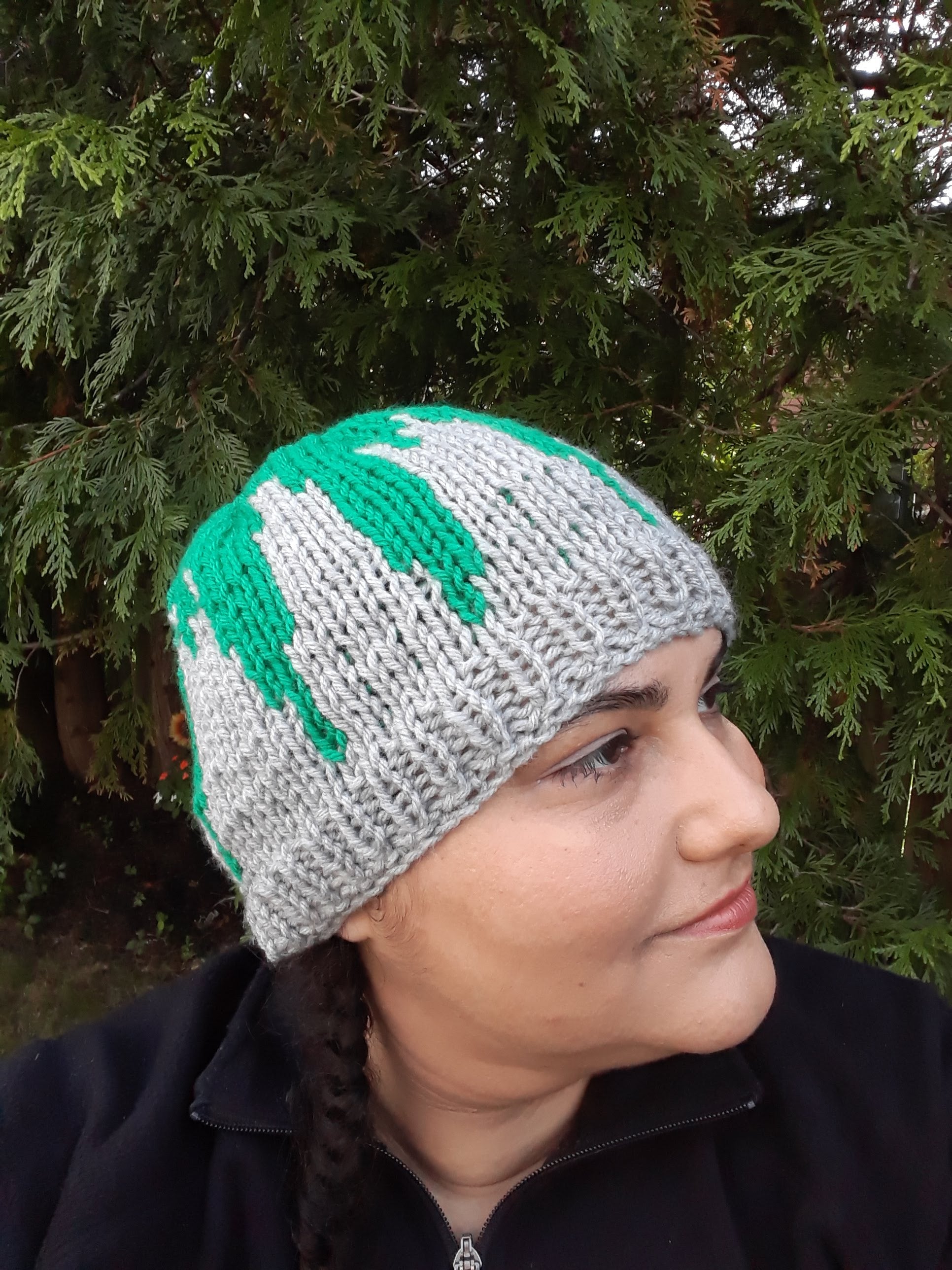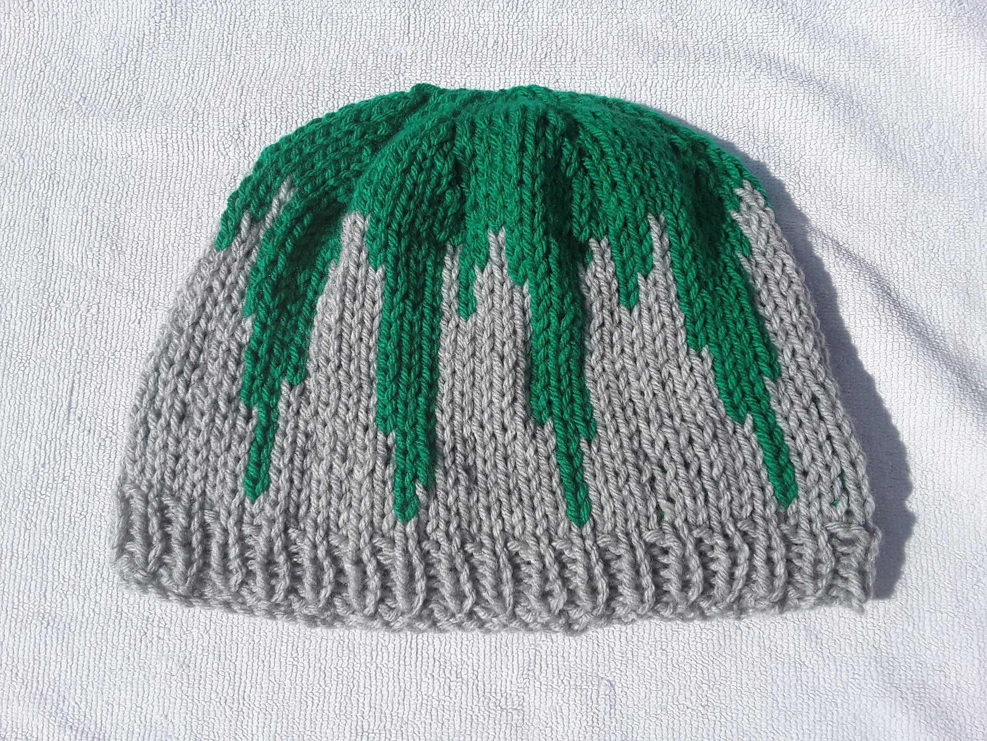 Handknit in Canada, 100% acrylic yarn. Can go in the washing machine; air dry recommended. One size fits most adults.
