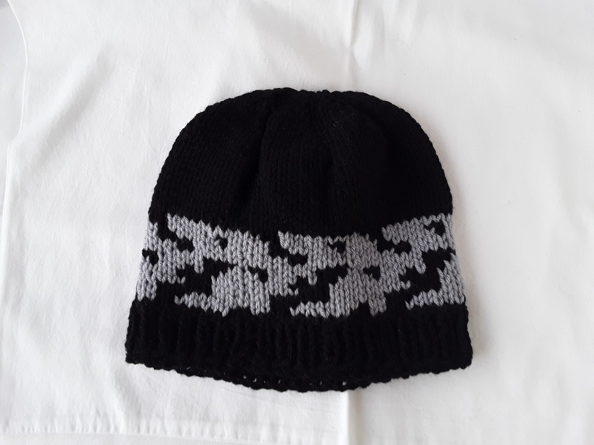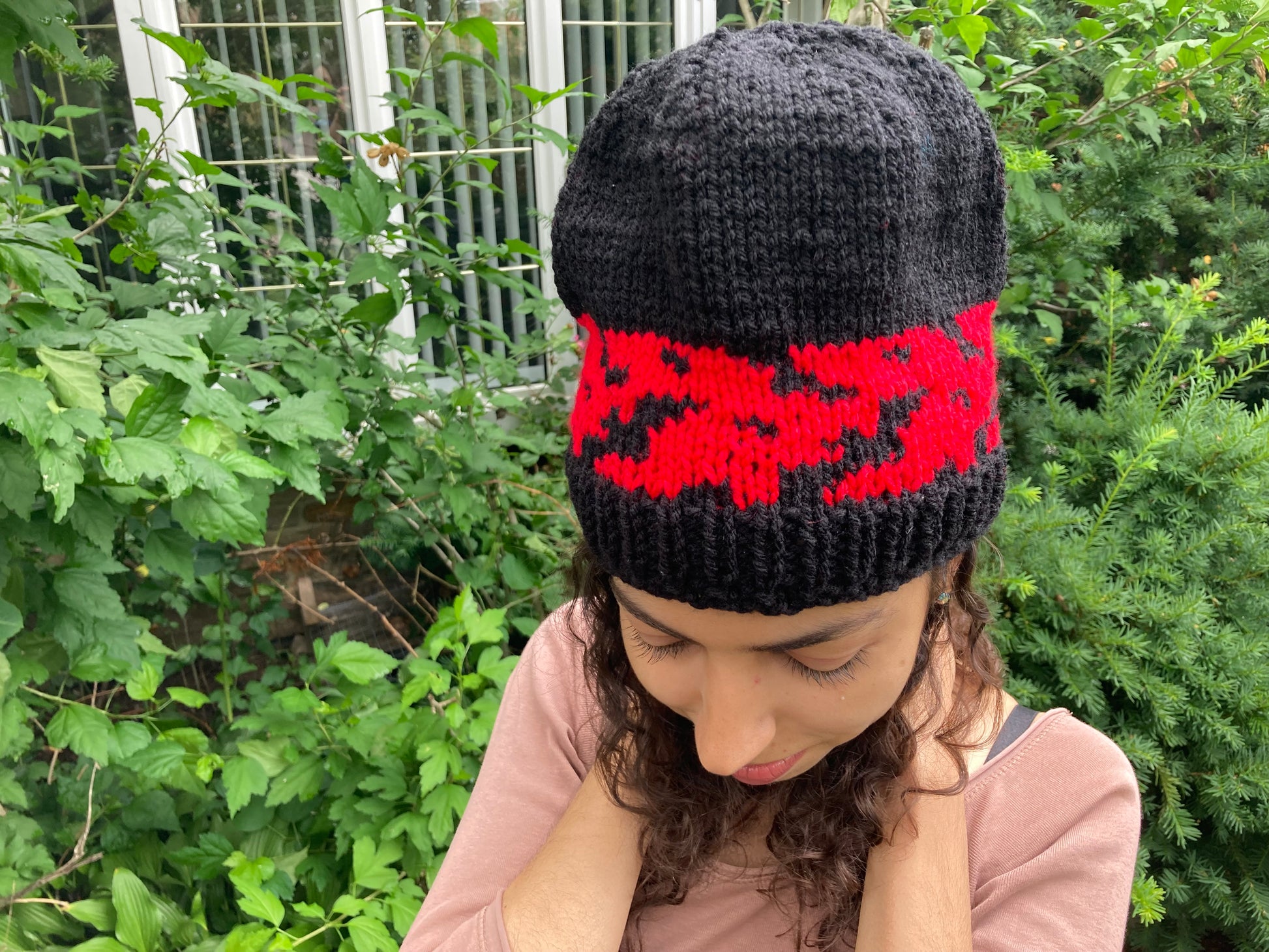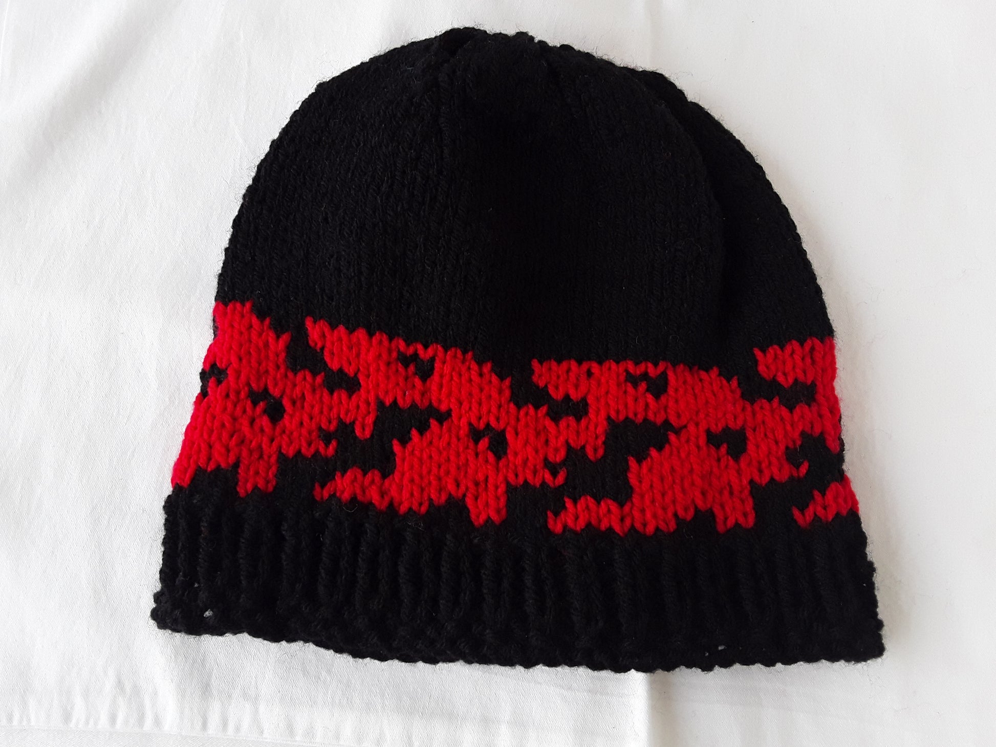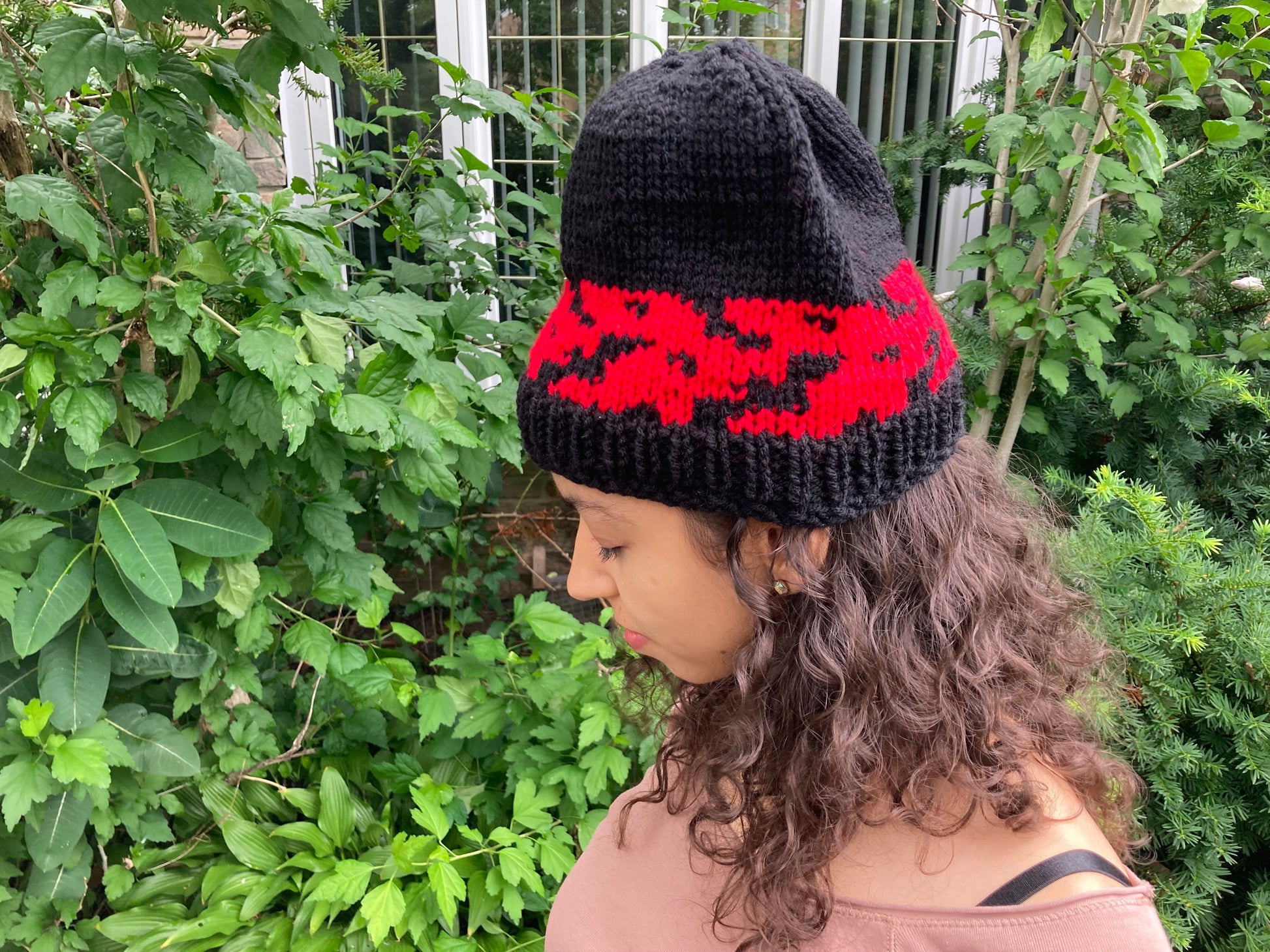 Handknit in Canada, 100% acrylic yarn. Can go in the washing machine; air dry recommended. One size fits most adults.