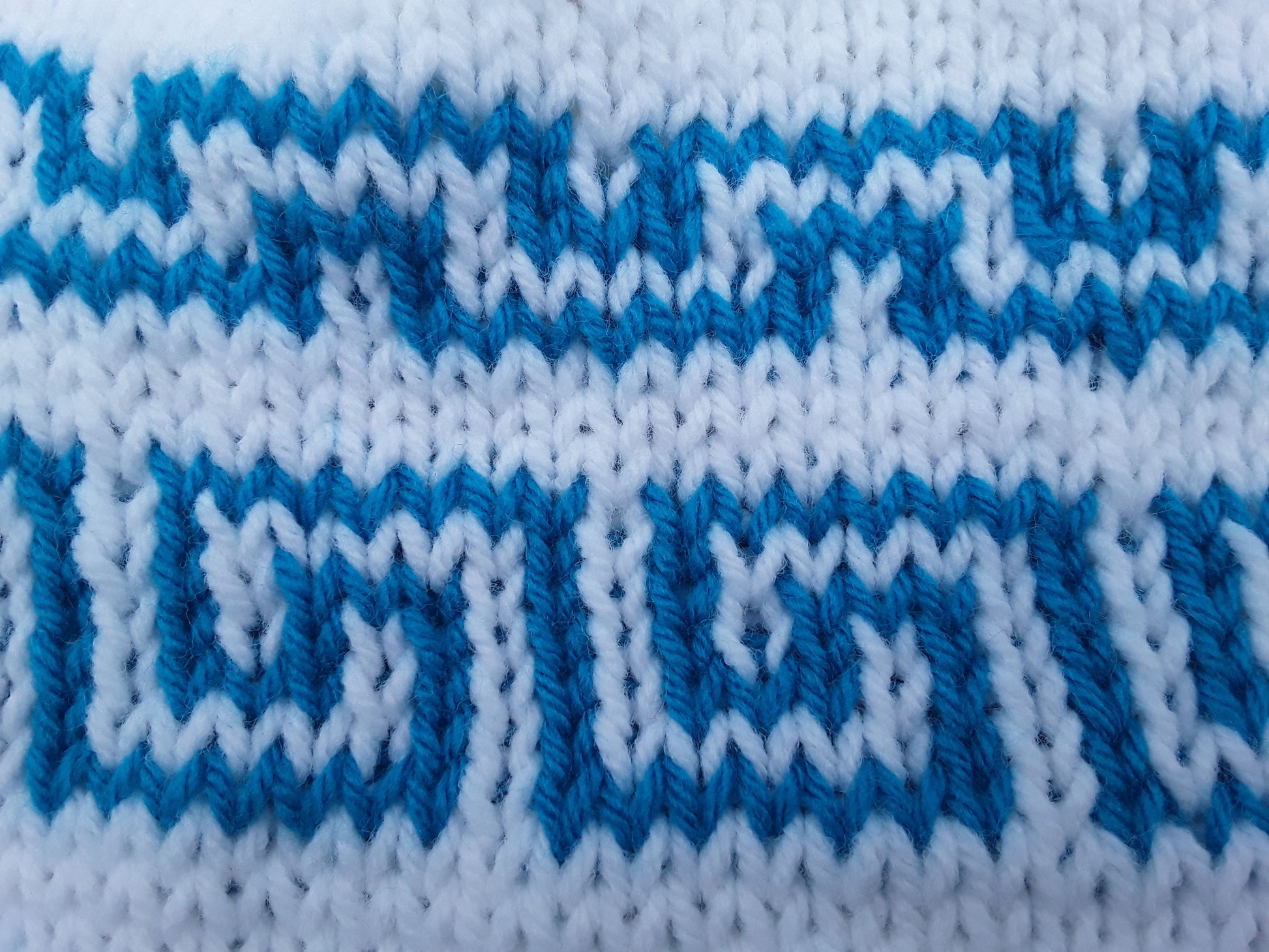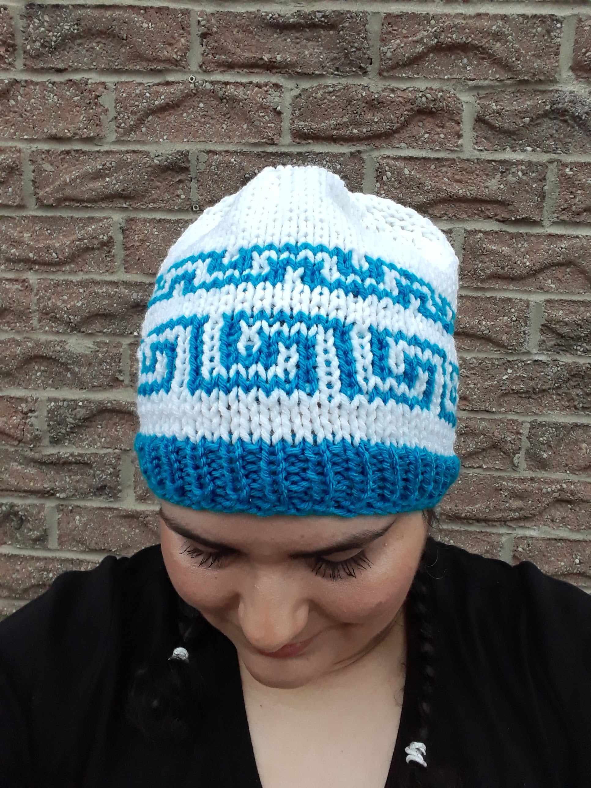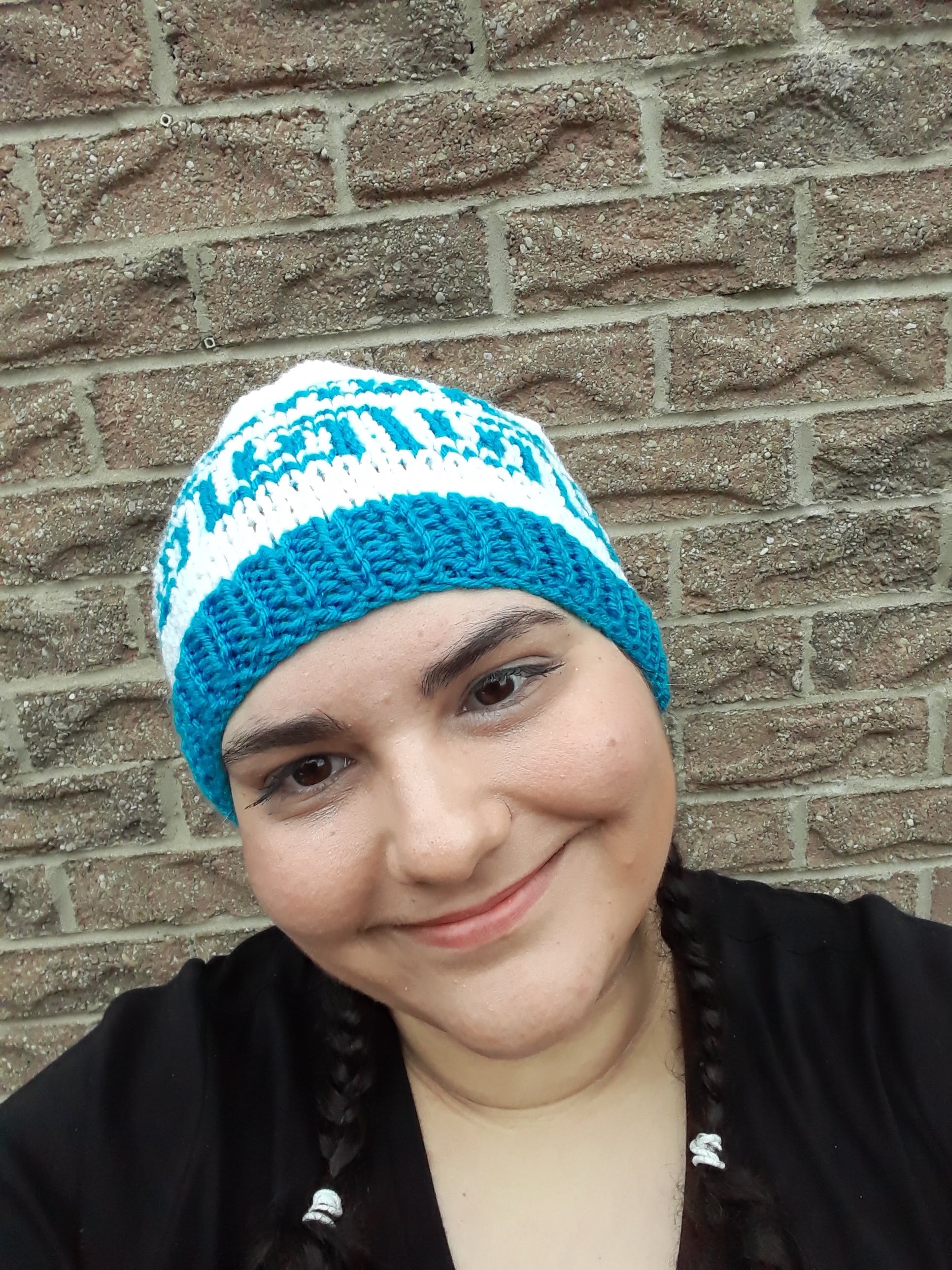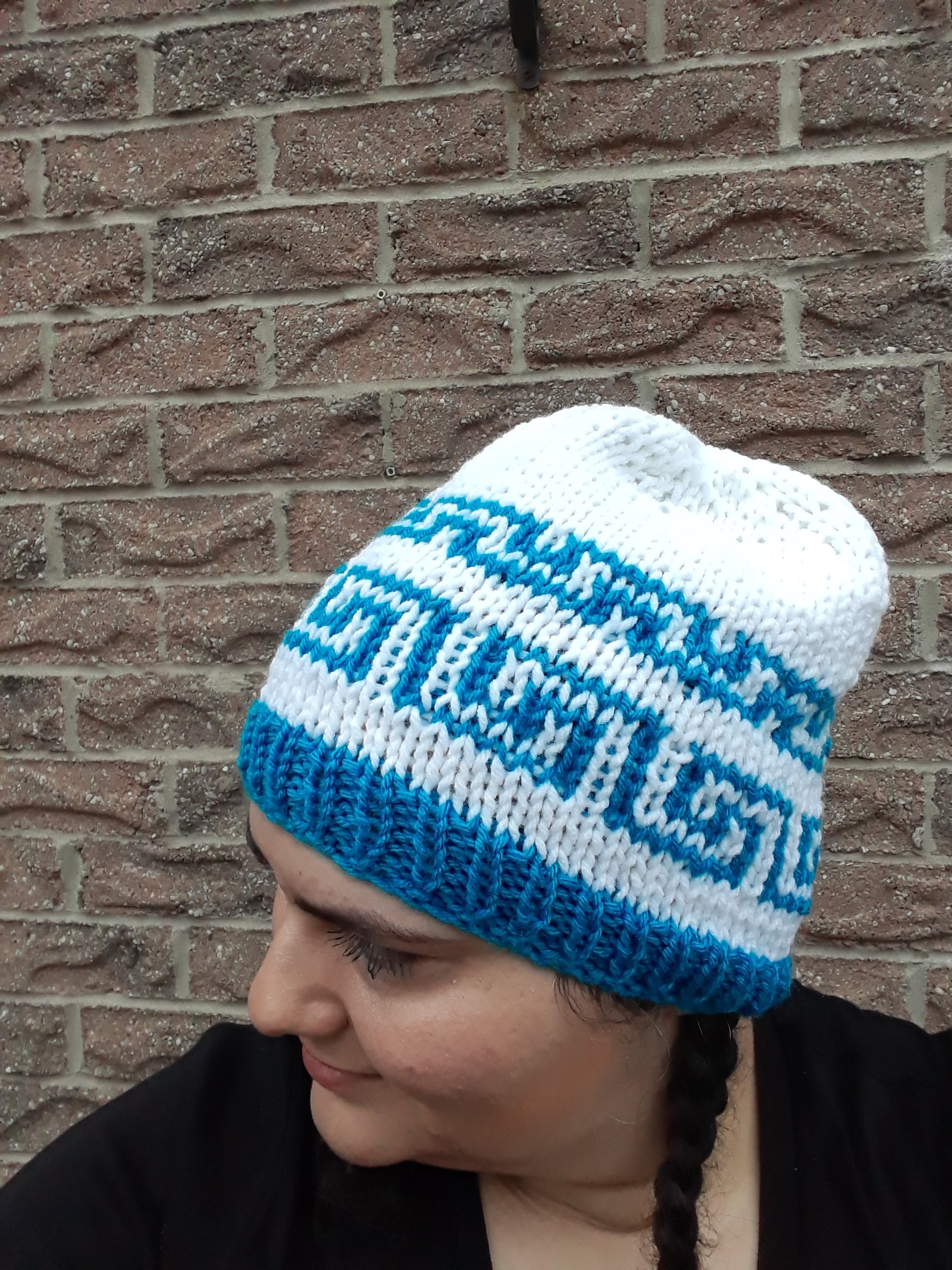 Handknit in Canada, 100% acrylic yarn. Can go in the washing machine; air dry recommended. One size fits most adults.