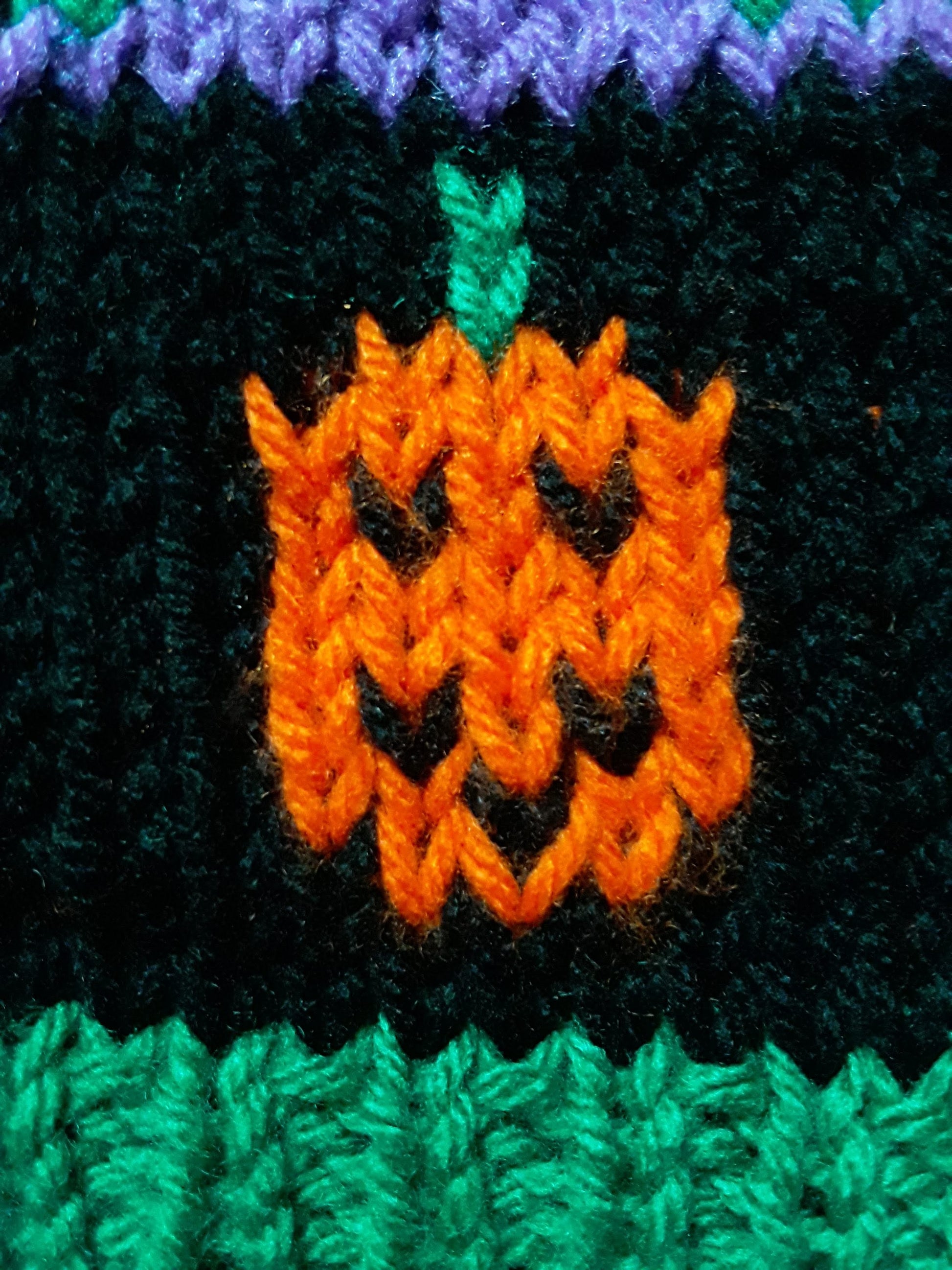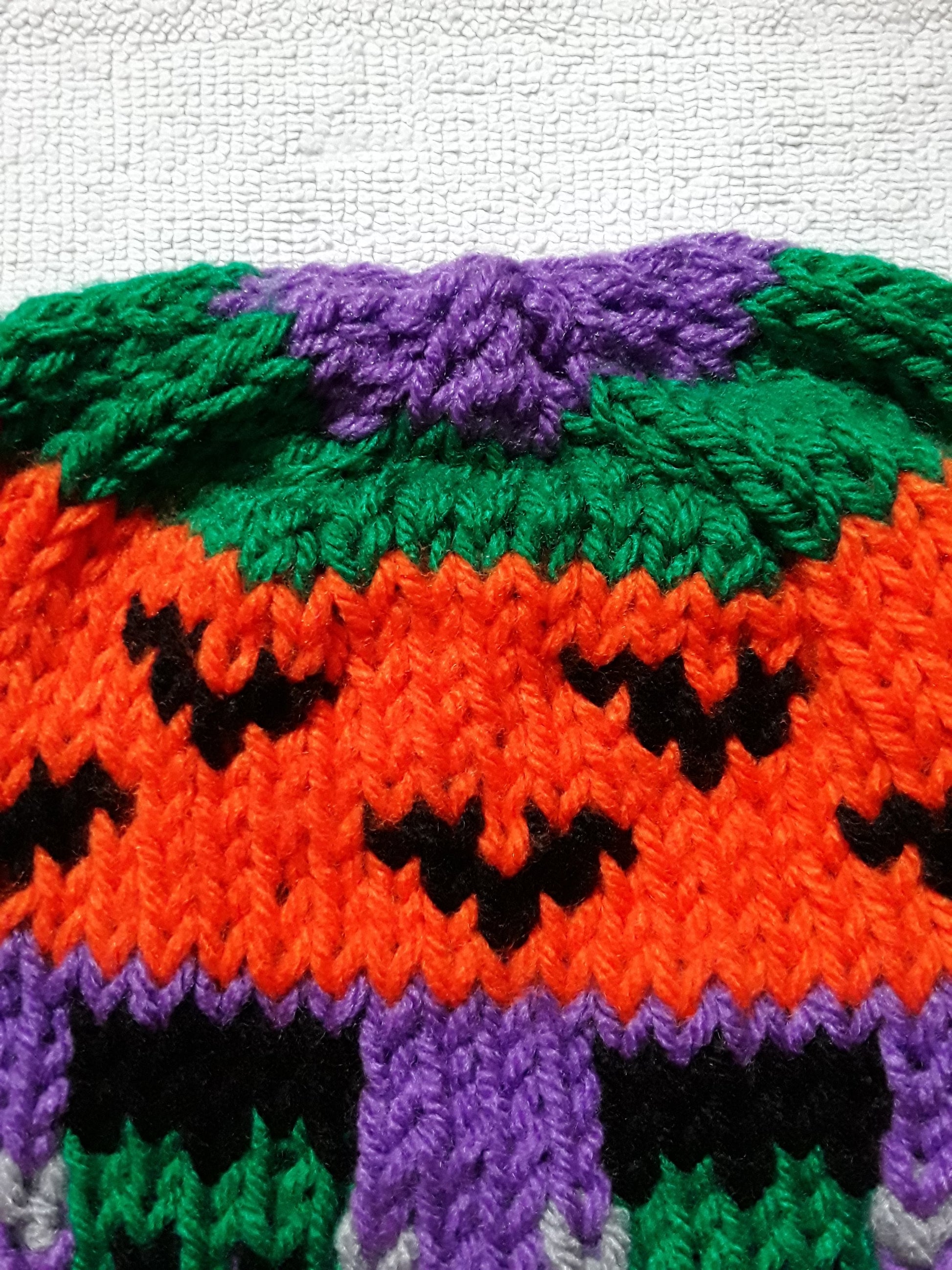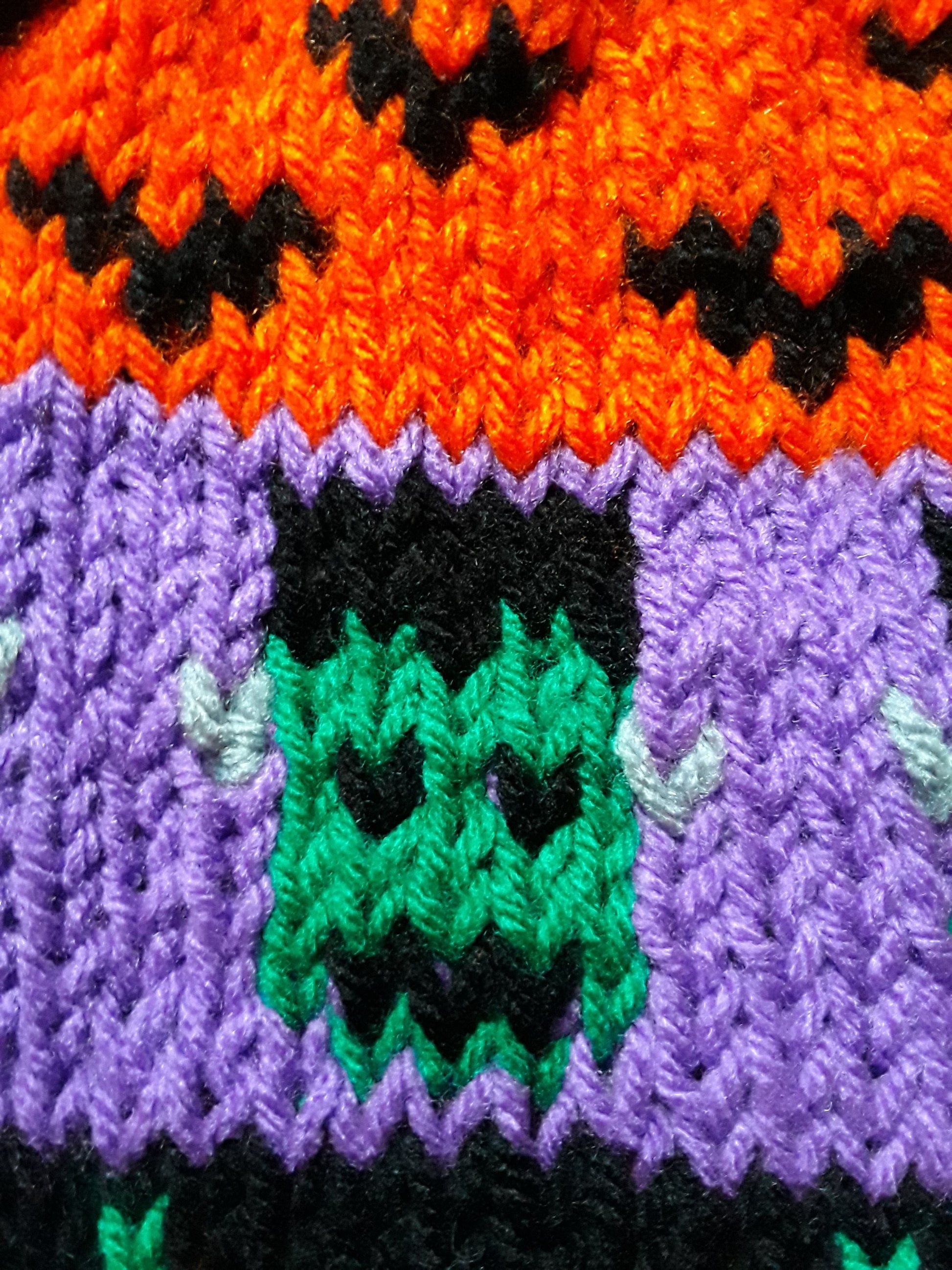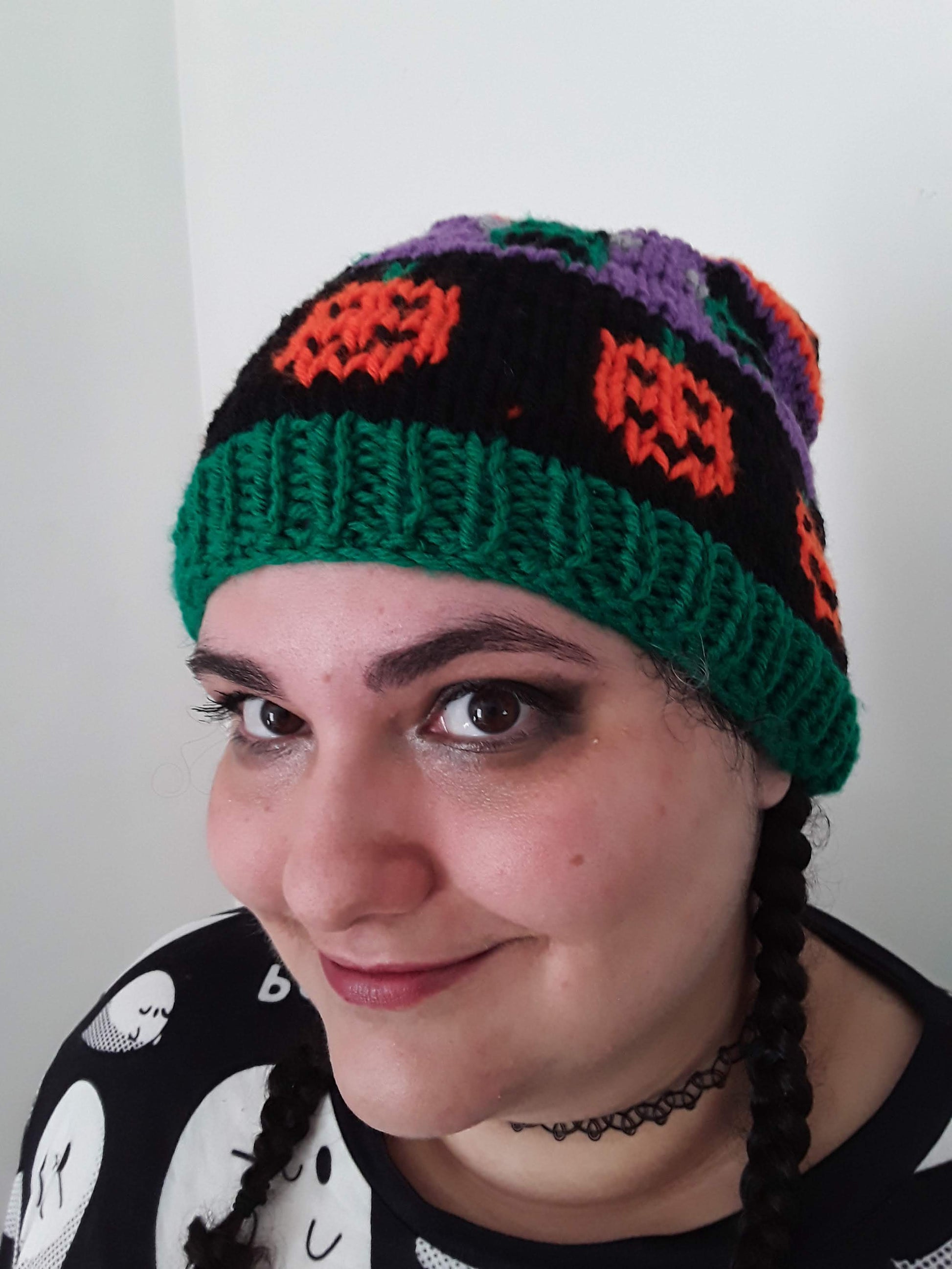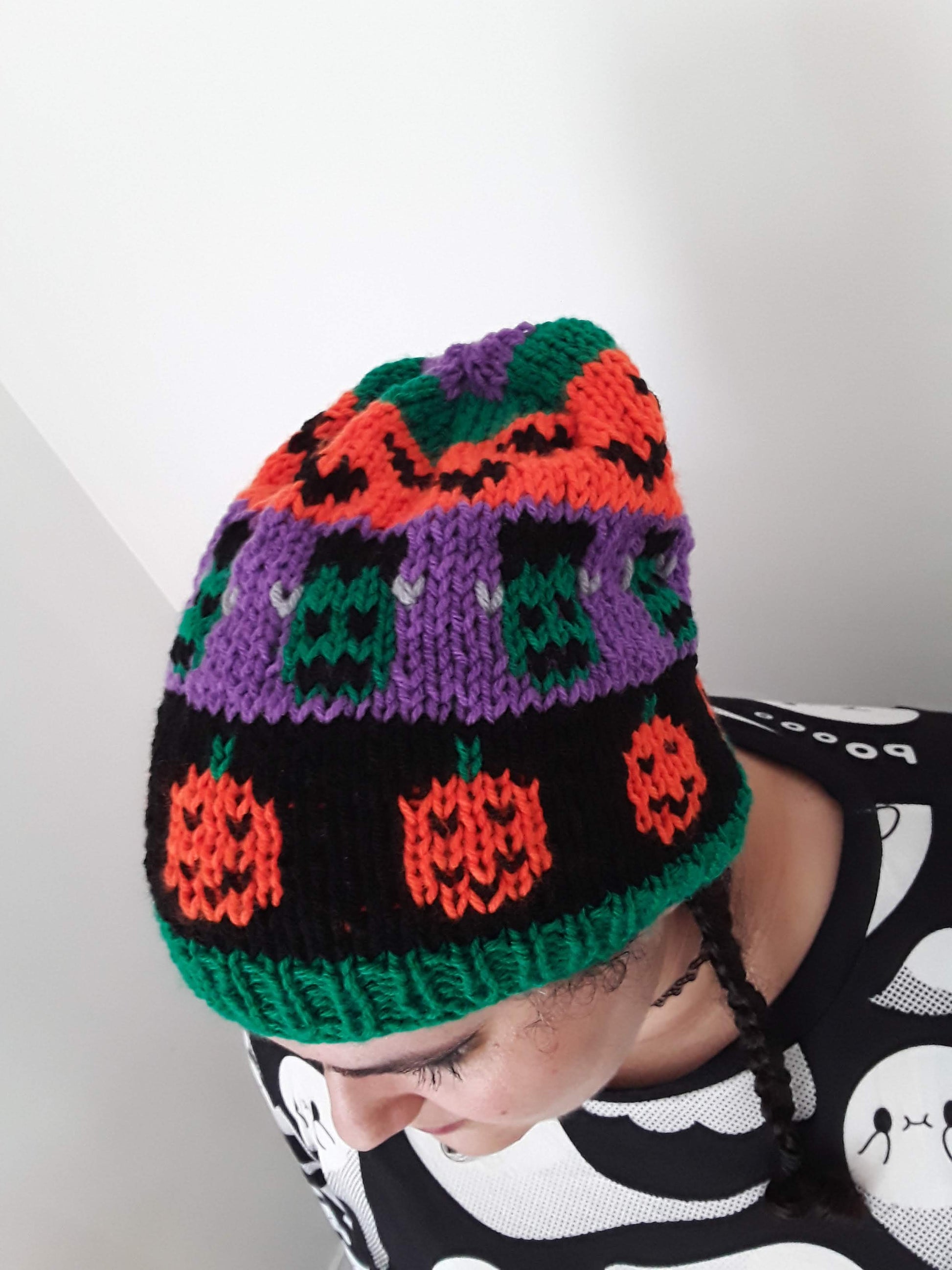 This hat was lovingly crammed full of as much Halloween as I could possibly fit. Spooky characters, the classic Halloween colours, and lots of fun!