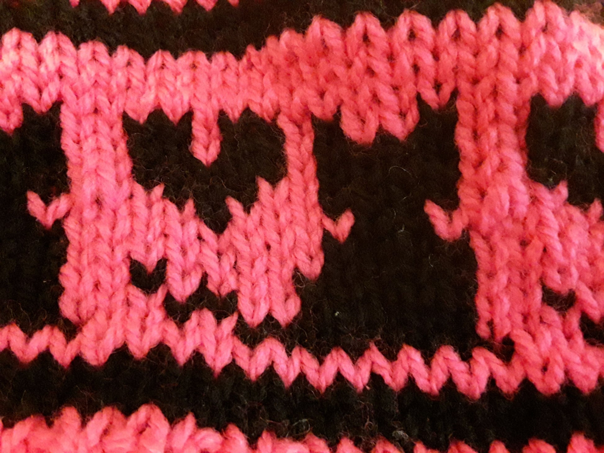 Handknit in Canada, 100% acrylic yarn. Can go in the washing machine; air dry recommended. One size fits most adults.