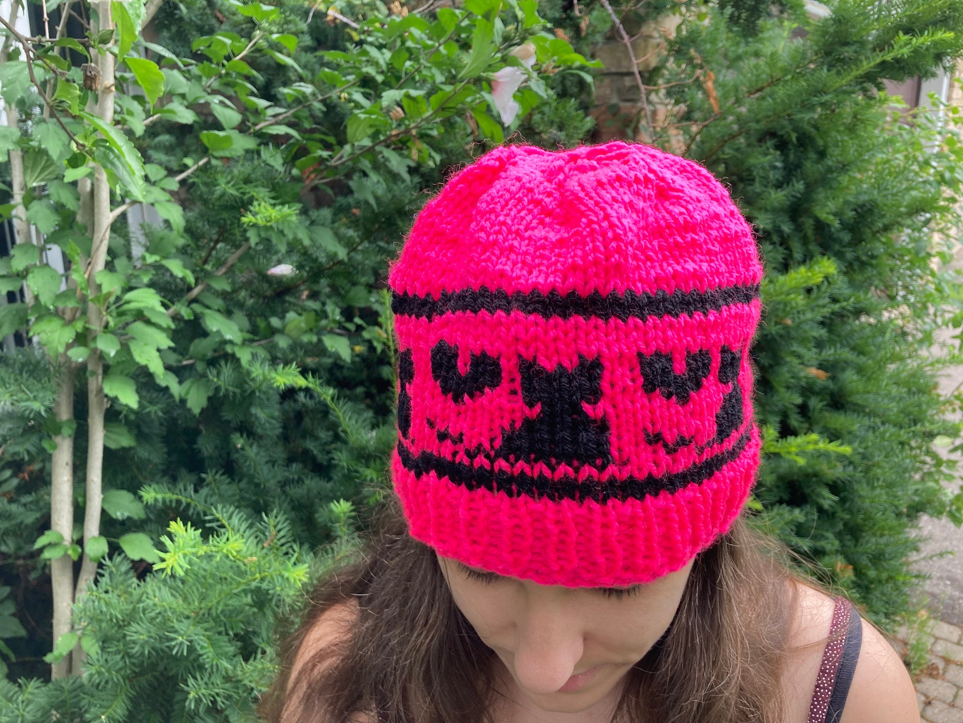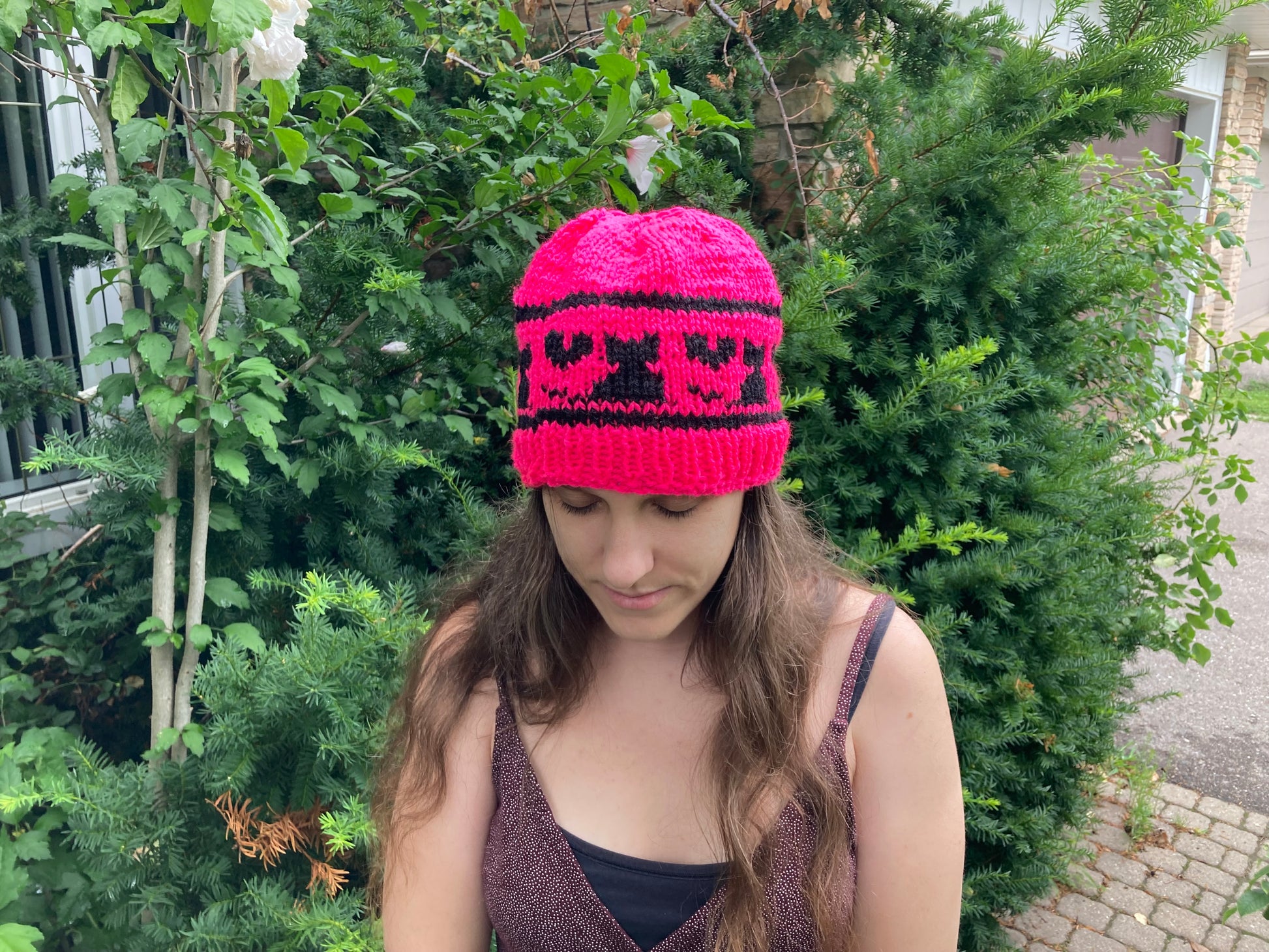 A bright pink hat covered in black cats: it's fun, it's cool, and it's so eye-catching you will never lose it in the back of your closet.