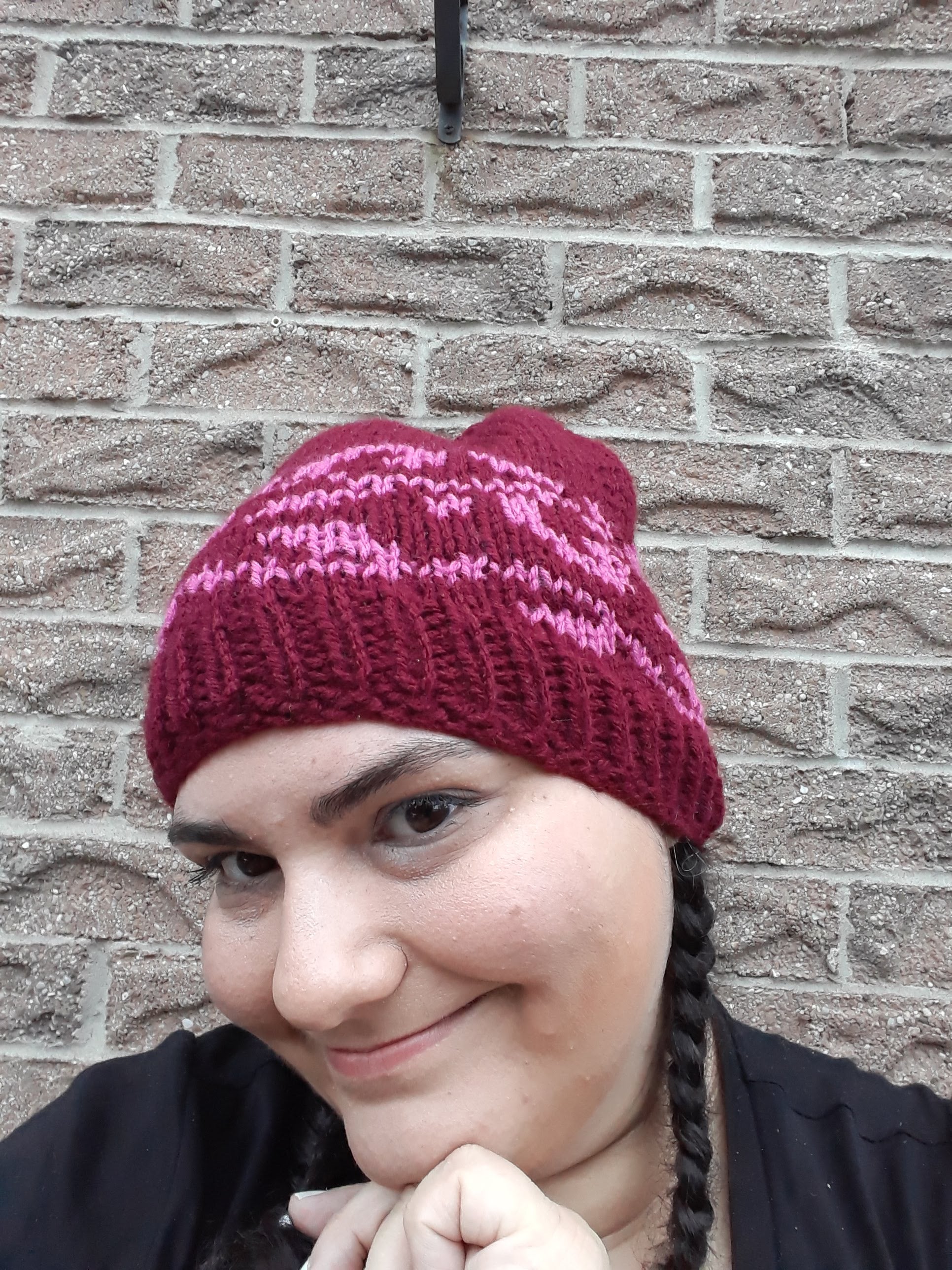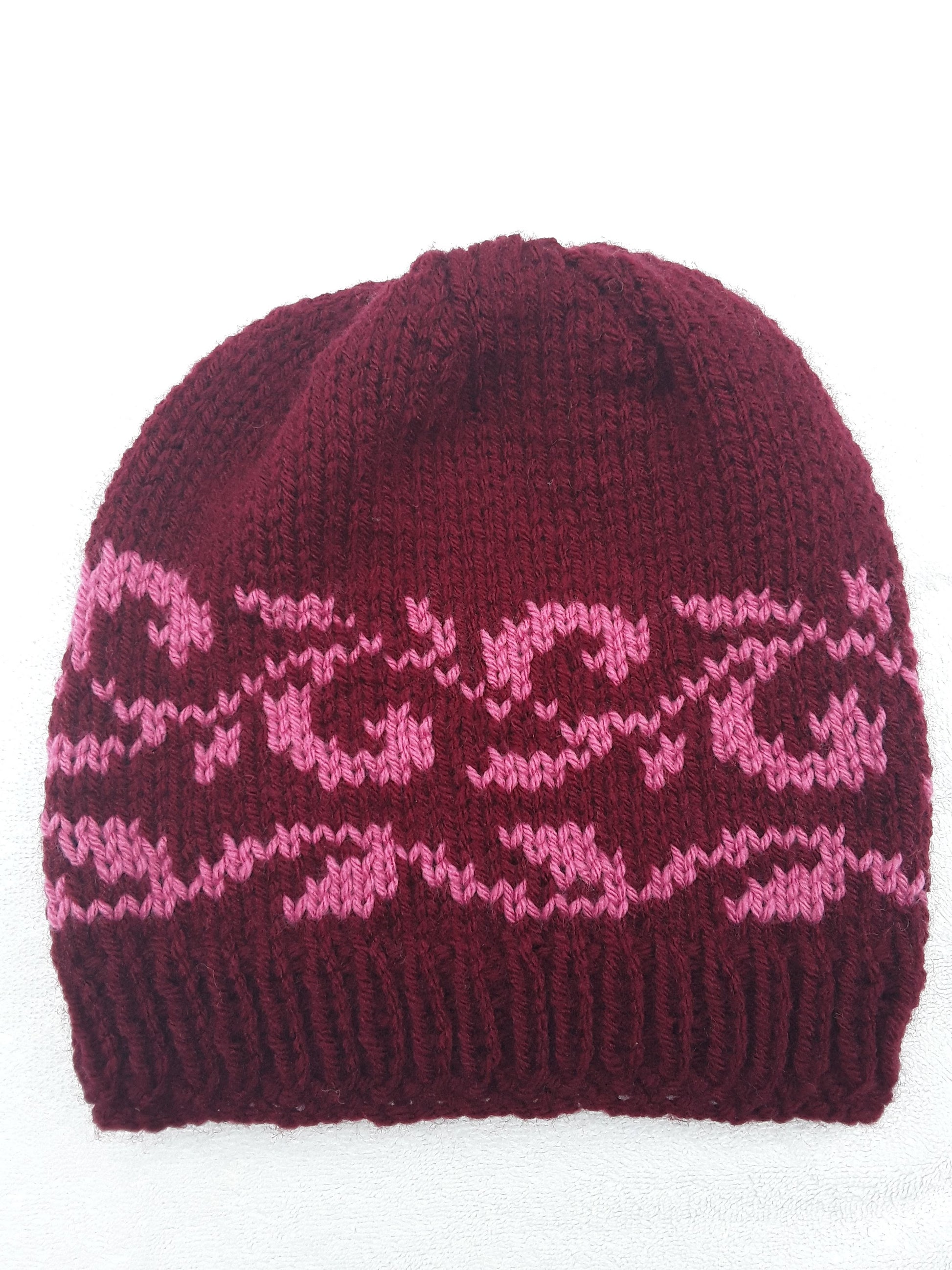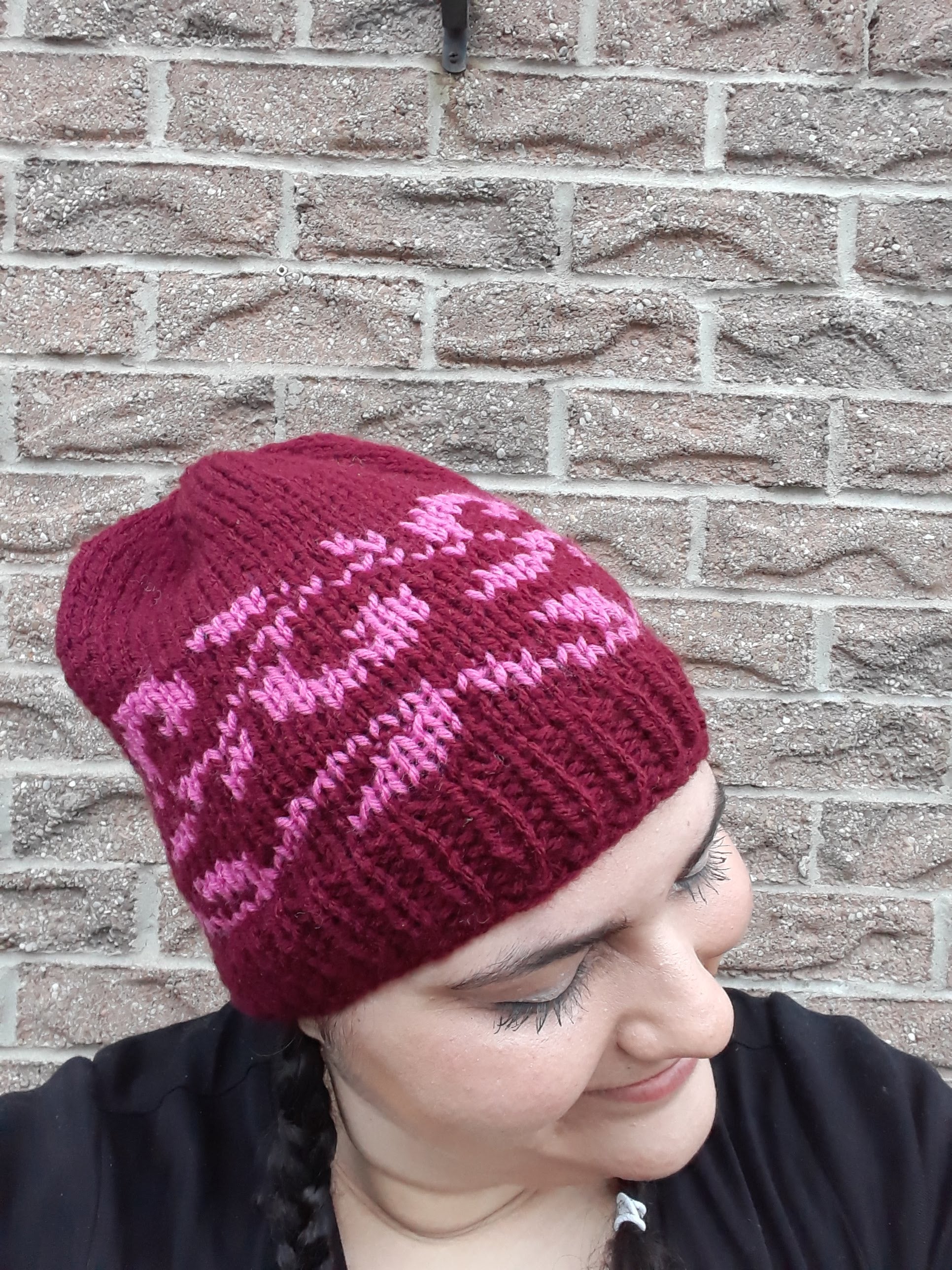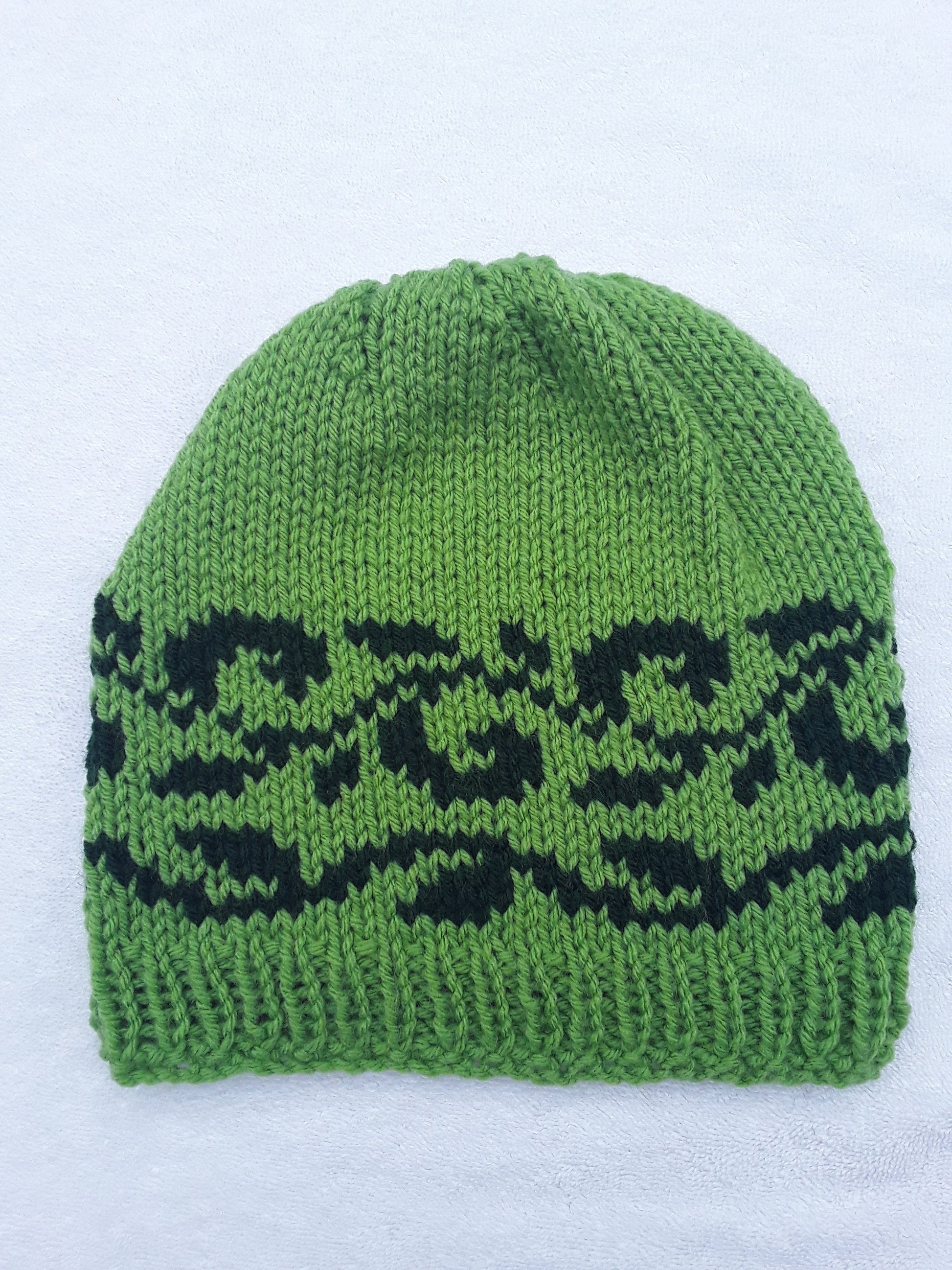 Handknit in Canada, 100% acrylic yarn. Can go in the washing machine; air dry recommended. One size fits most adults.