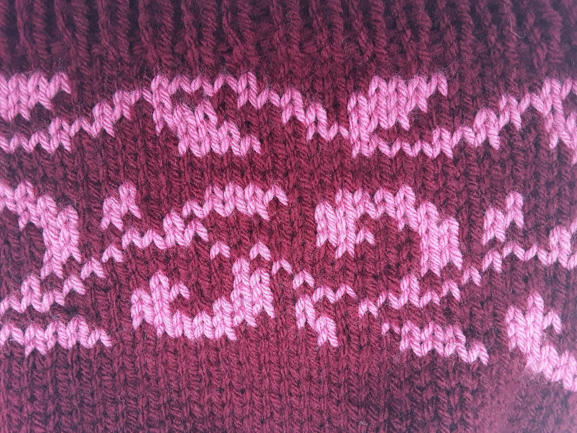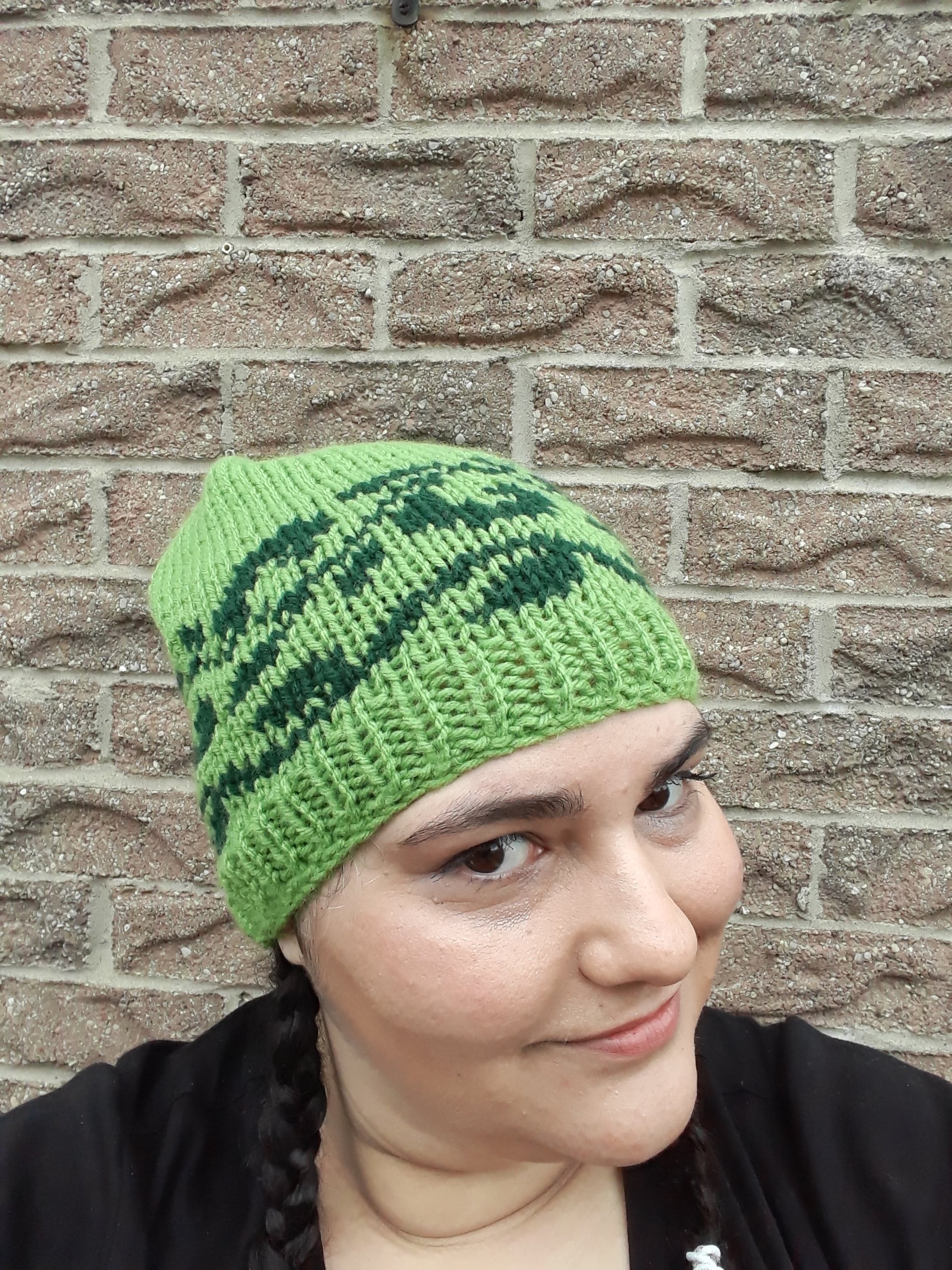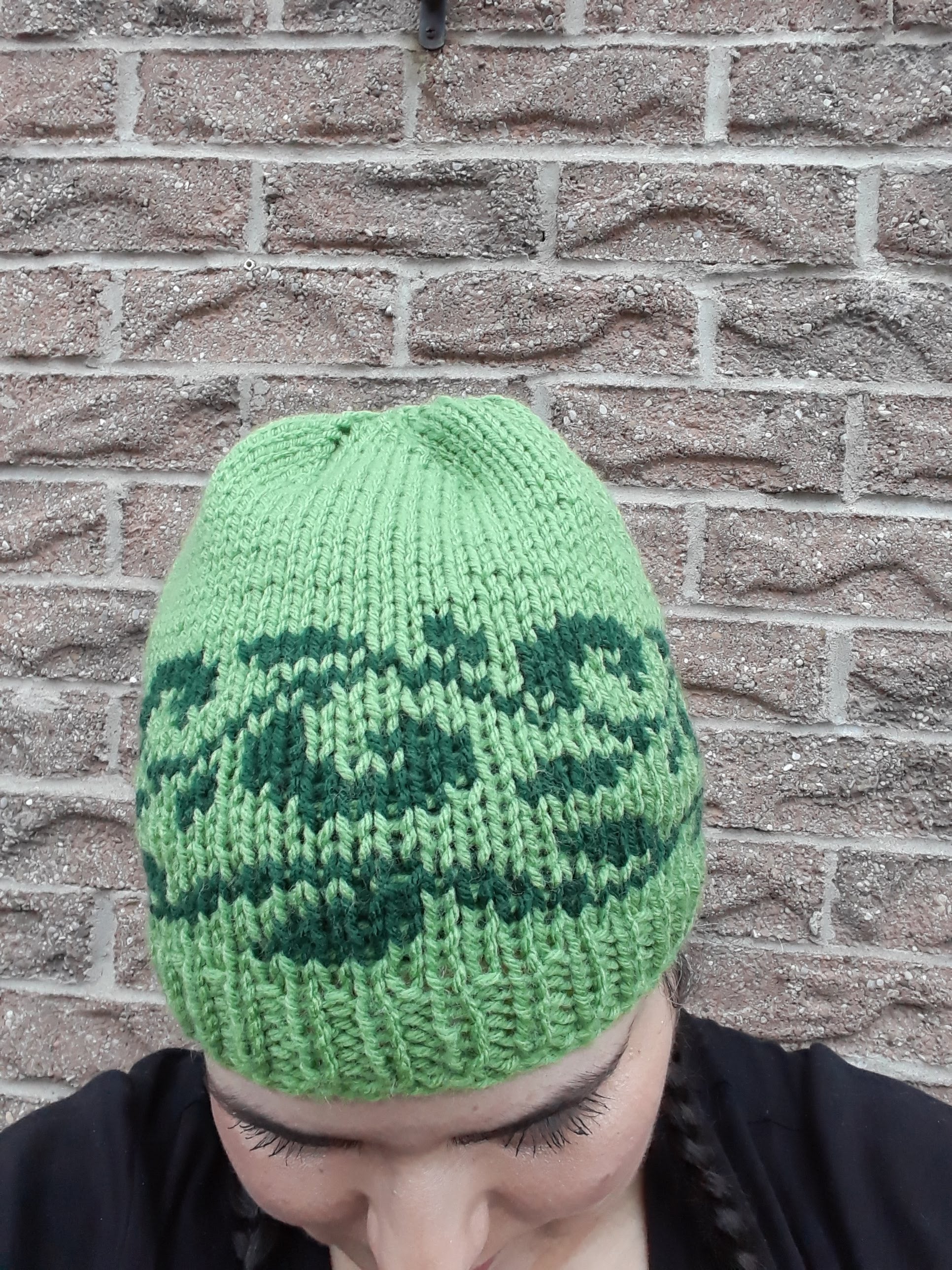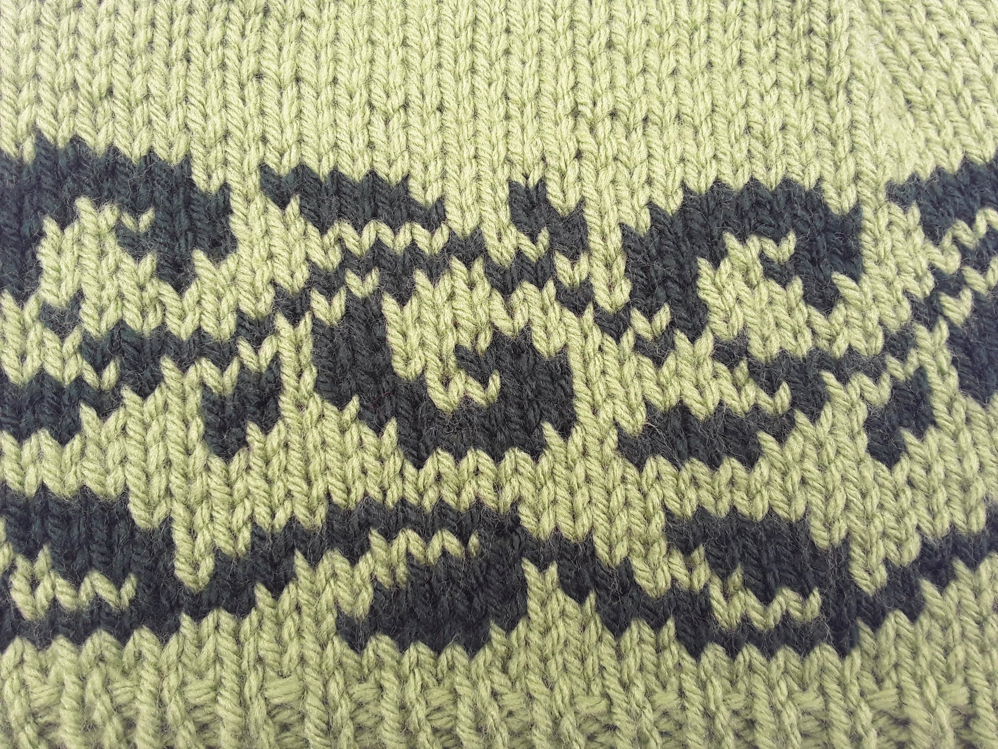 Handknit in Canada, 100% acrylic yarn. Can go in the washing machine; air dry recommended. One size fits most adults.