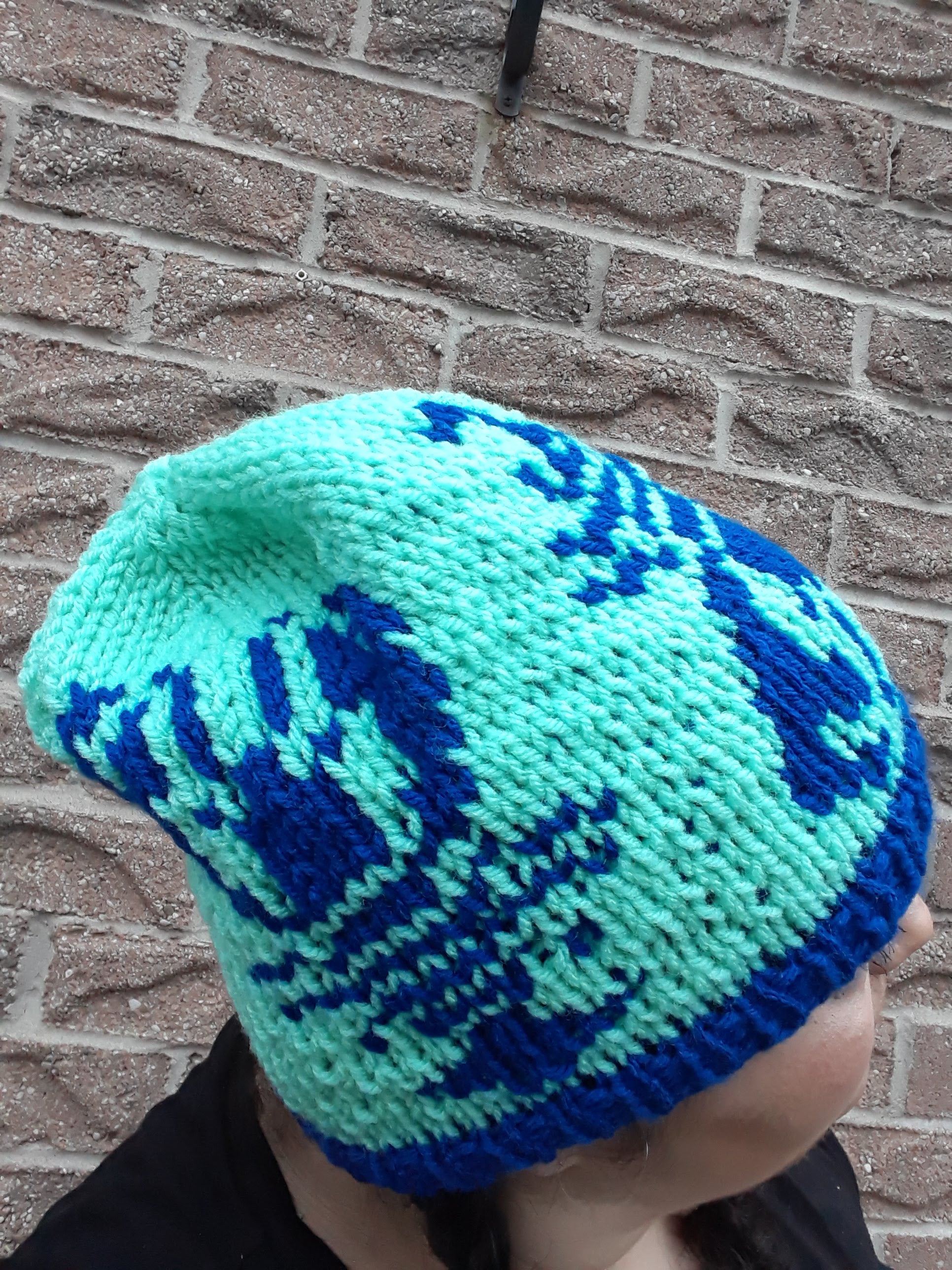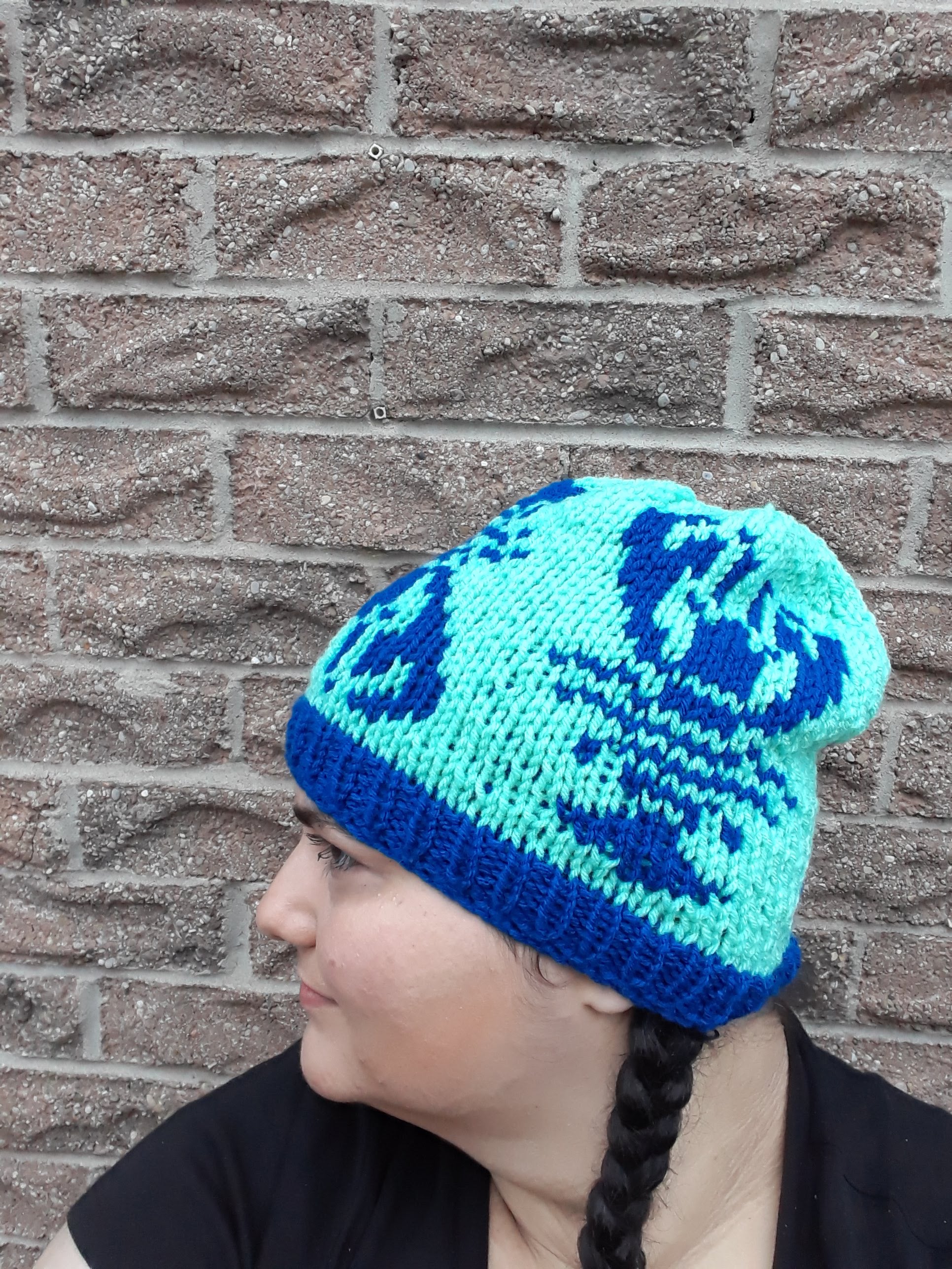 Four lovely lobsters surround this unique hat. The light blue / dark blue contrast makes them stand out and look their pinchiest.