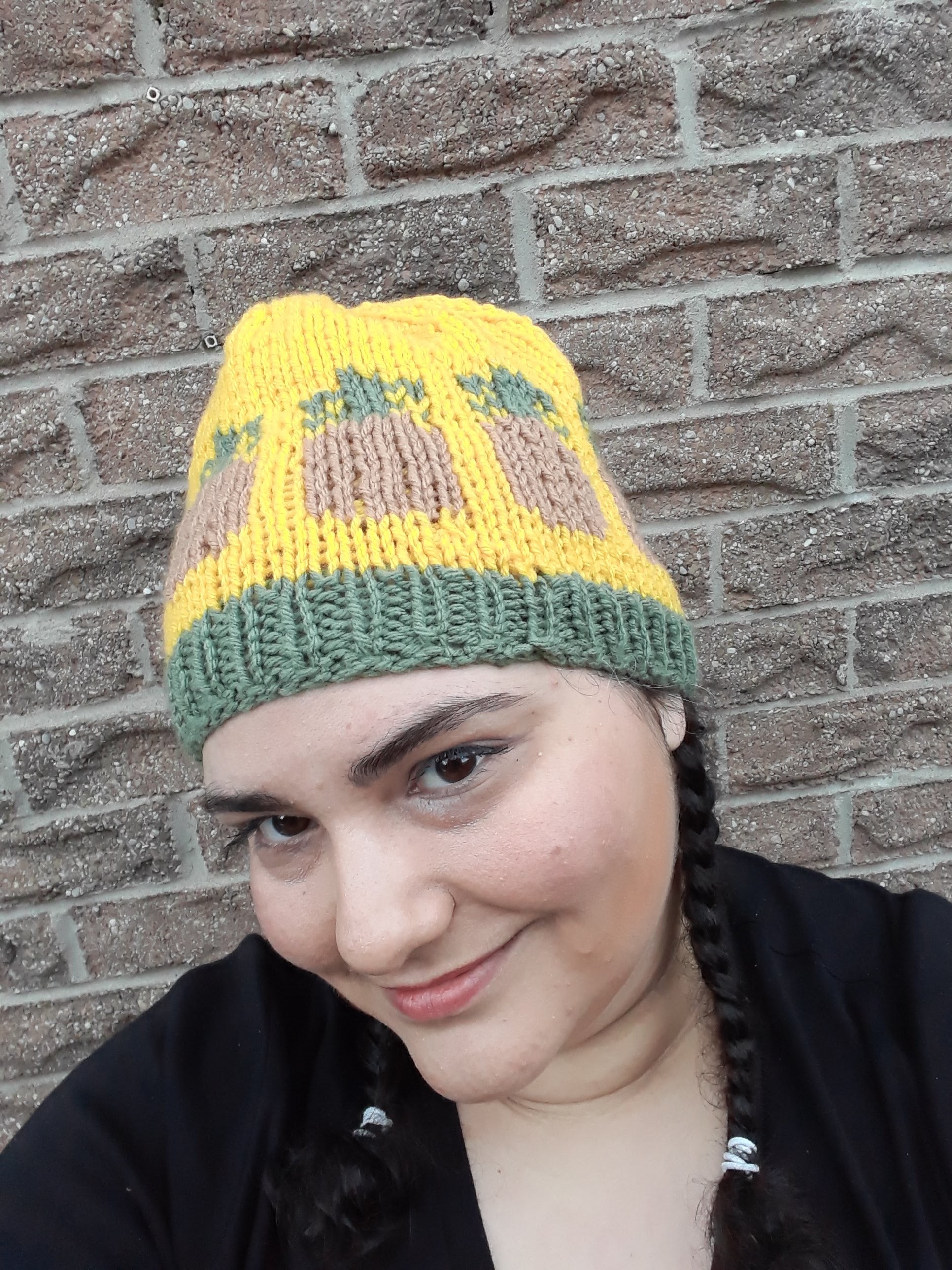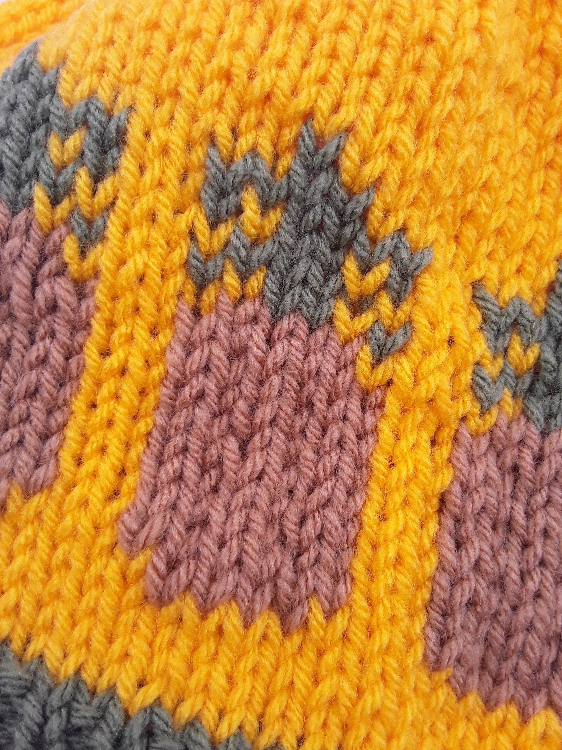 Handknit in Canada, 100% acrylic yarn. Can go in the washing machine; air dry recommended. One size fits most adults.