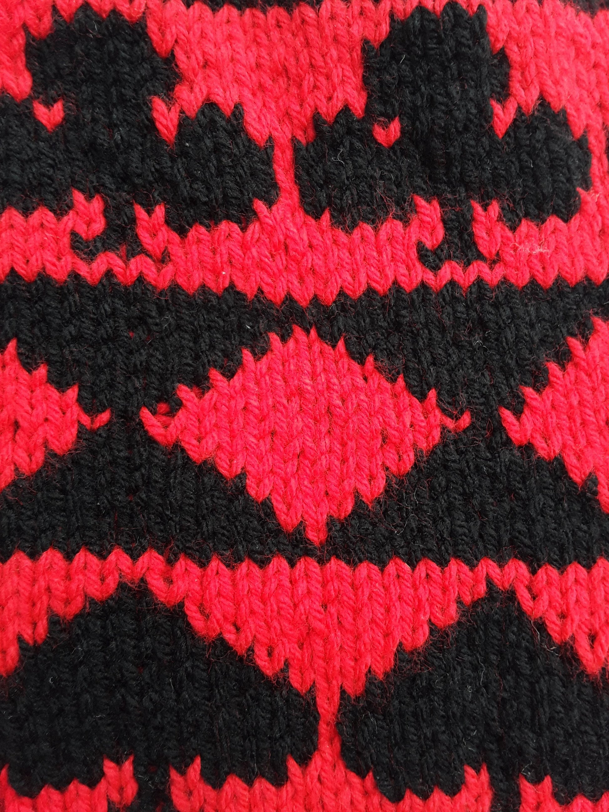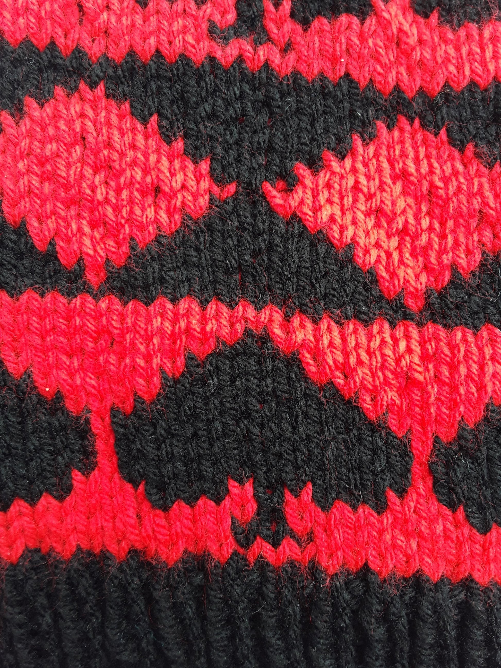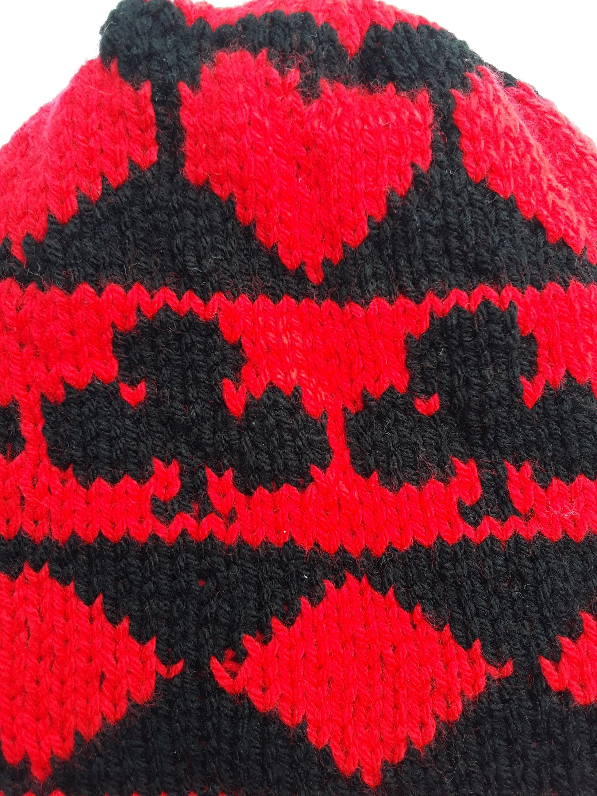 Handknit in Canada, 100% acrylic yarn. Can go in the washing machine; air dry recommended. One size fits most adults.