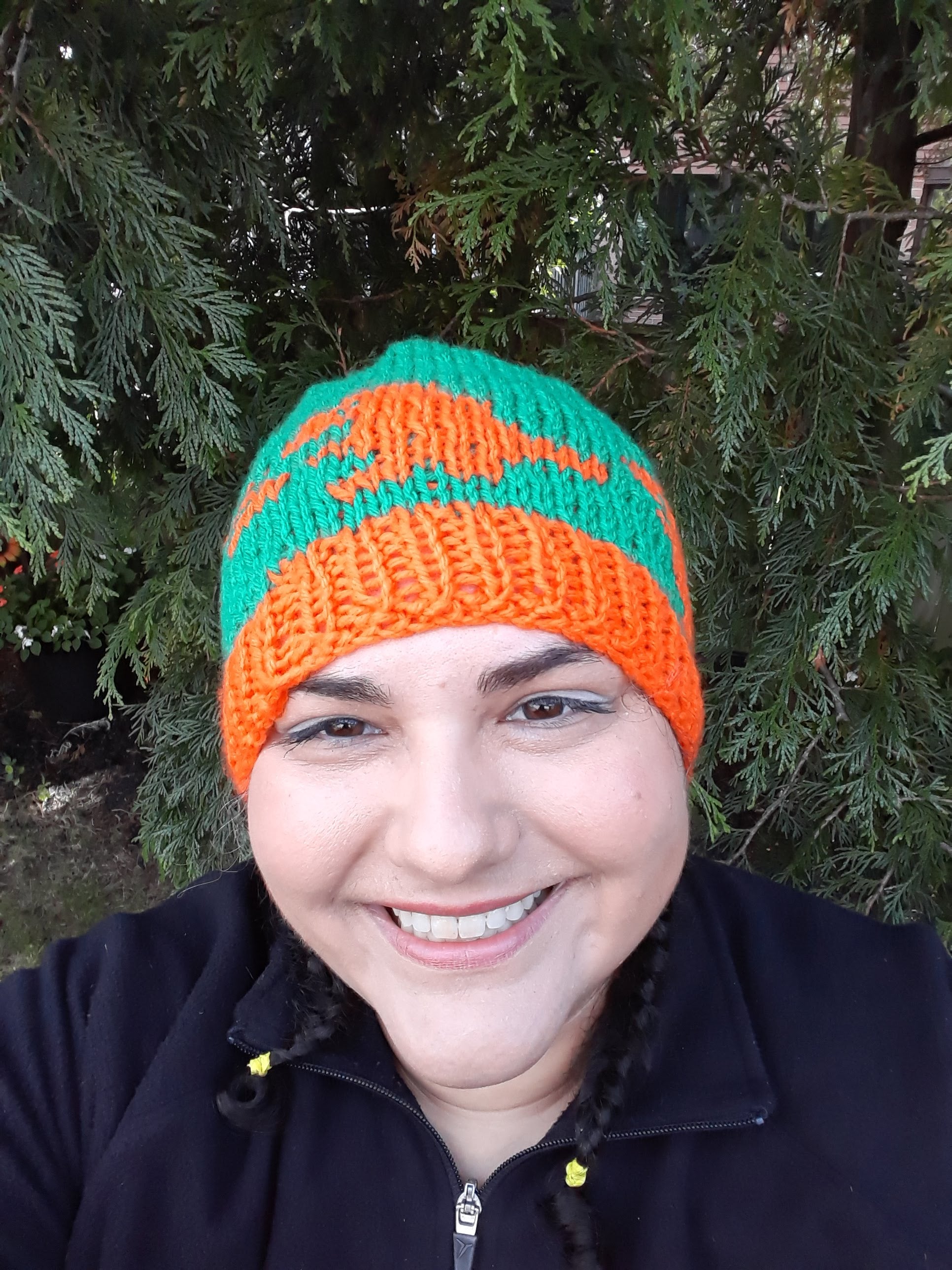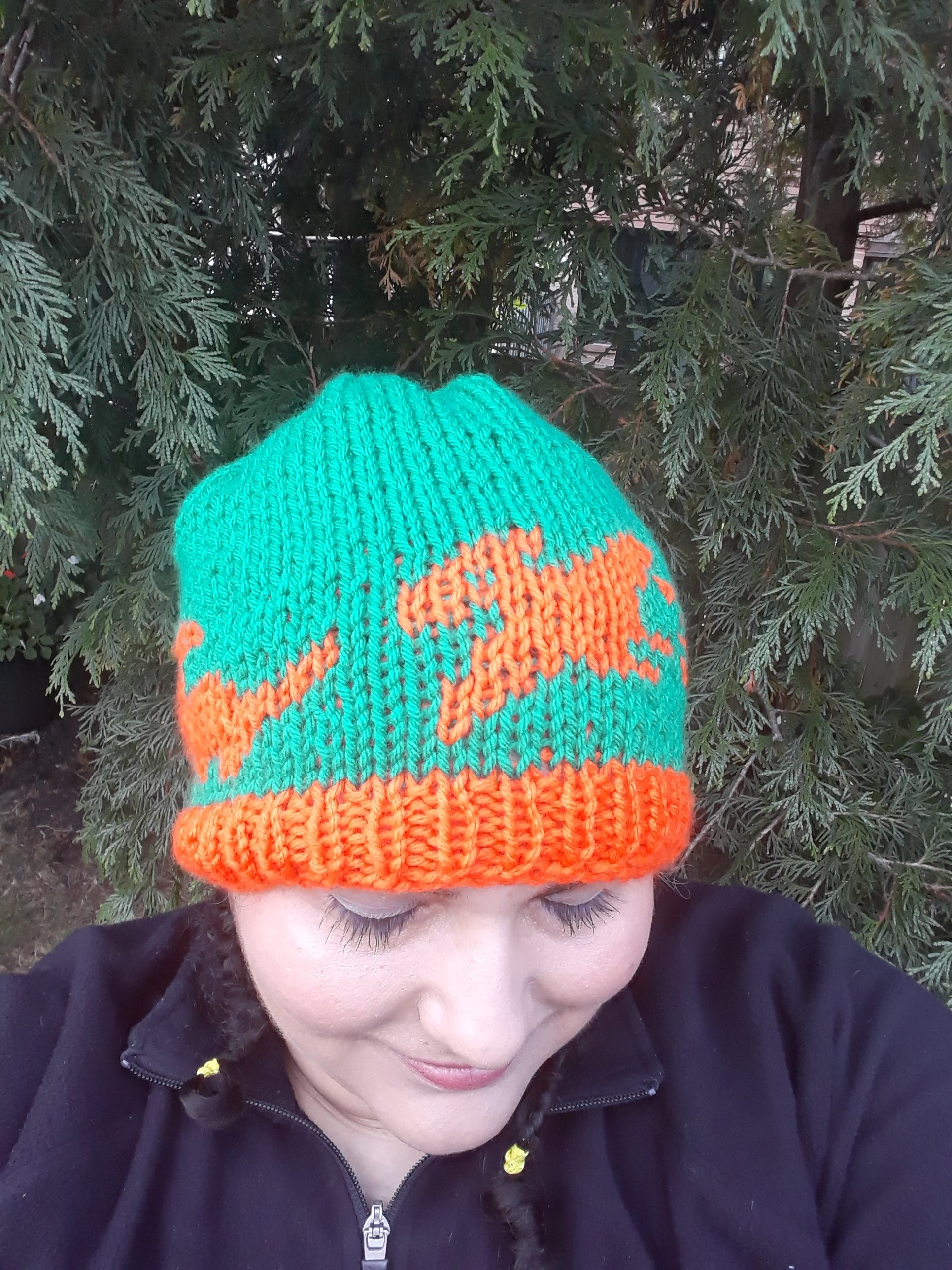 Dinos on parade! This brightly coloured hat features a pterodactyl, a brontosaurus/apatosaurus, a parasaurolophus, and a T-rex. Which one is your fave?
