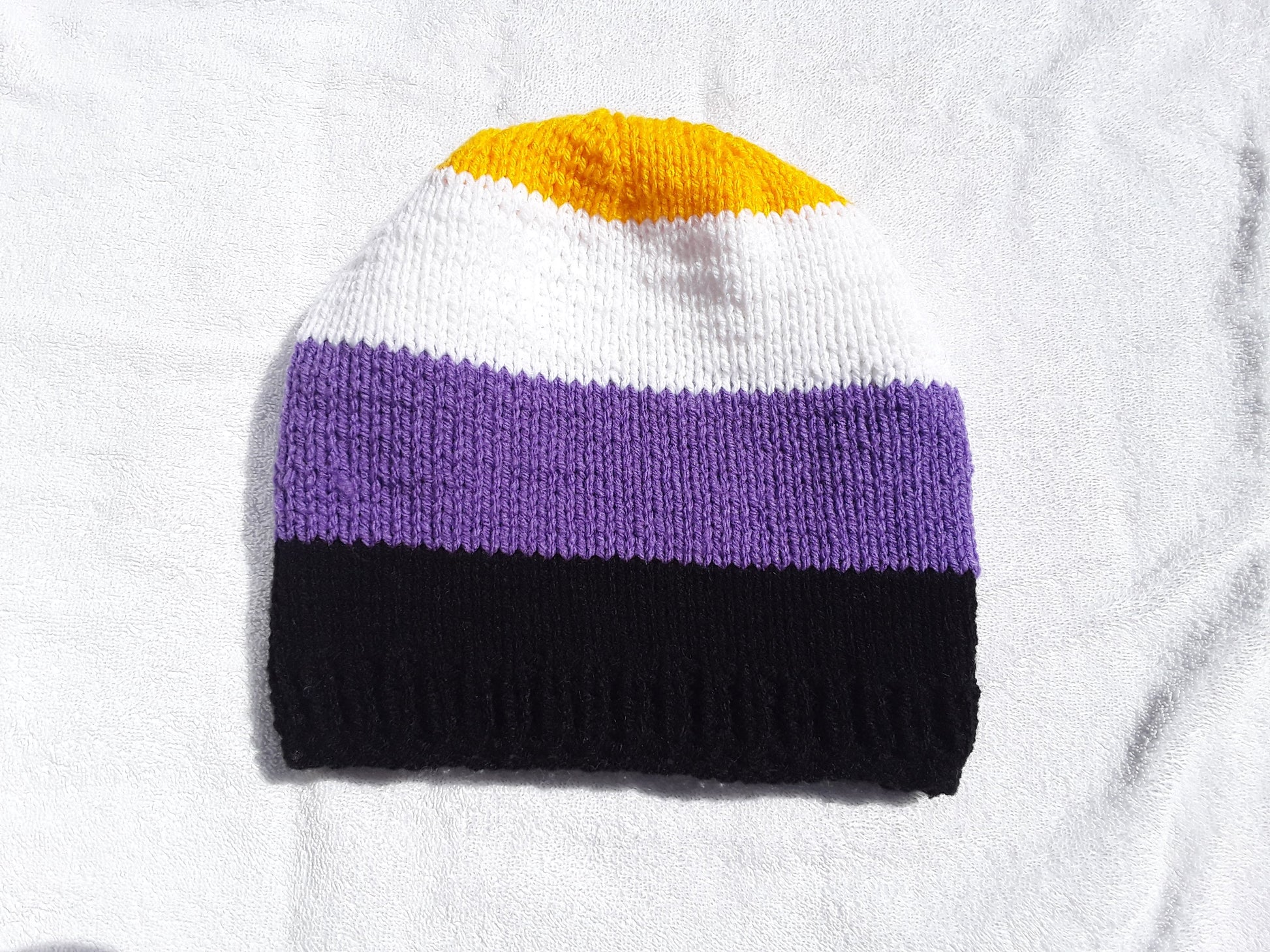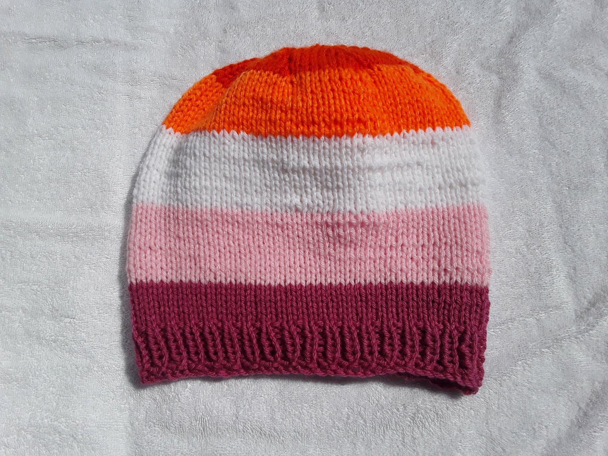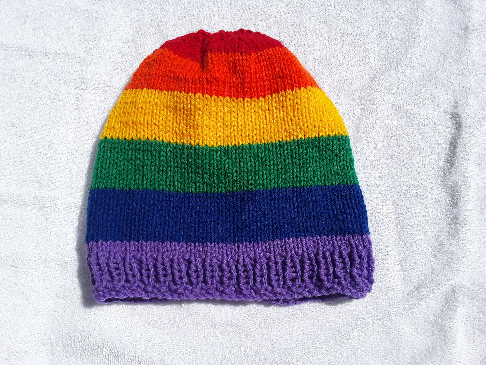 Handknit in Canada, 100% acrylic yarn. Can go in the washing machine; air dry recommended. One size fits most adults.