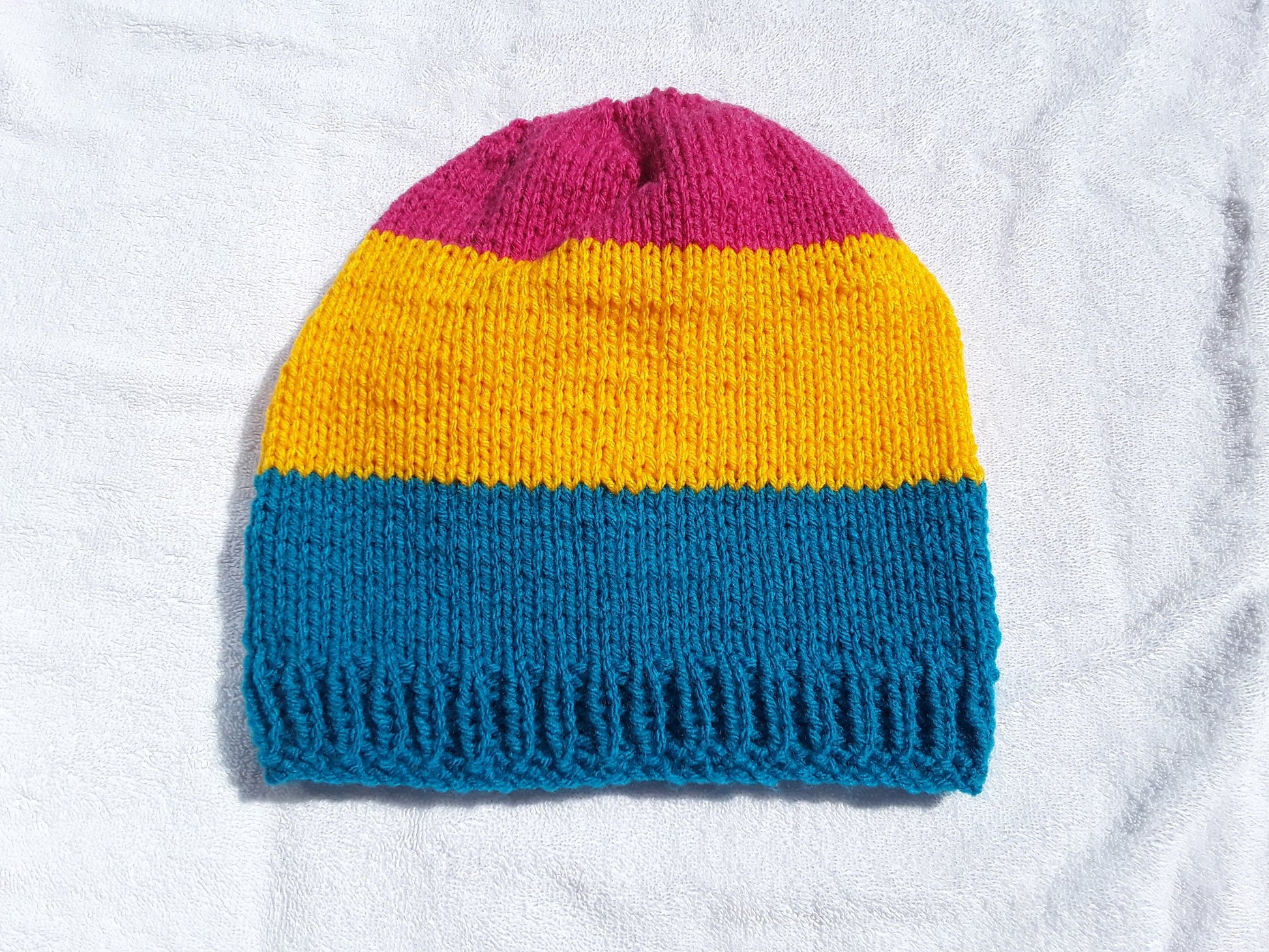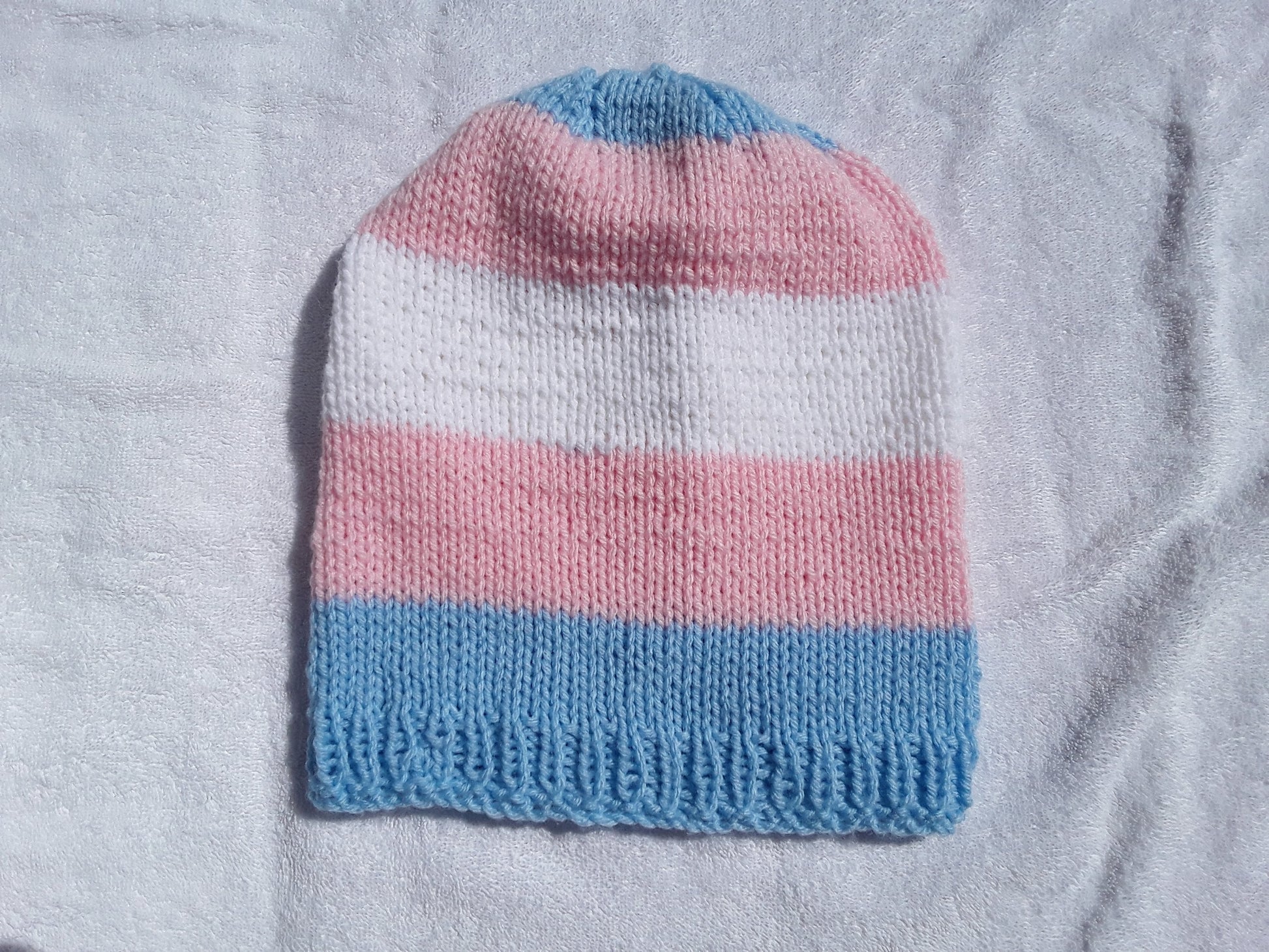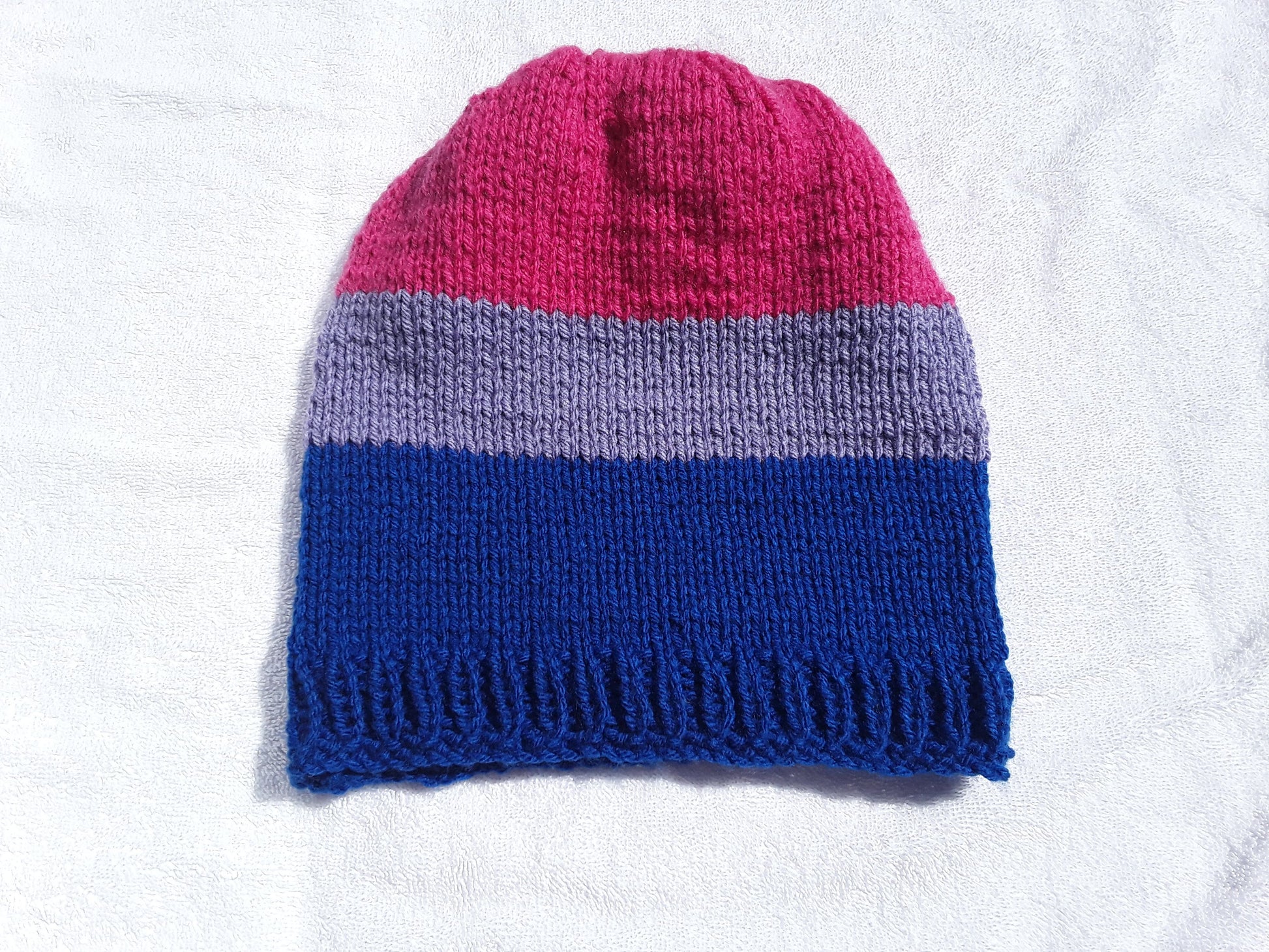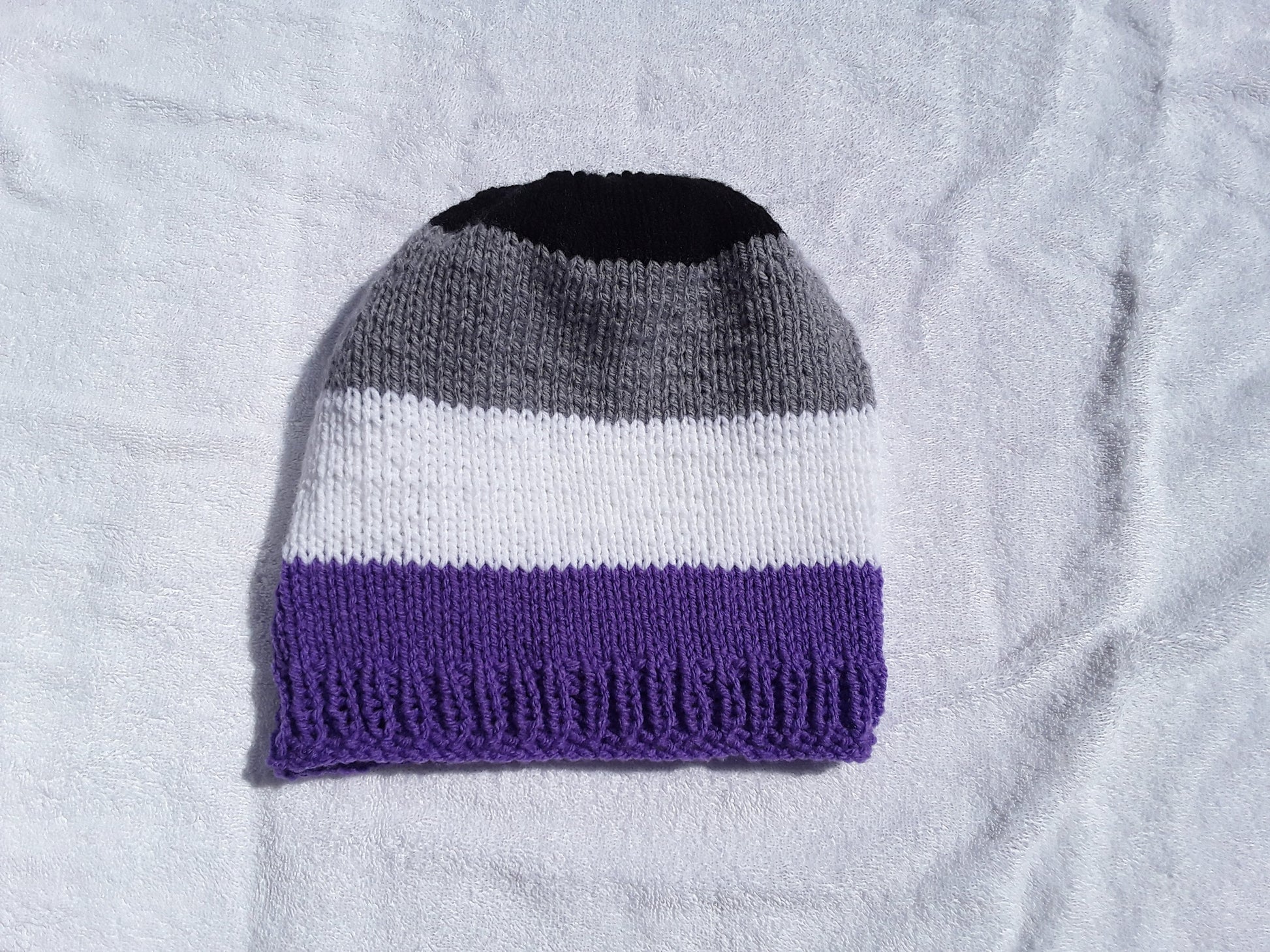 Handknit in Canada, 100% acrylic yarn. Can go in the washing machine; air dry recommended. One size fits most adults.