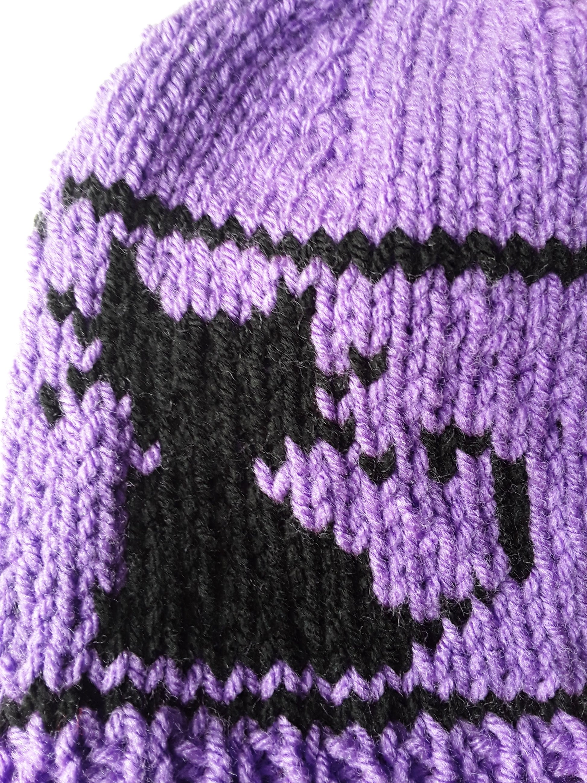 This handmade hat is the purrfect gift for the cat lover in your life. Cute cats cover this vibrant purple hat, making a fashion statement that adds style and whimsy to any outfit. Meow!