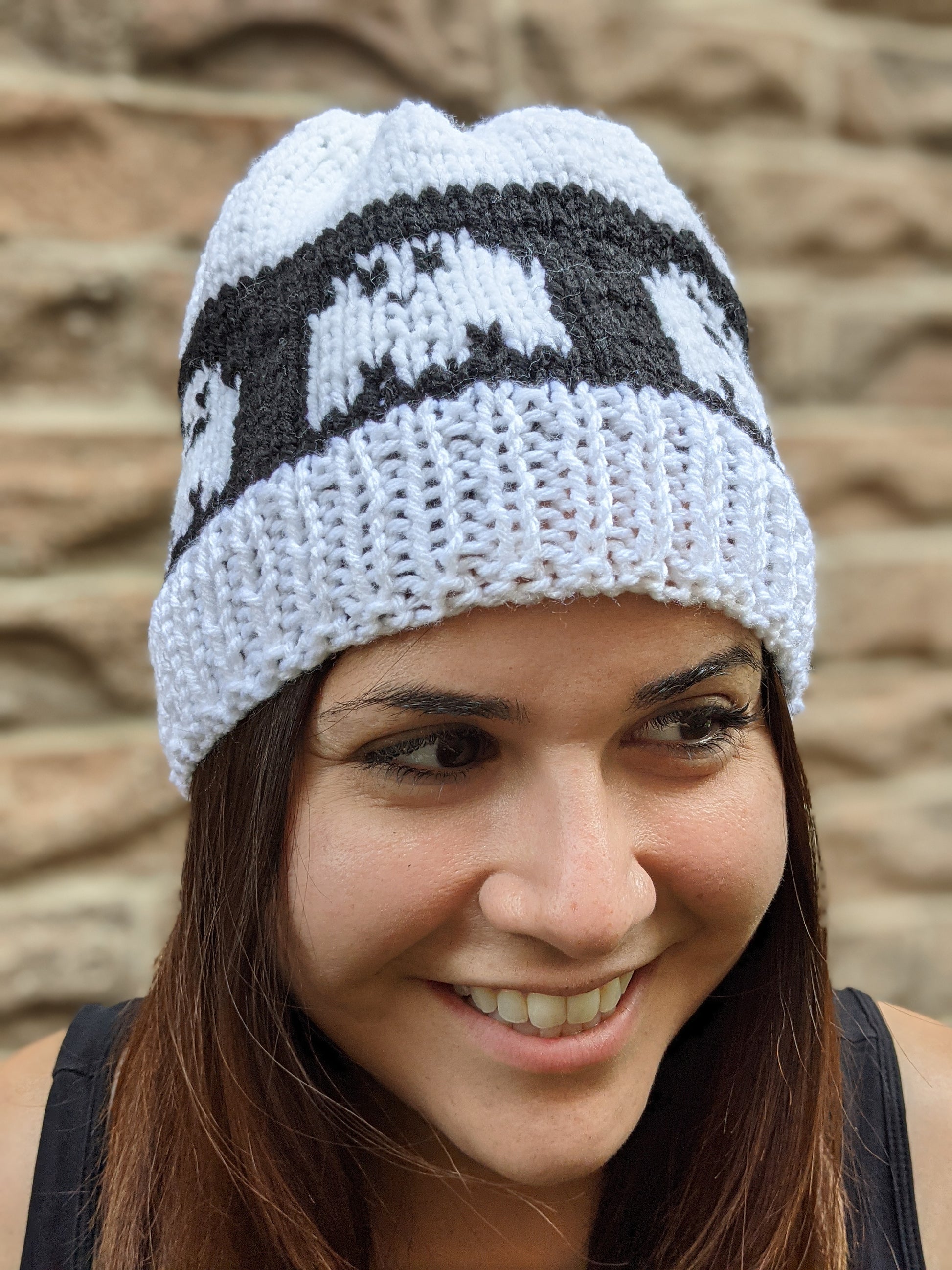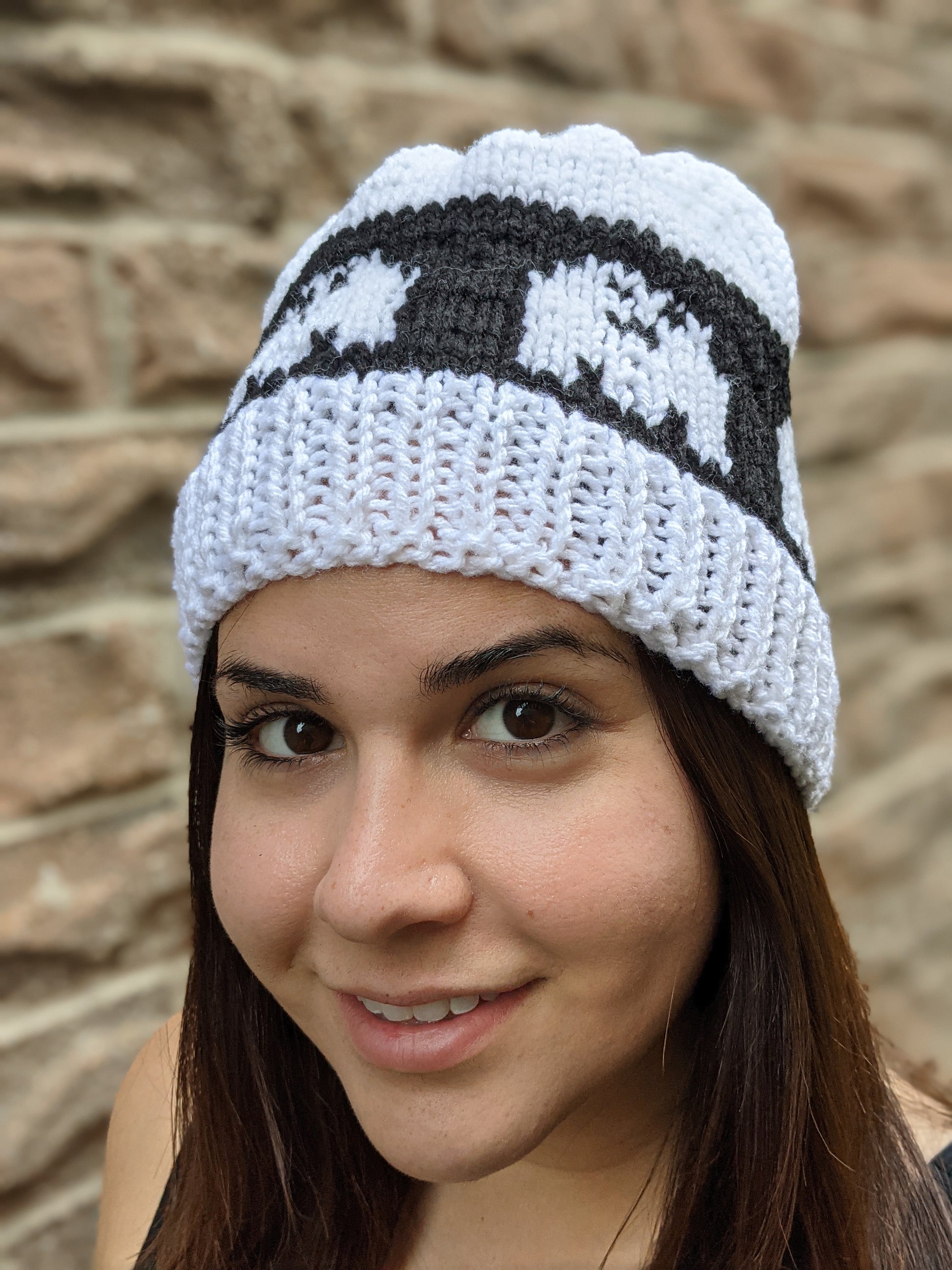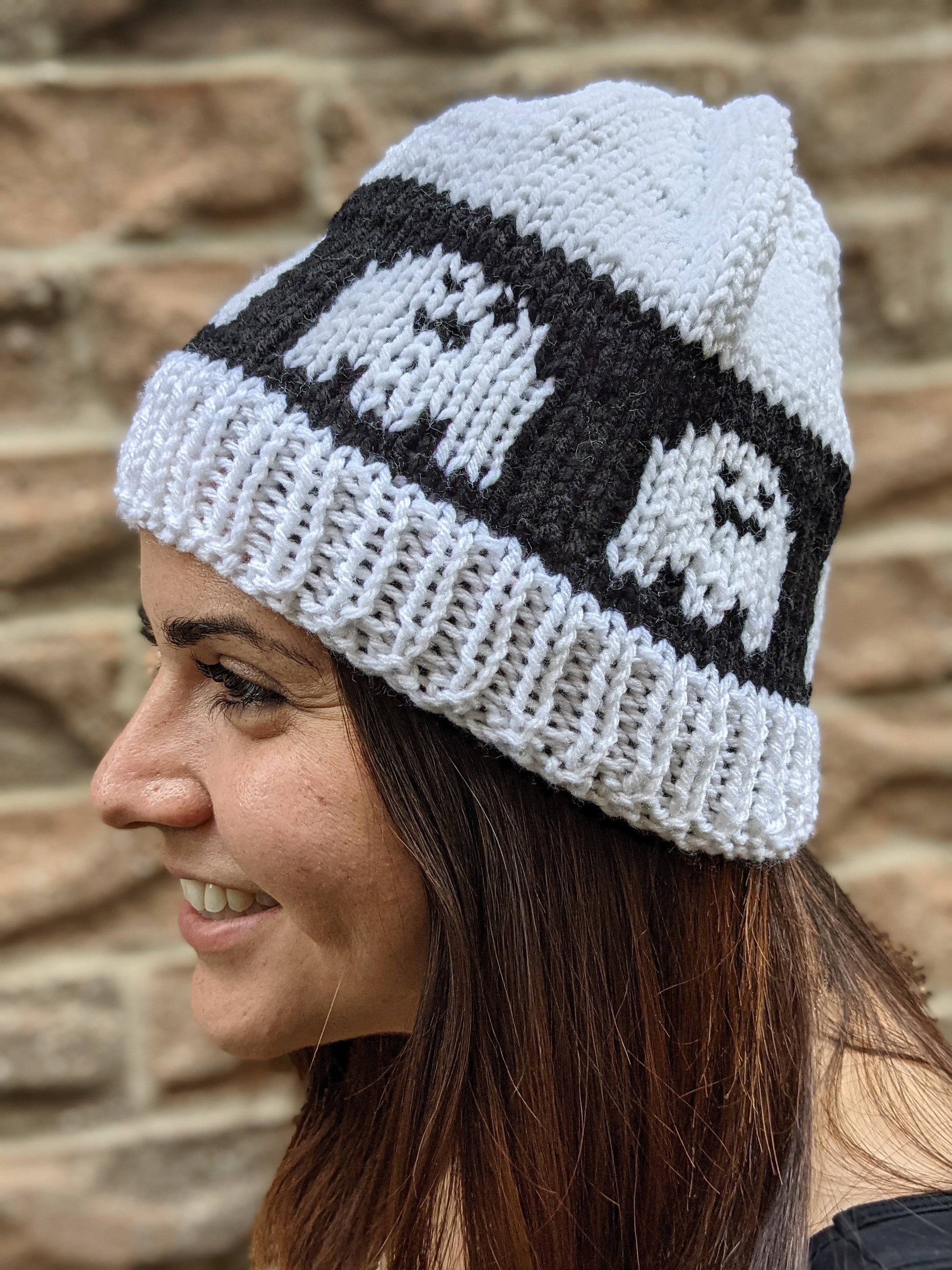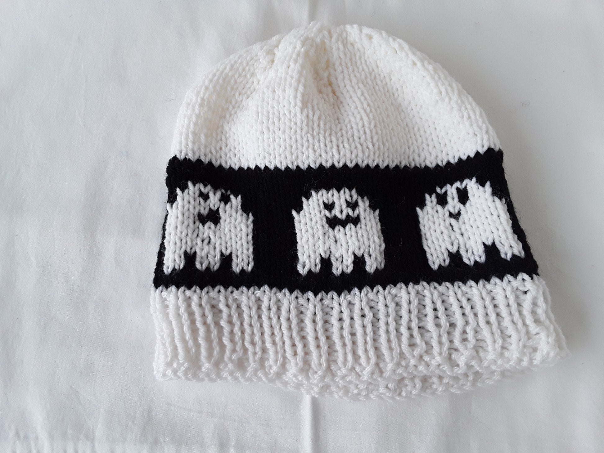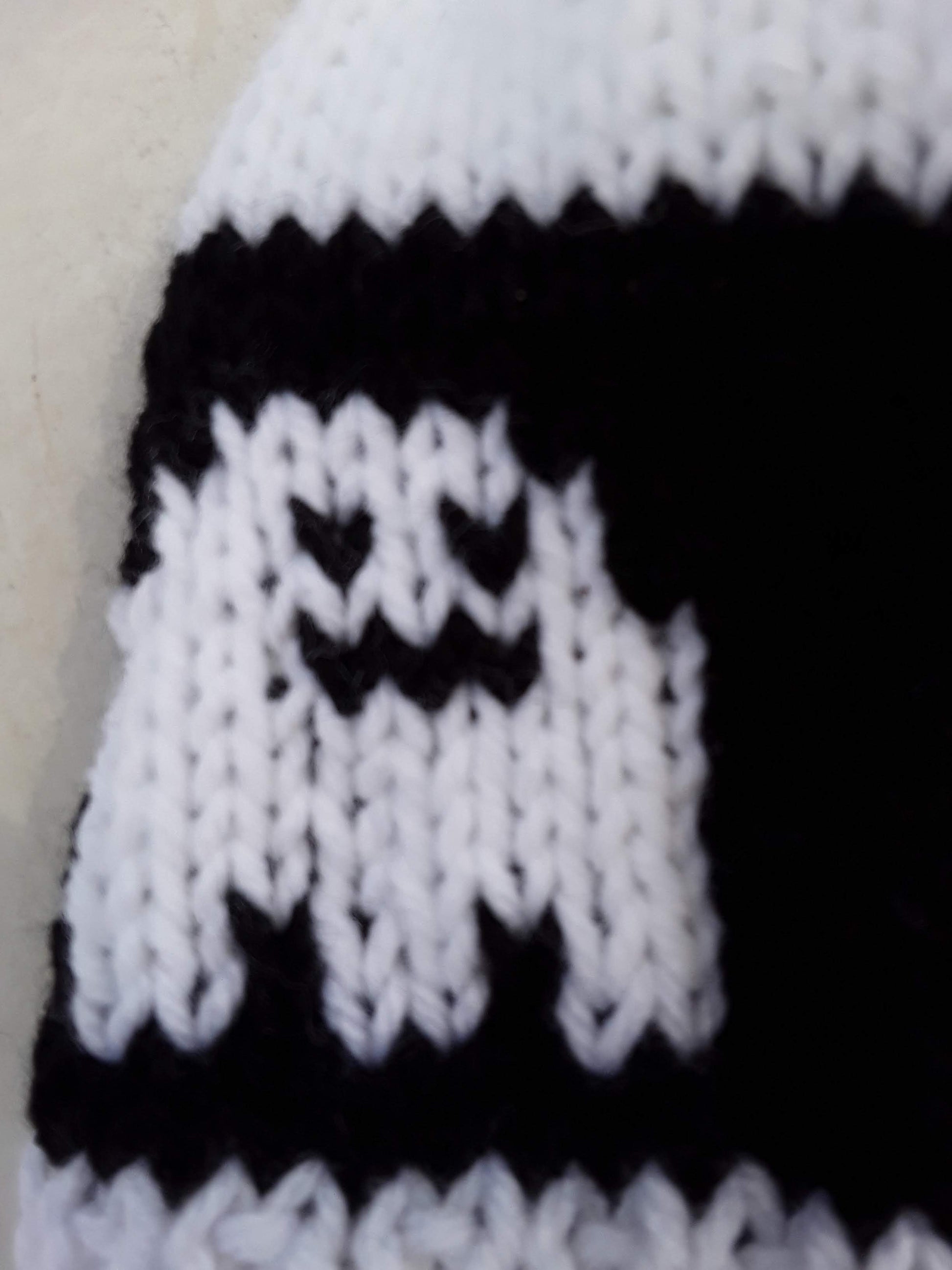 If you want to look hauntingly cool this spooky season, this ghost hat is just the thing for you. The hat's black and white colour scheme matches with any jacket. Featuring six ghosts with various facial expressions, from scary to cute. The wavy pattern on the bottom of each ghost looks like a waving sheet.