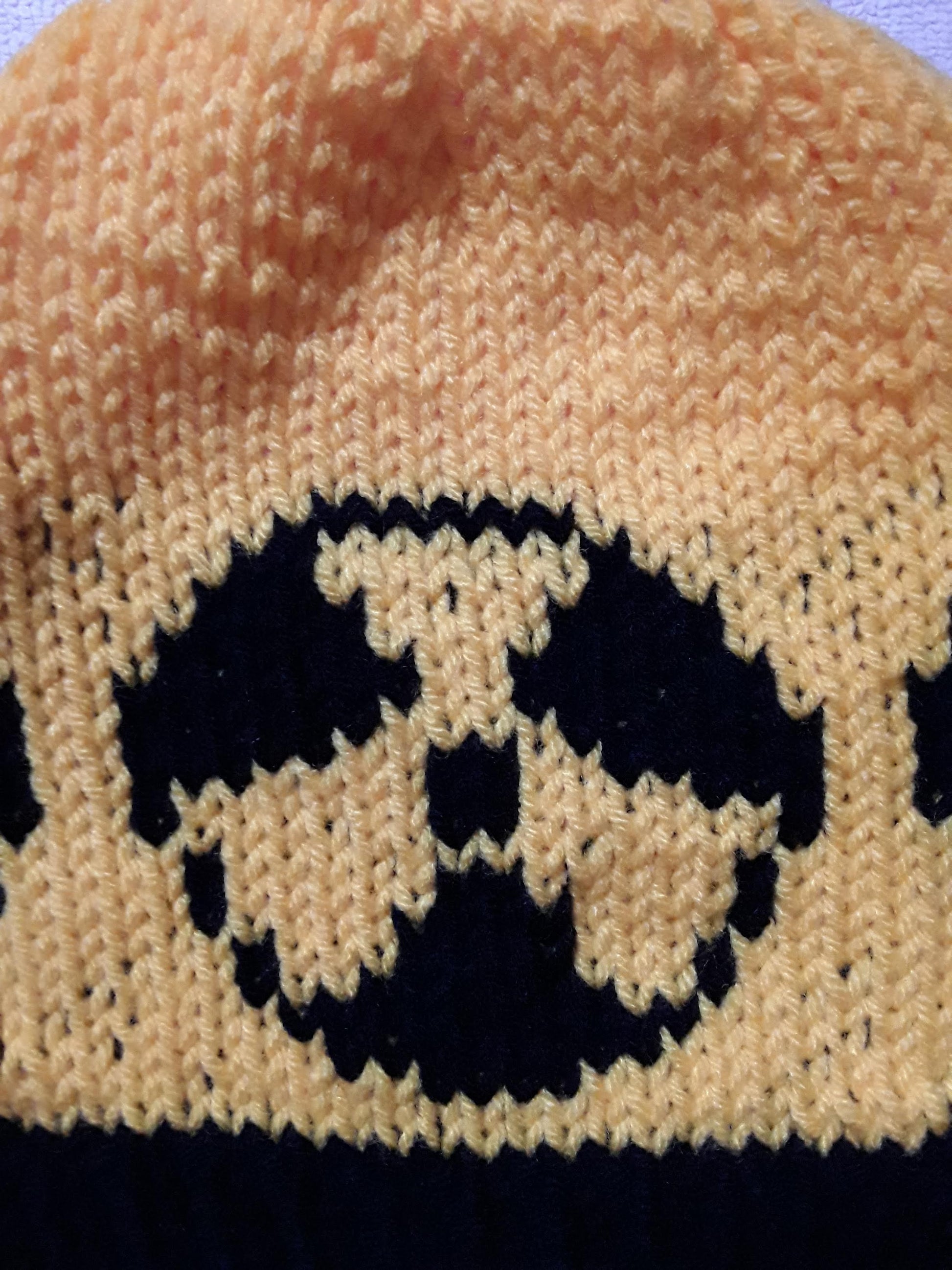 Handknit in Canada, 100% acrylic yarn. Can go in the washing machine; air dry recommended. One size fits most adults.