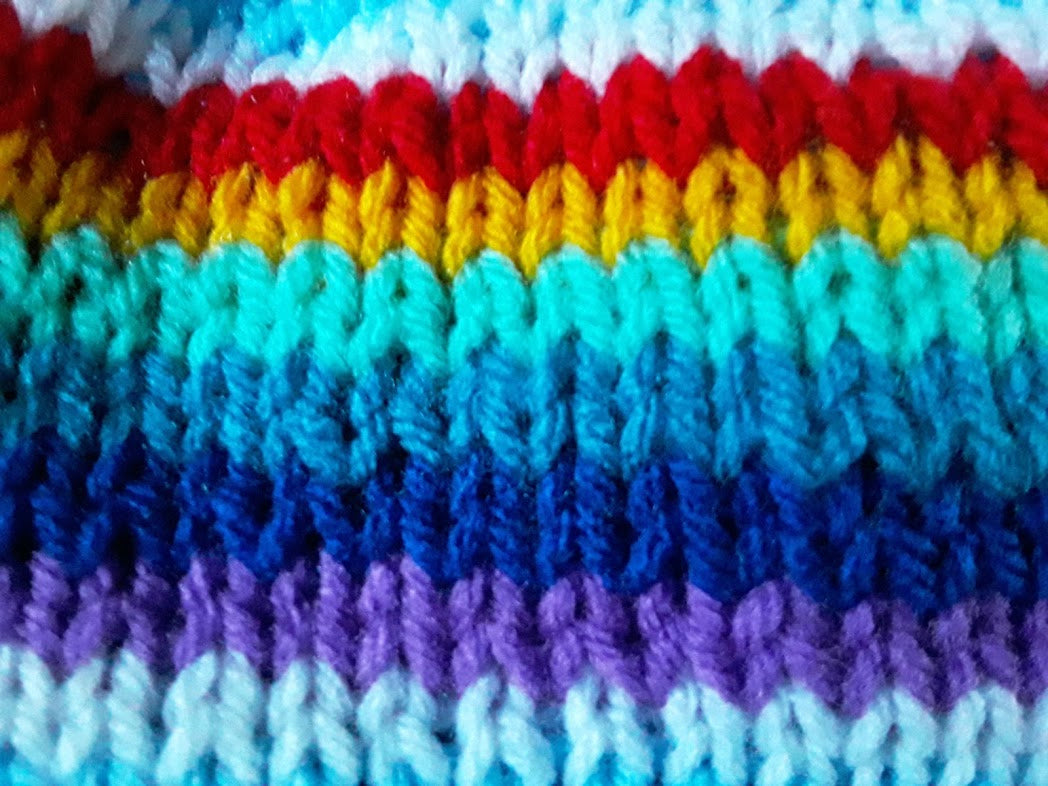 This handmade skater hat features a vibrant rainbow stripe against a sky blue background. The rib knit band at the bottom looks like fluffy white clouds and keeps the hat comfortably on your head.