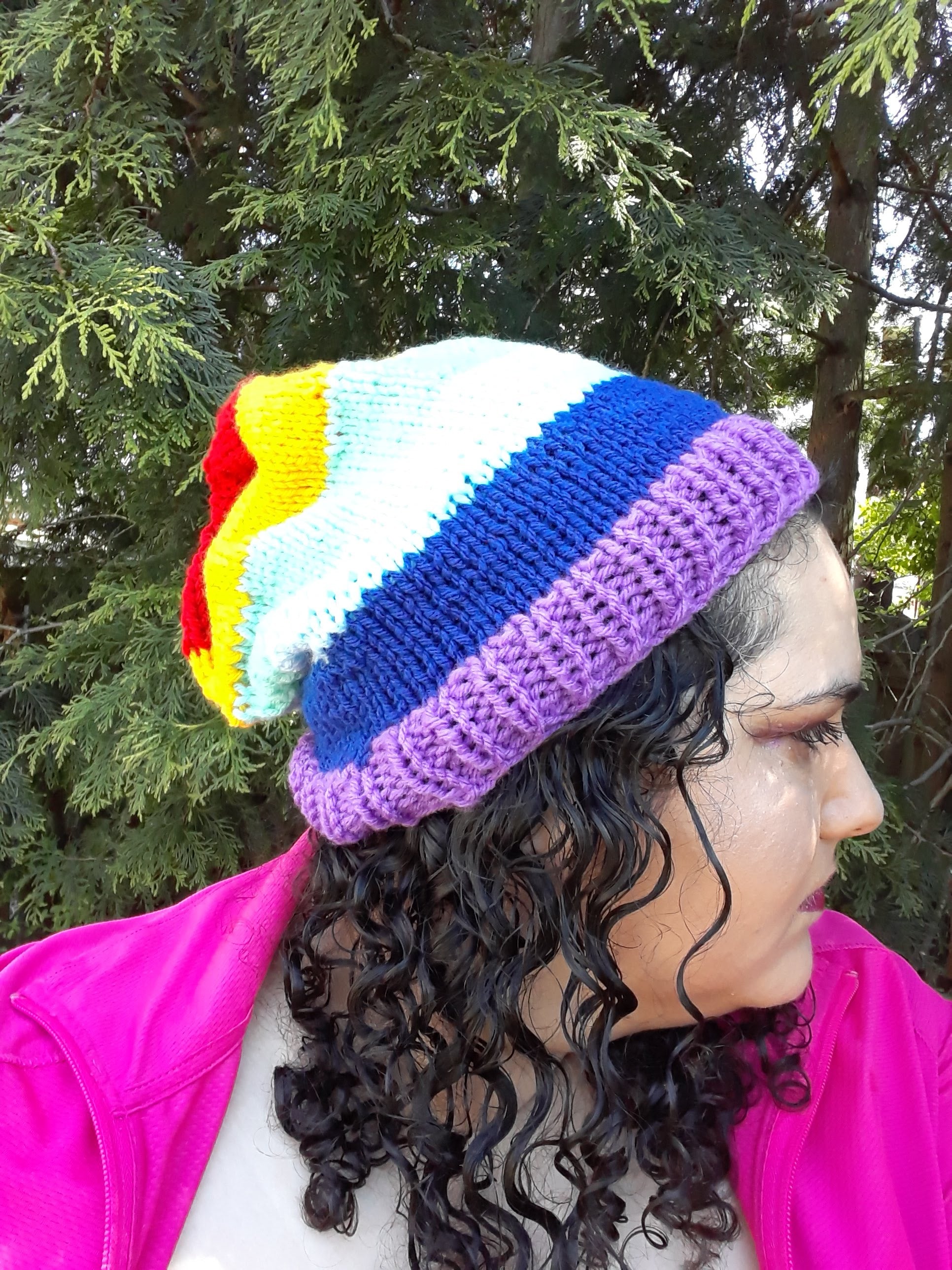 Nothing brightens up your day like a cool rainbow hat! Fun stripes of colourful yarn make up this comfy slouchy beanie. The variety of colours means it's sure to match whatever you're wearing. This hat is perfect for weekend fun.
