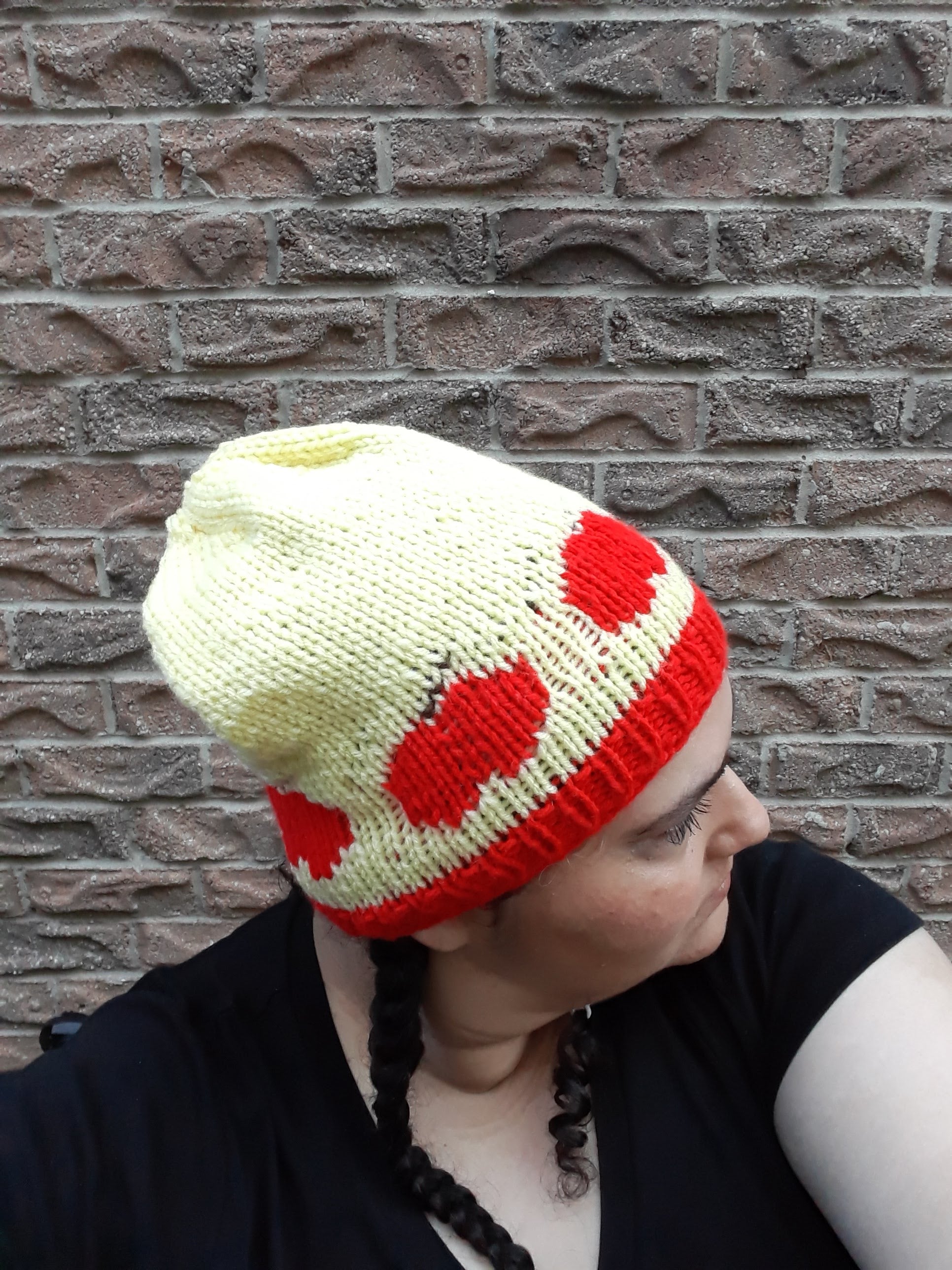 Handknit in Canada, 100% acrylic yarn. Can go in the washing machine; air dry recommended. One size fits most adults.