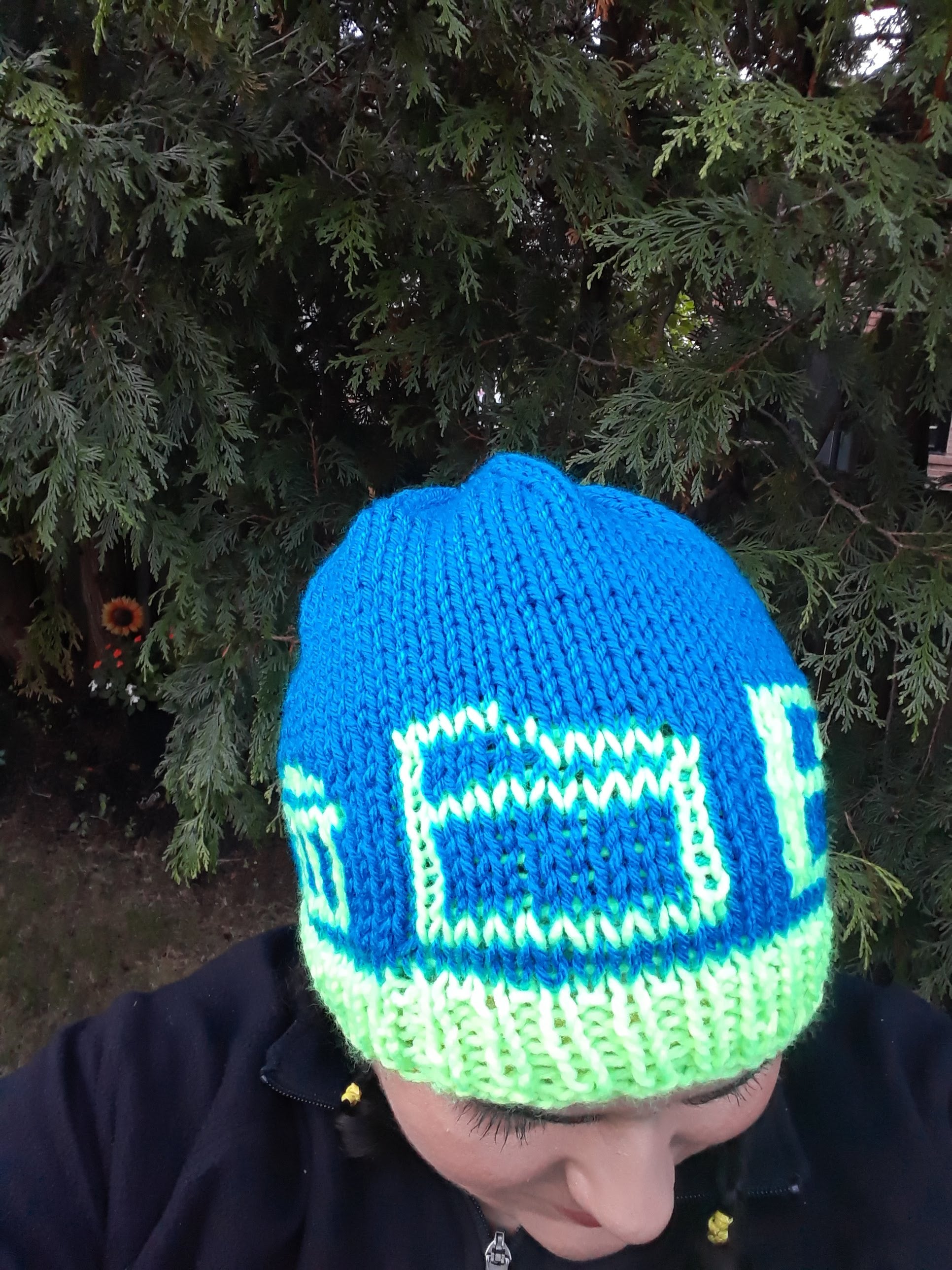 Handknit in Canada, 100% acrylic yarn. Can go in the washing machine; air dry recommended. One size fits most adults.