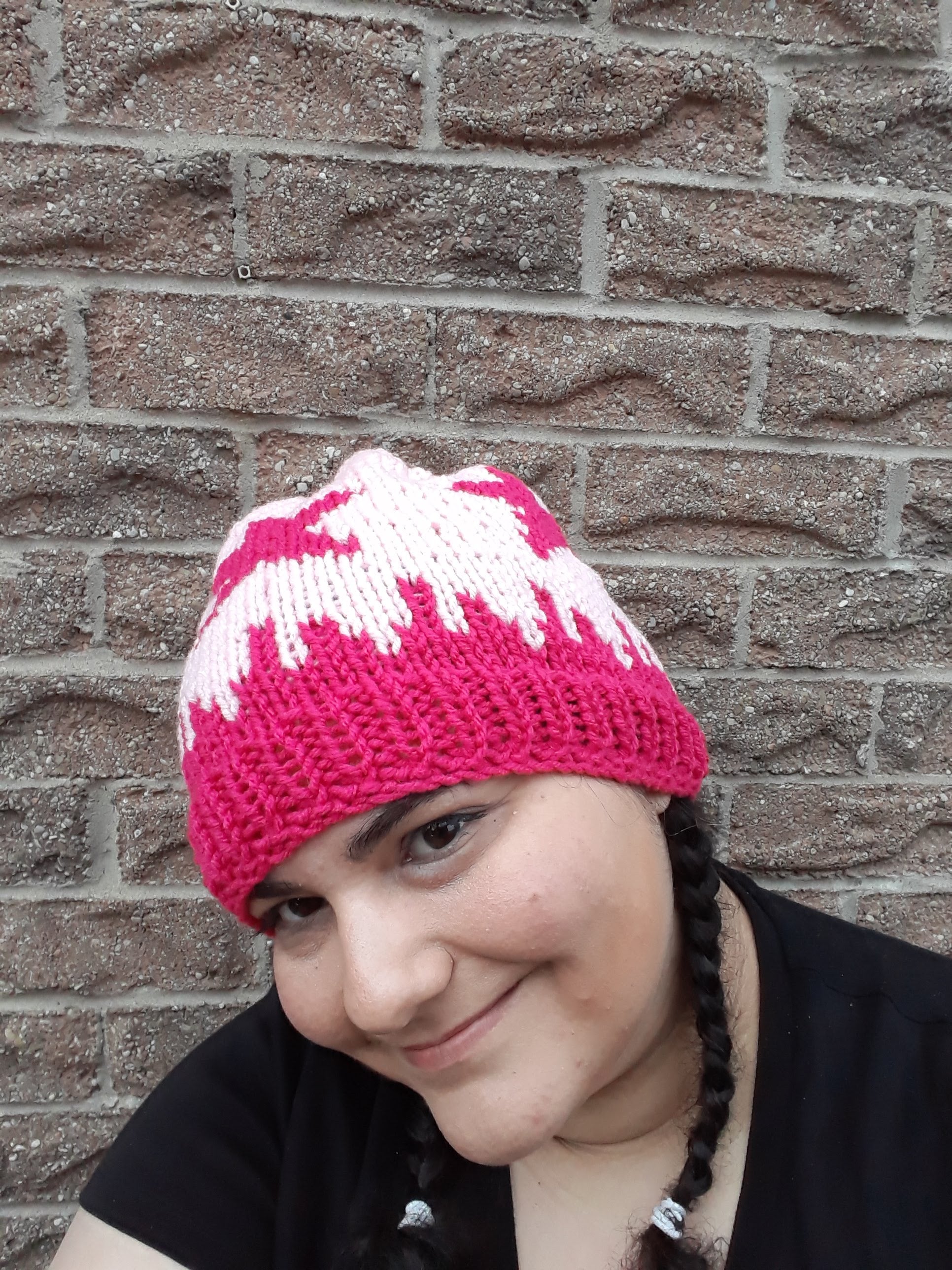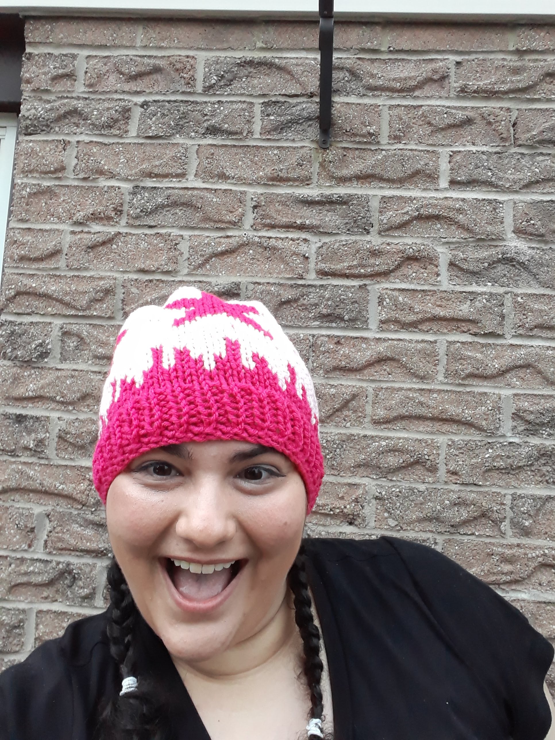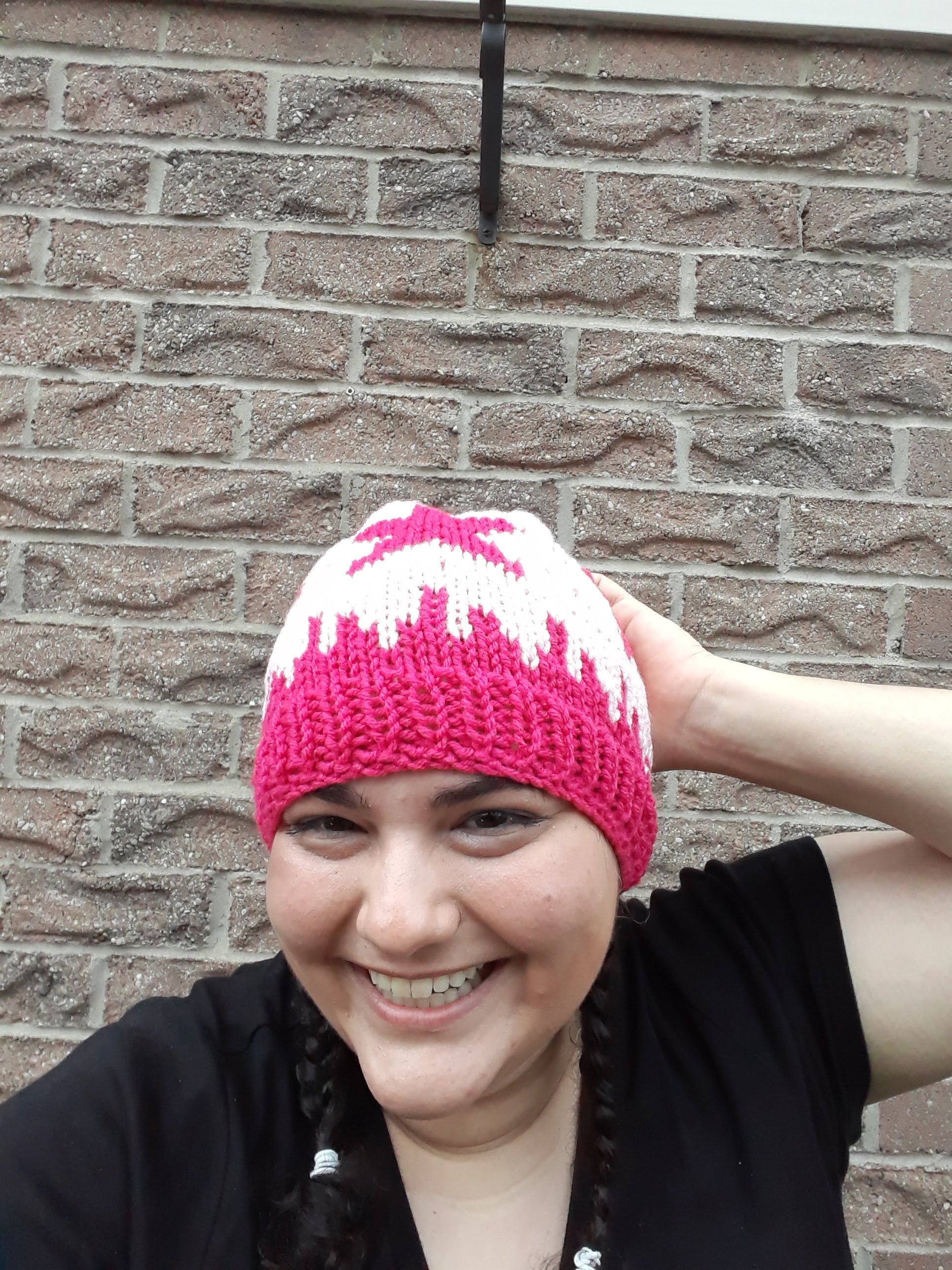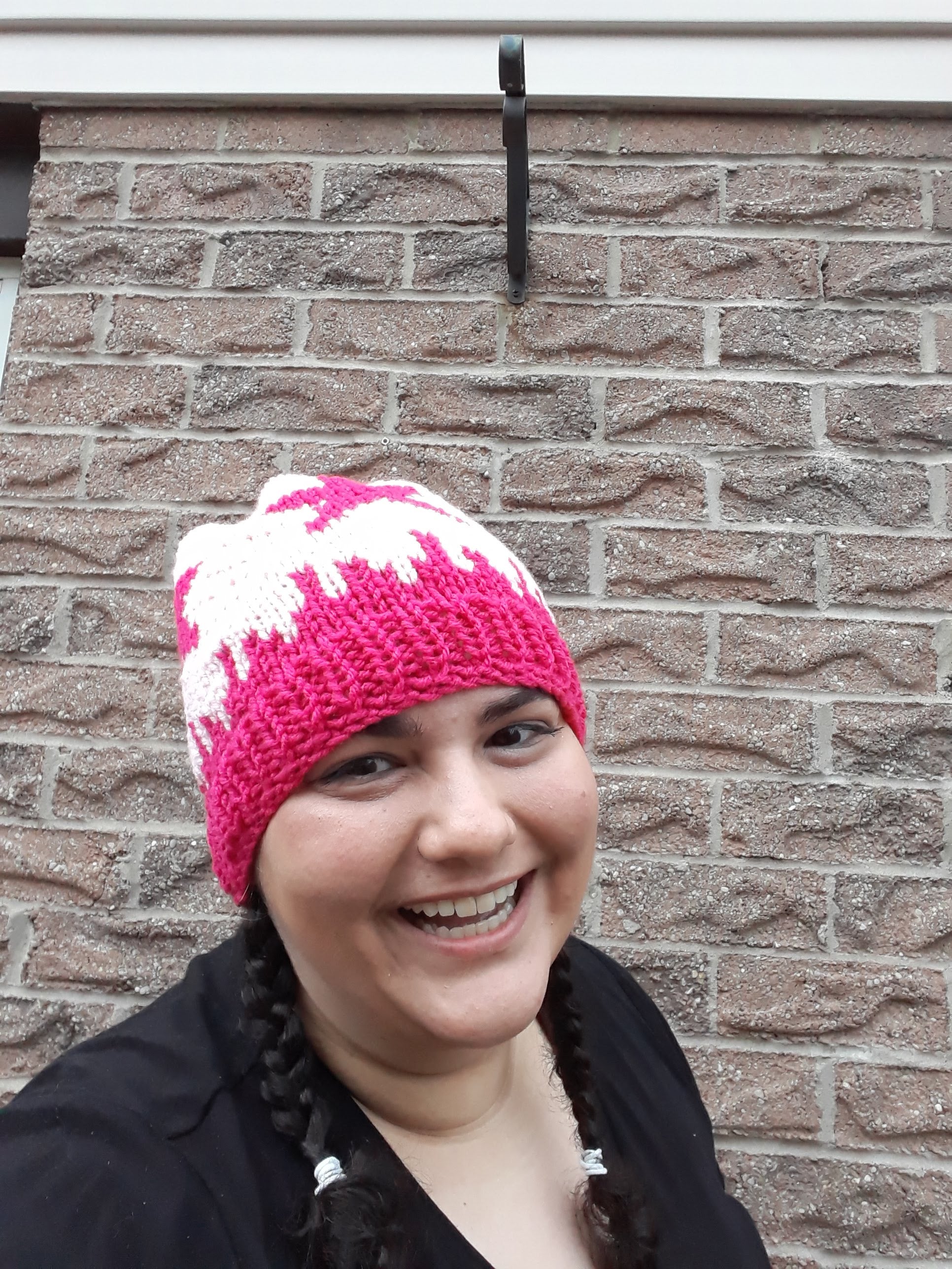 Handknit in Canada, 100% acrylic yarn. Can go in the washing machine; air dry recommended. One size fits most adults.