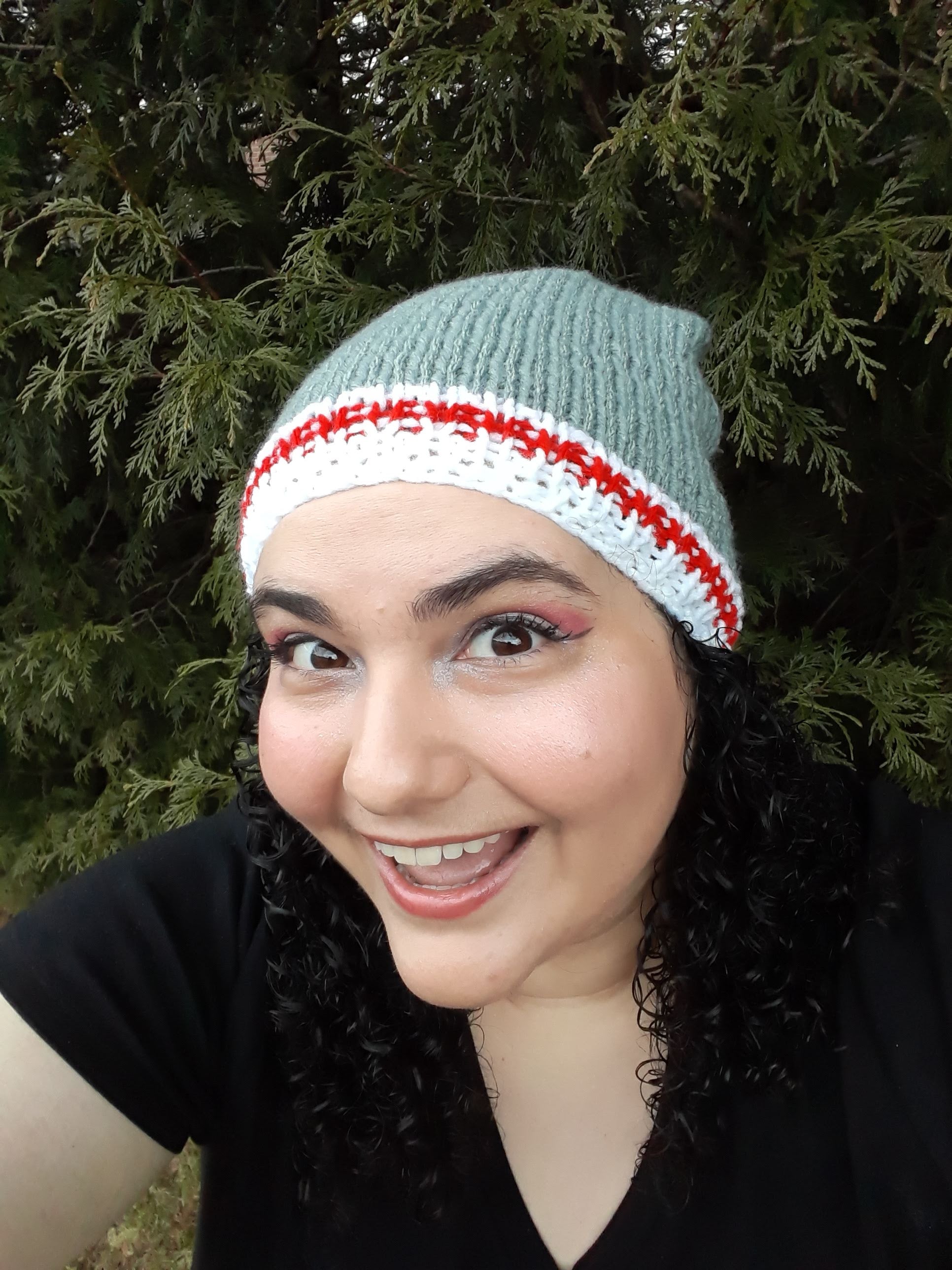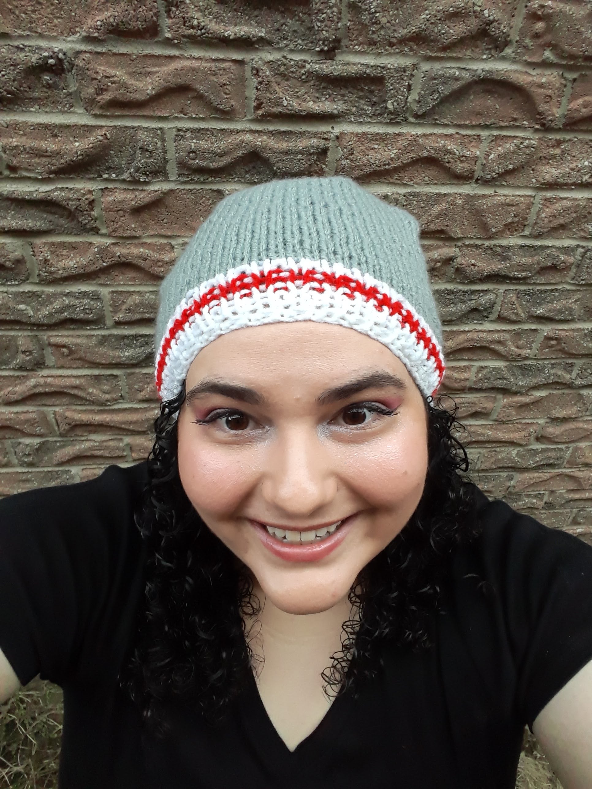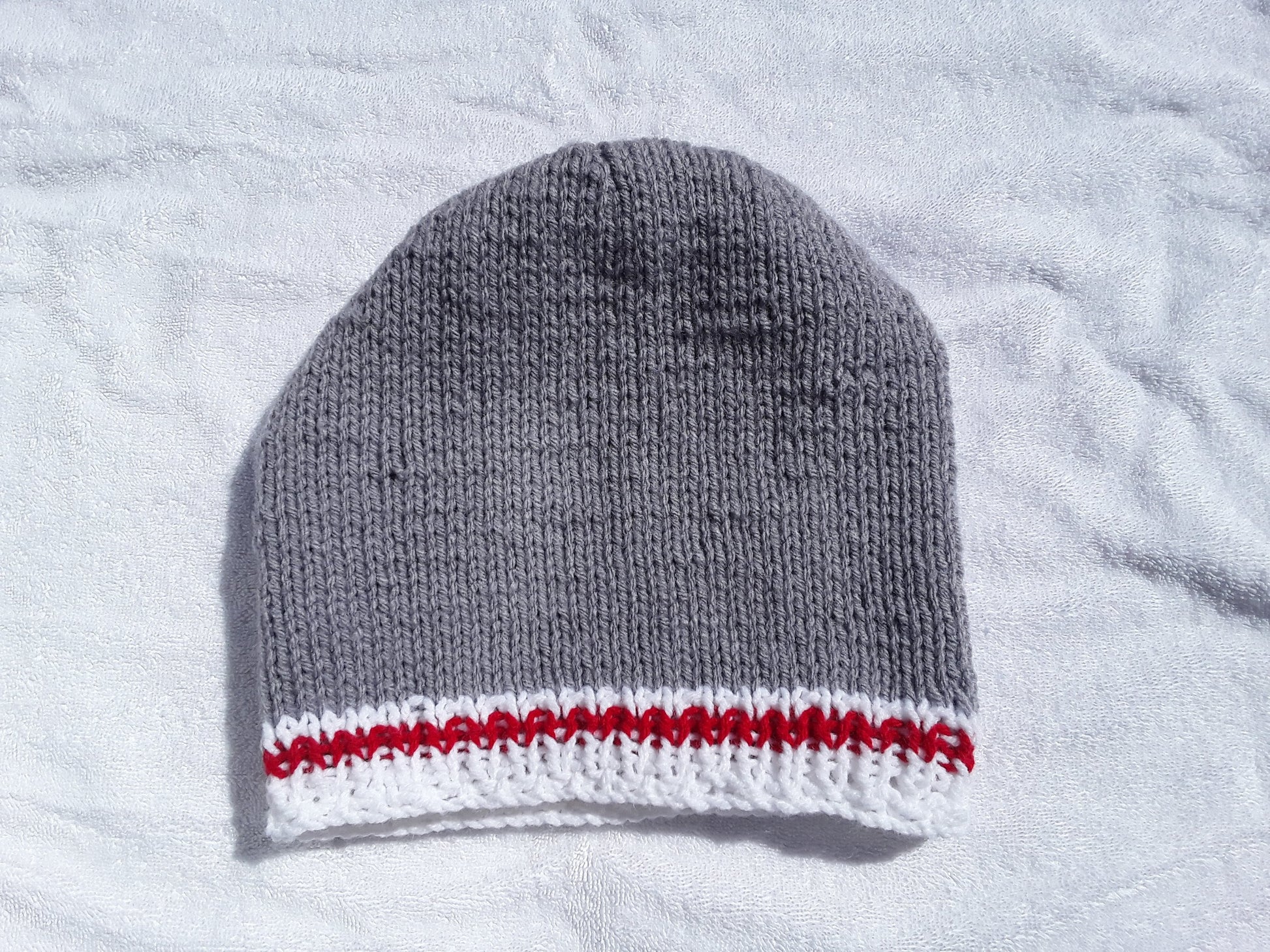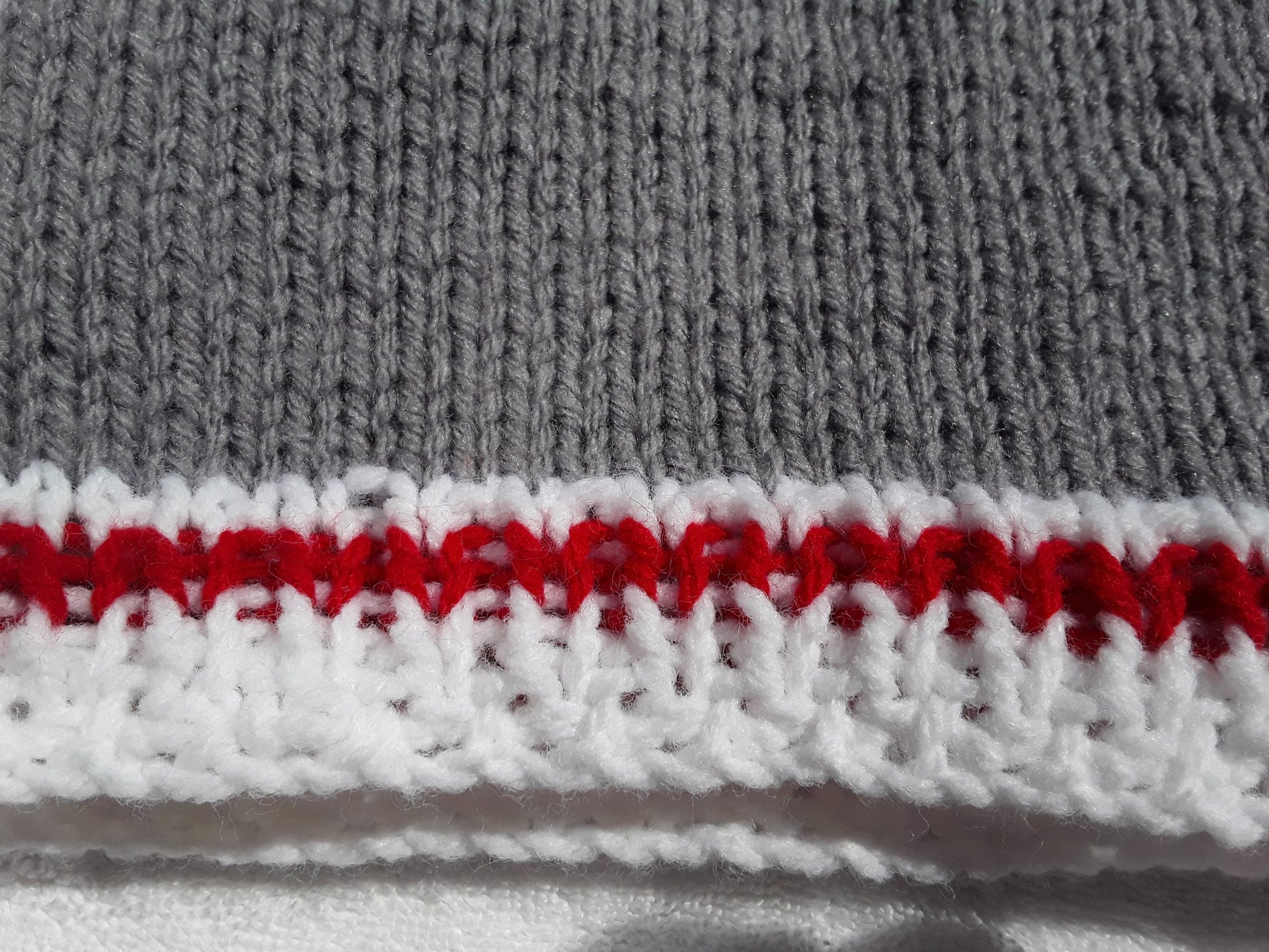 Handknit in Canada, 100% acrylic yarn. Can go in the washing machine; air dry recommended. One size fits most adults.