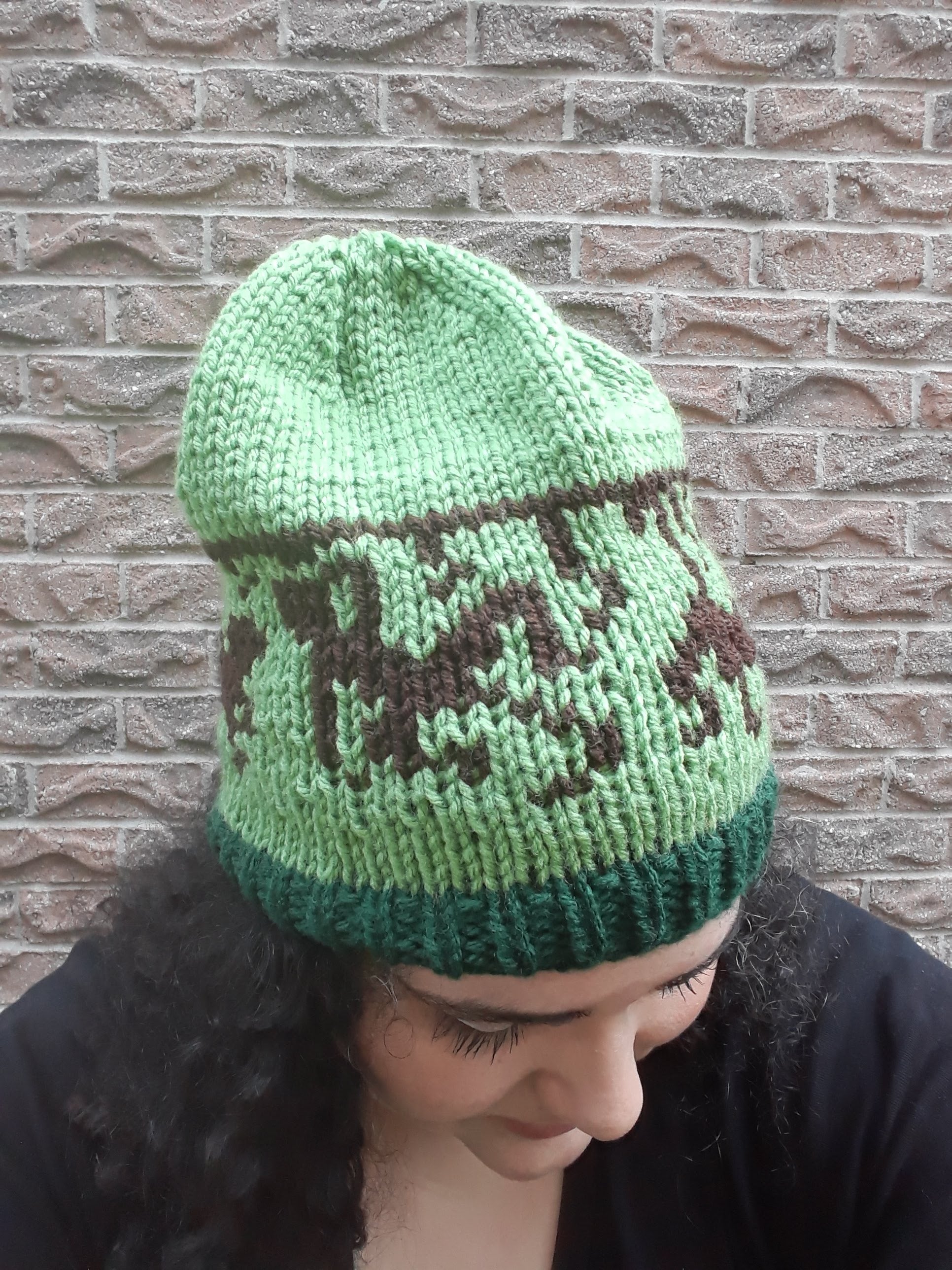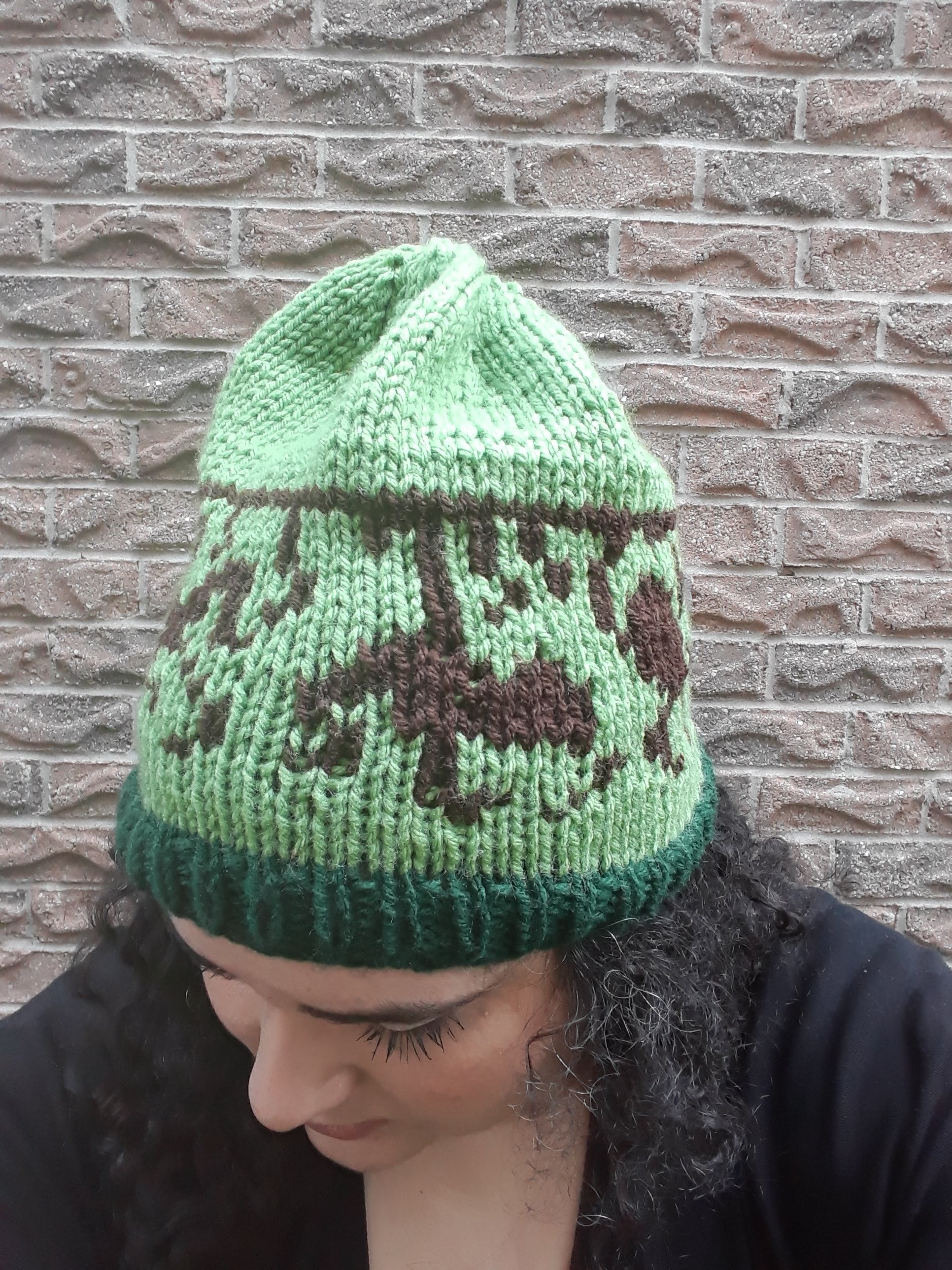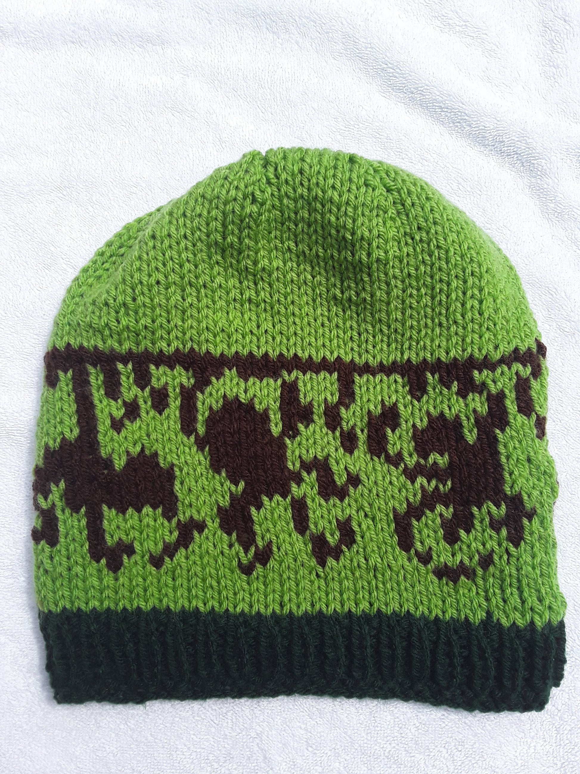 Handknit in Canada, 100% acrylic yarn. Can go in the washing machine; air dry recommended. One size fits most adults.
