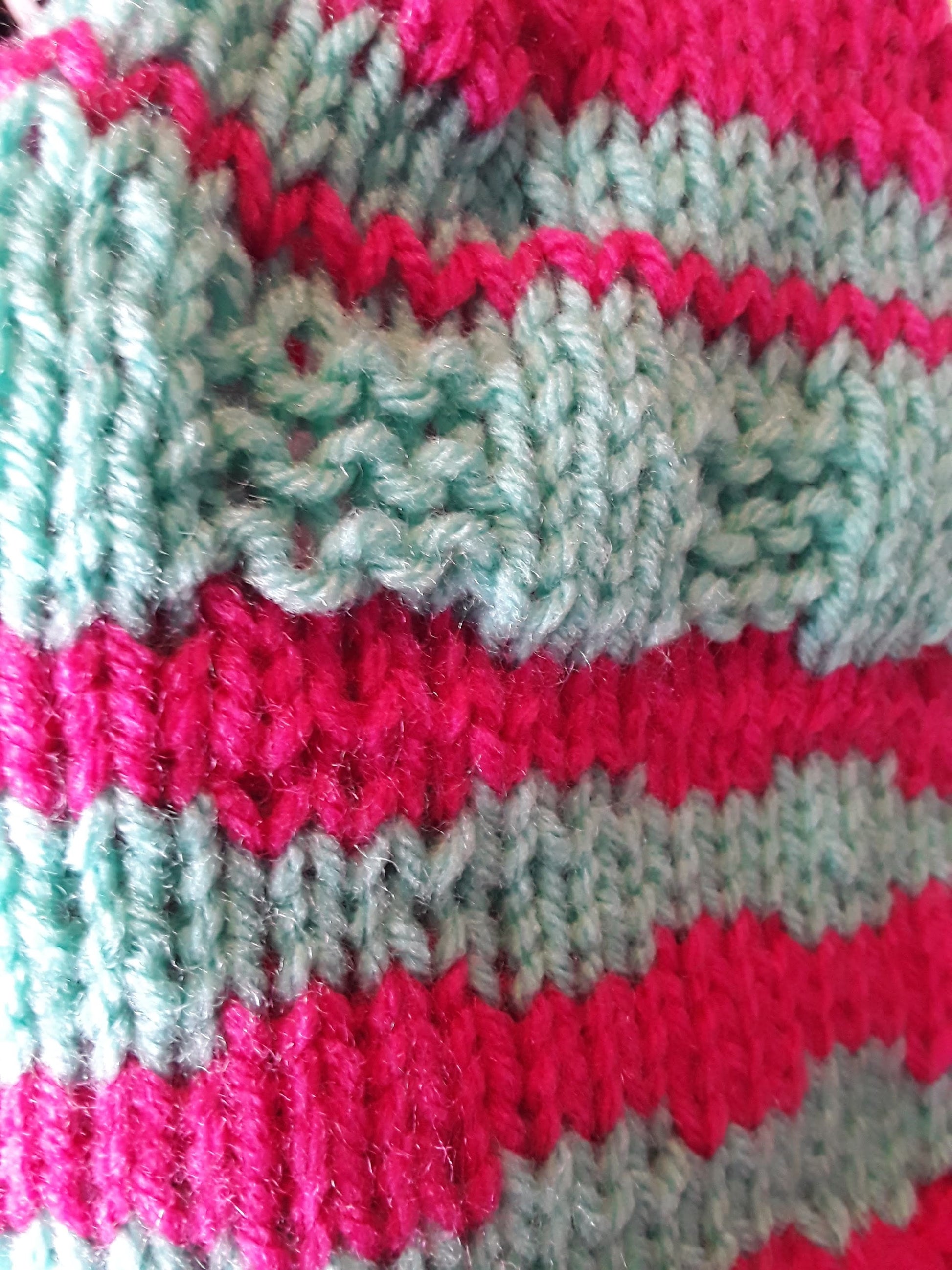 Handknit in Canada, 100% acrylic yarn. Can go in the washing machine; air dry recommended. One size fits most adults.