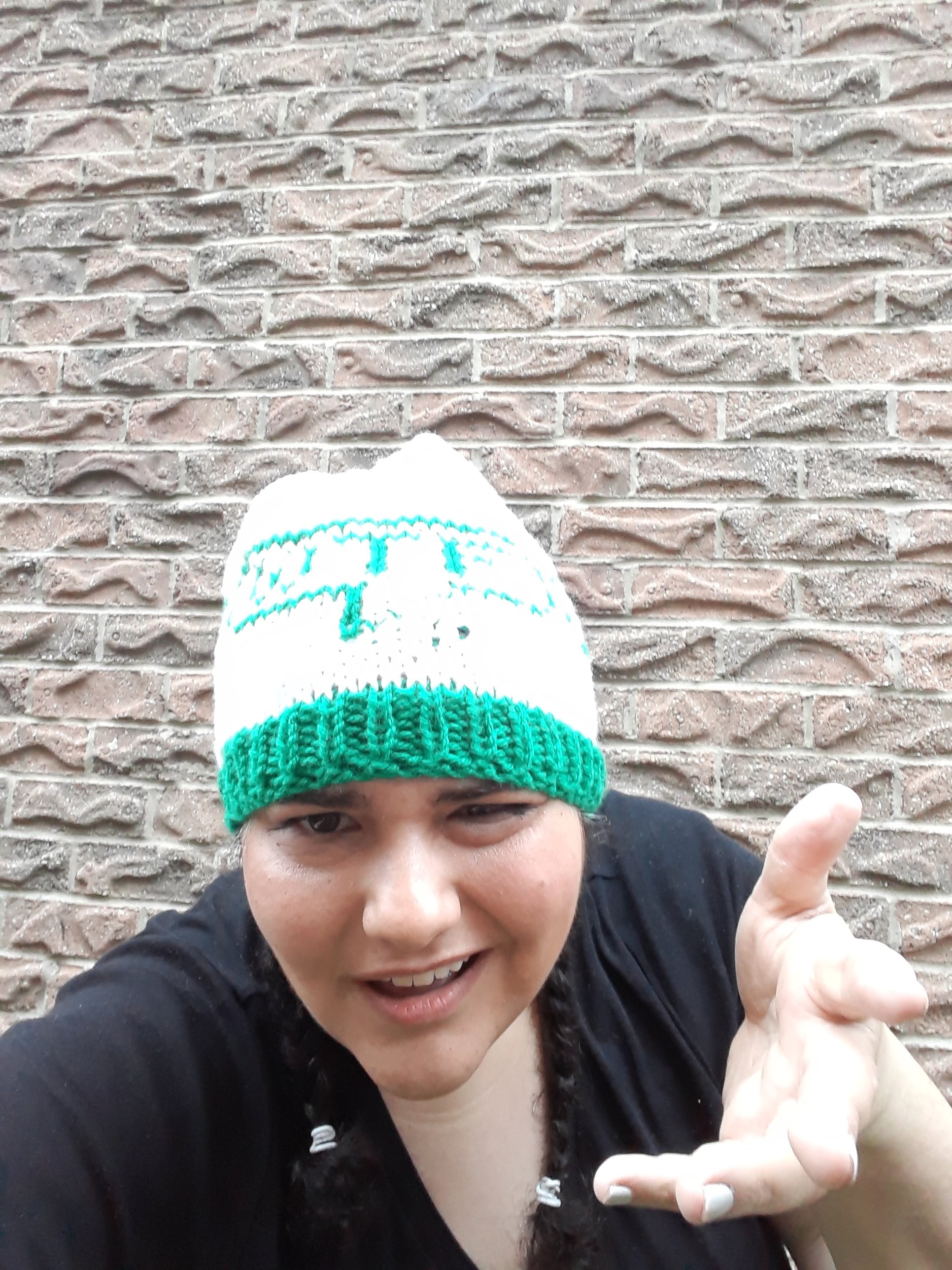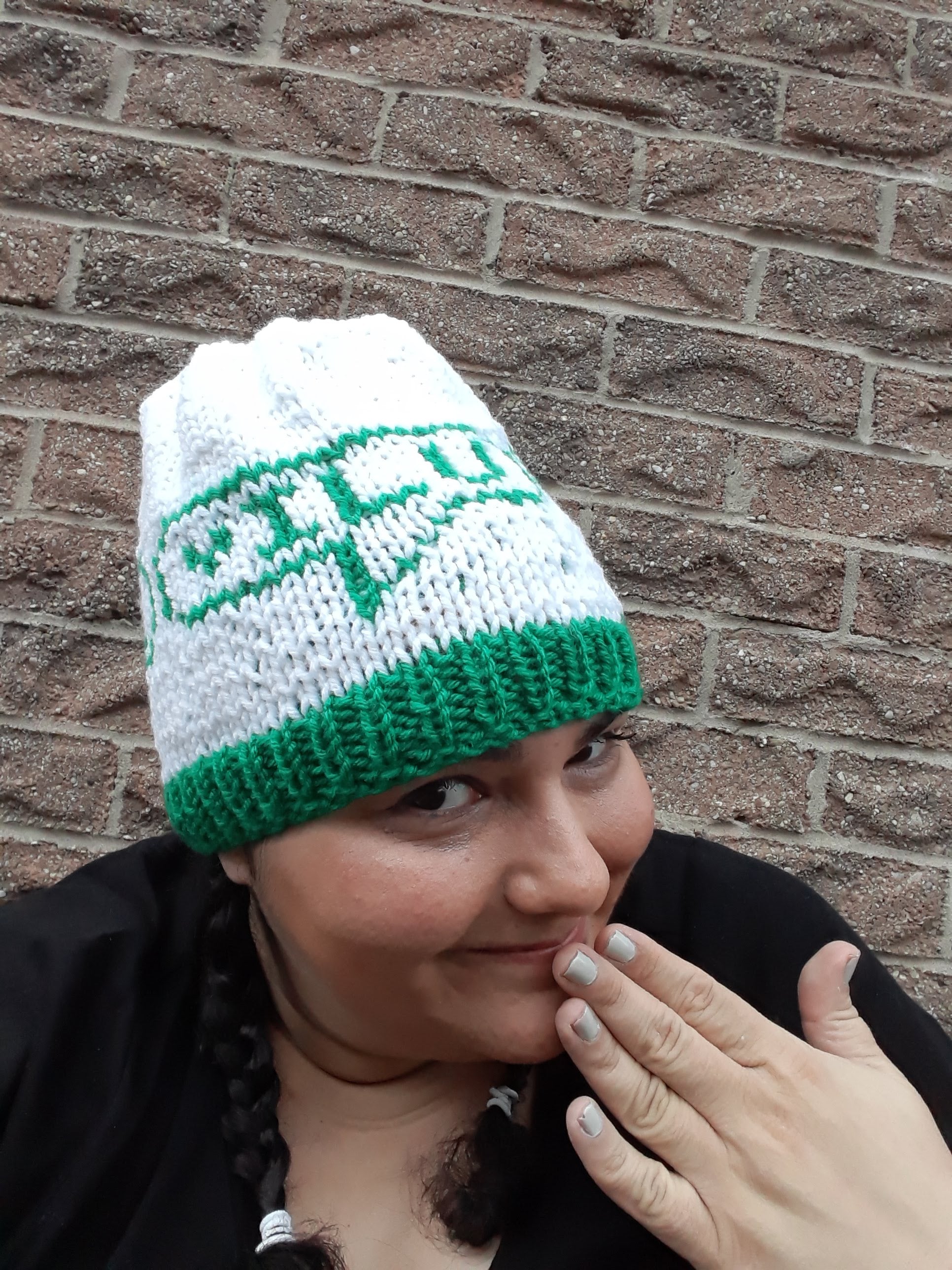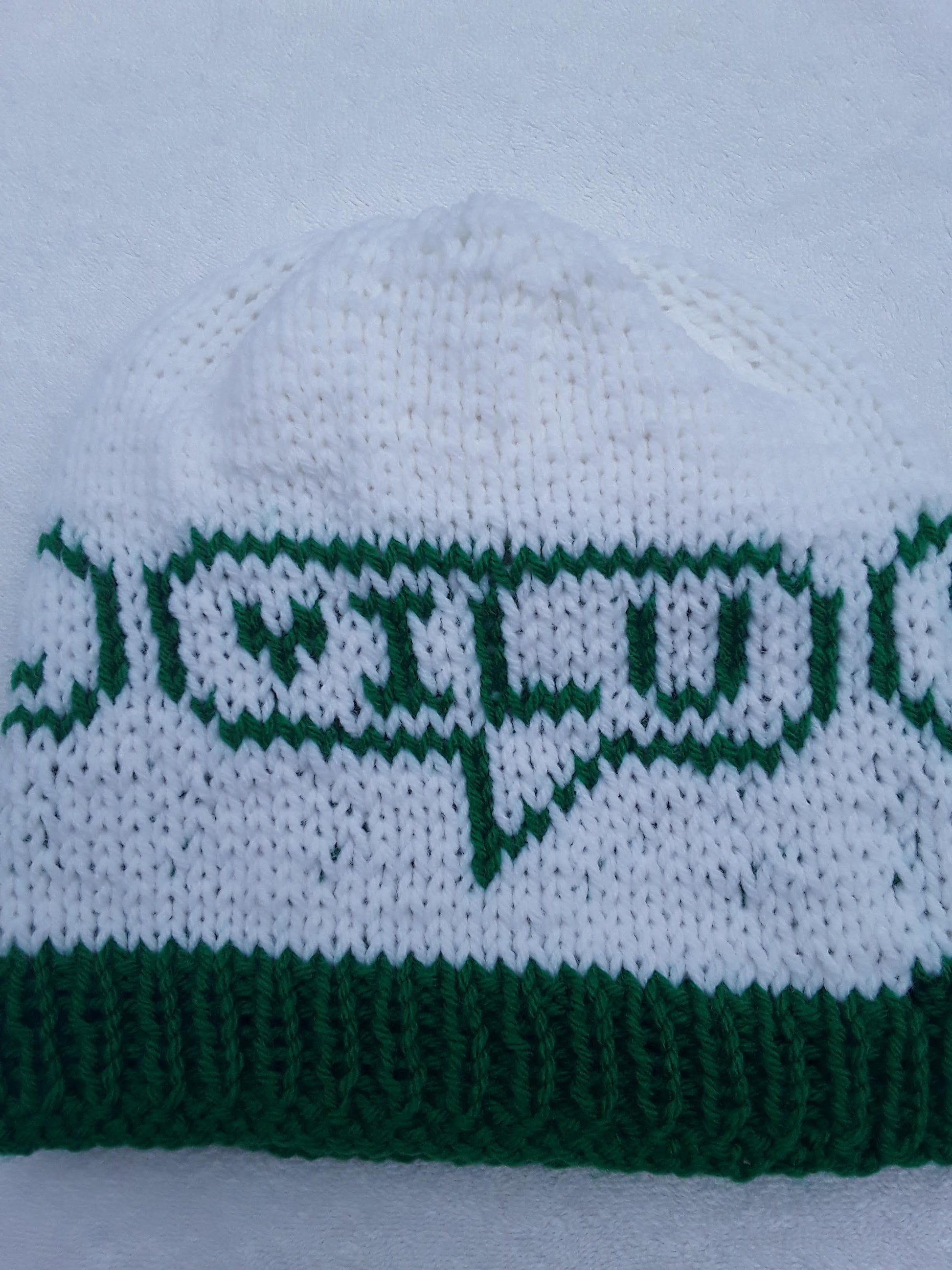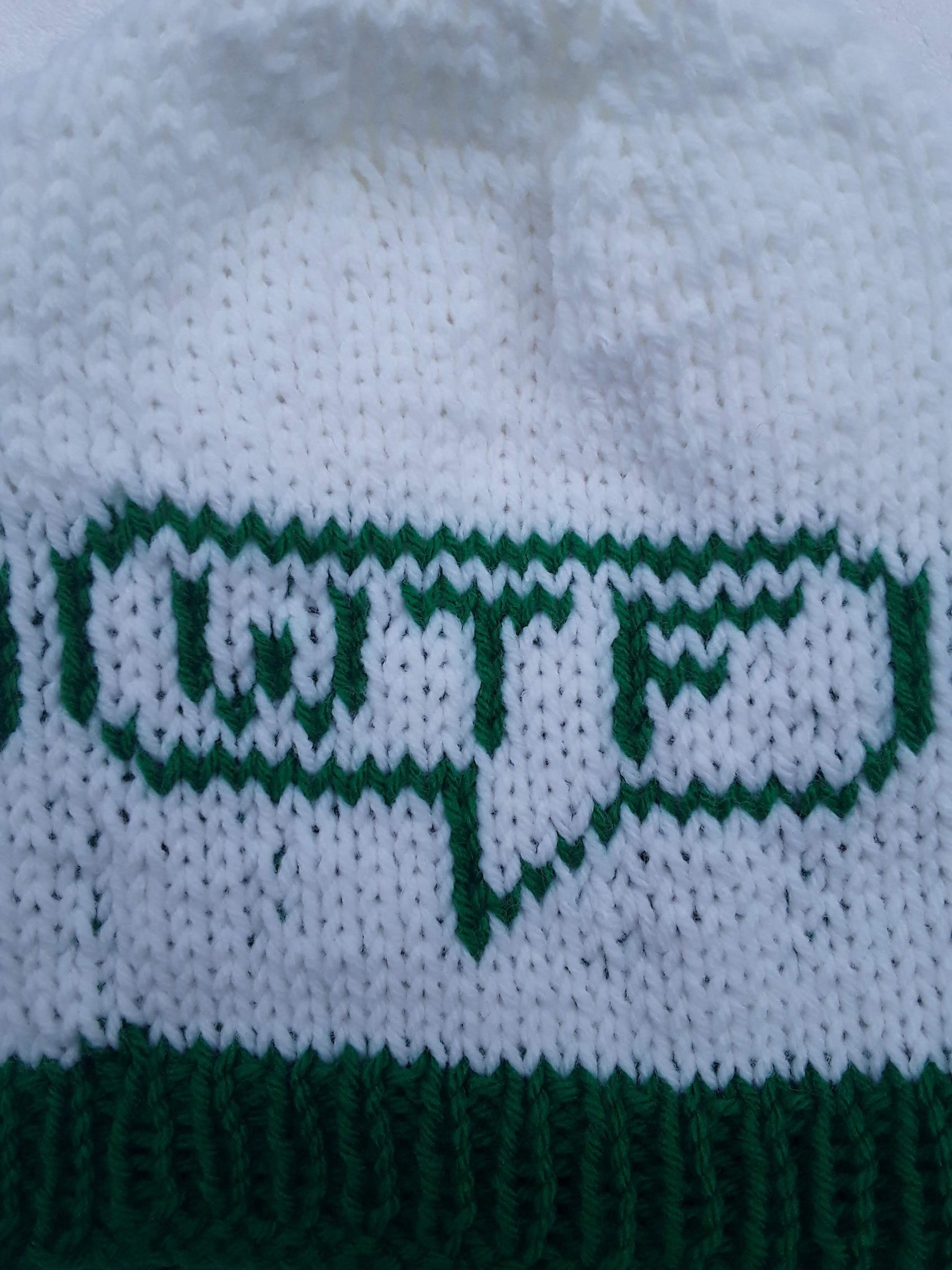 Handknit in Canada, 100% acrylic yarn. Can go in the washing machine; air dry recommended. One size fits most adults.