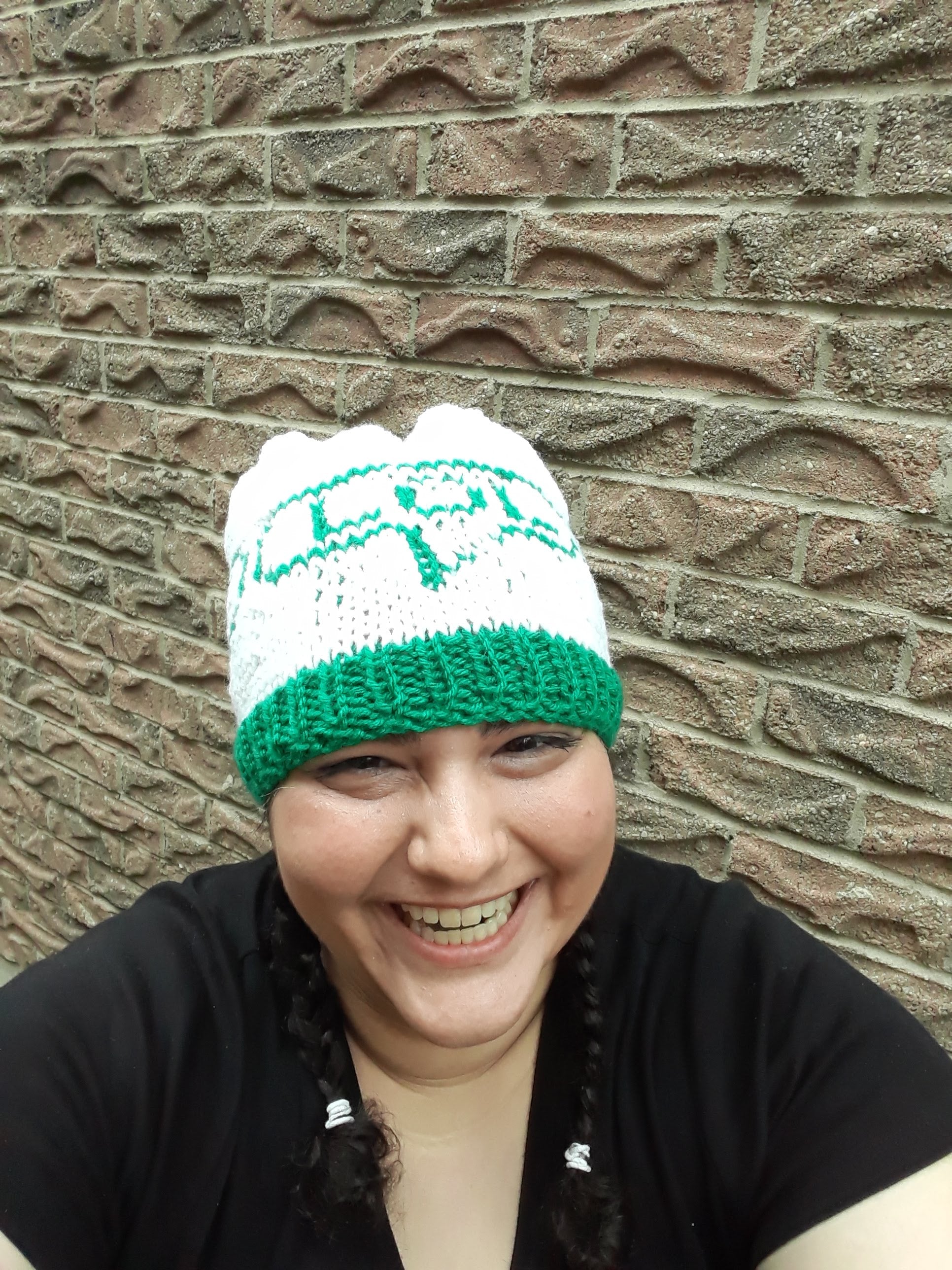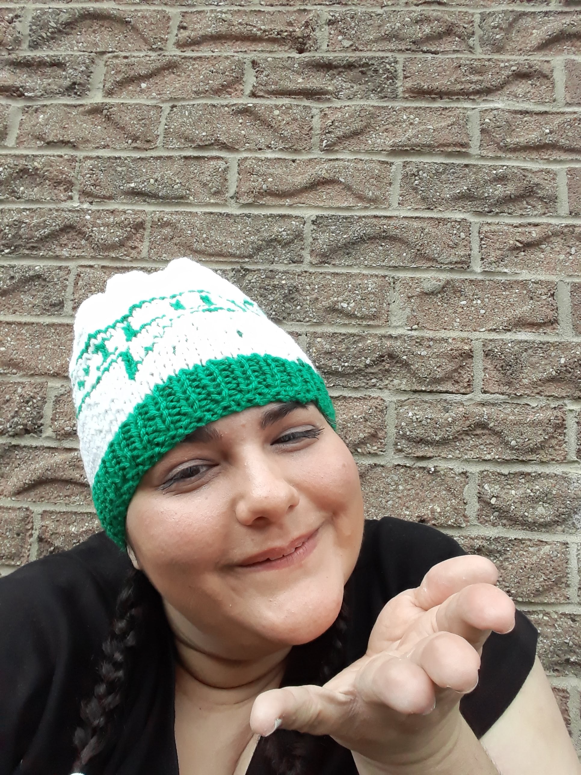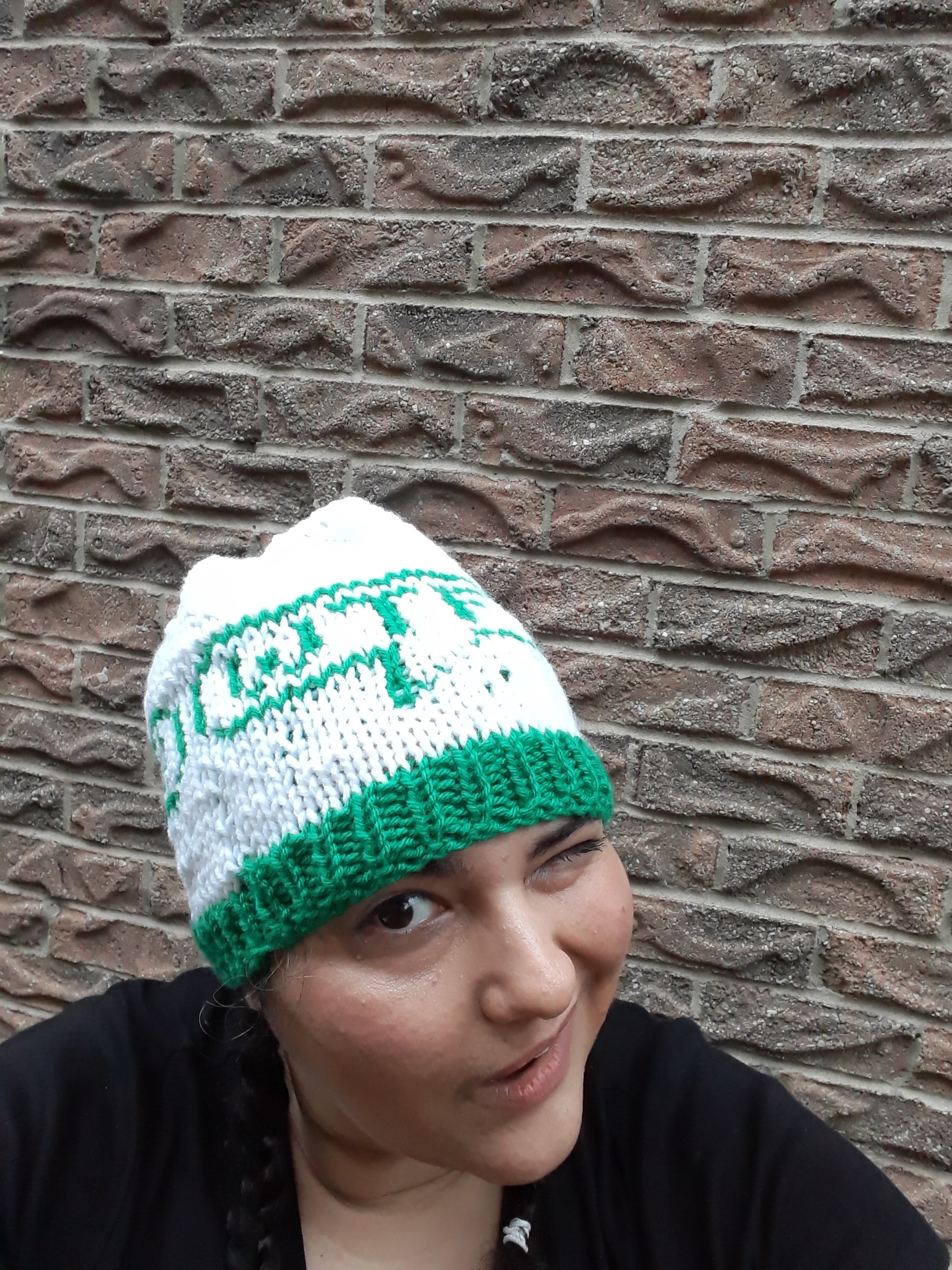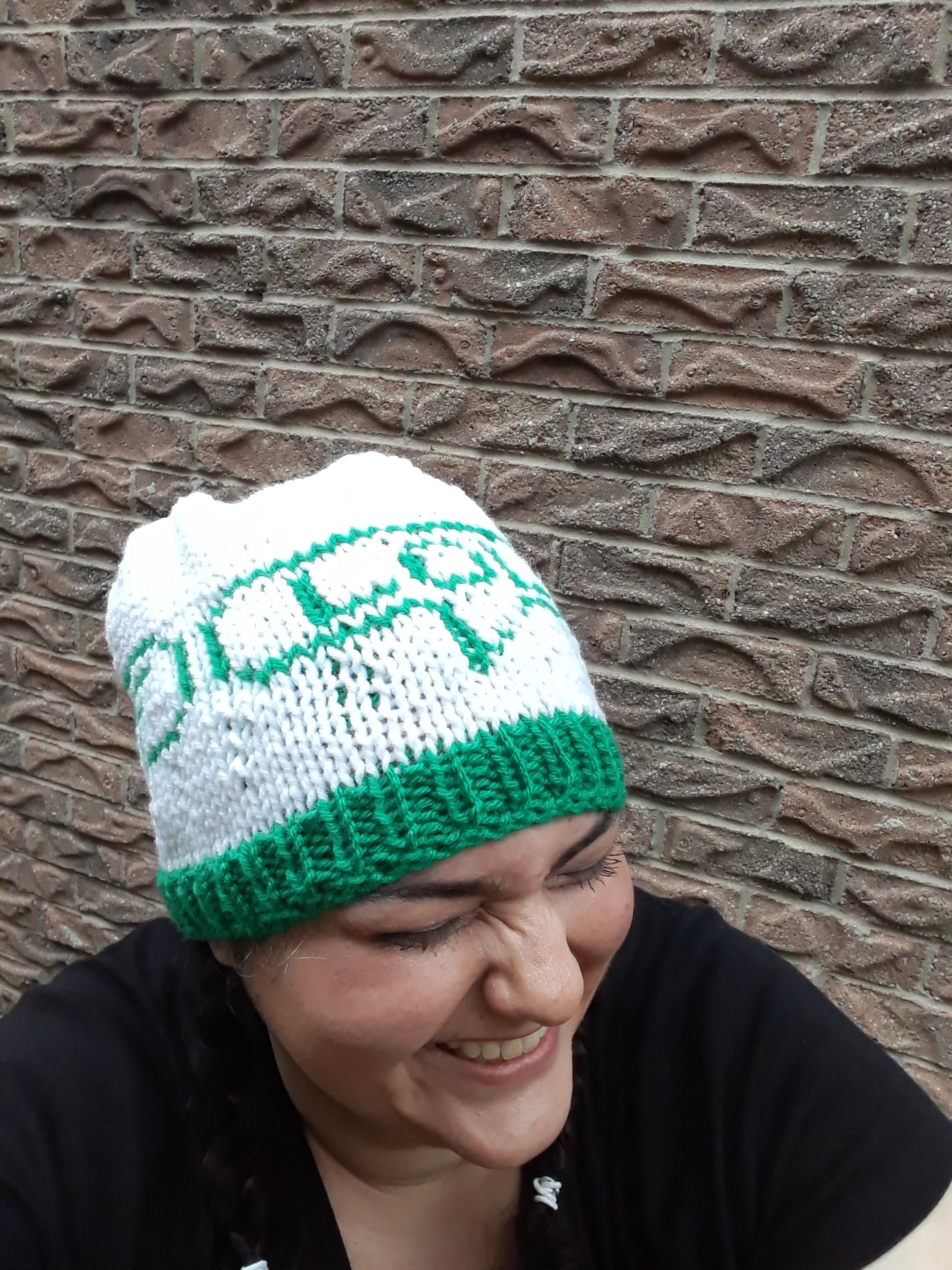 Handknit in Canada, 100% acrylic yarn. Can go in the washing machine; air dry recommended. One size fits most adults.