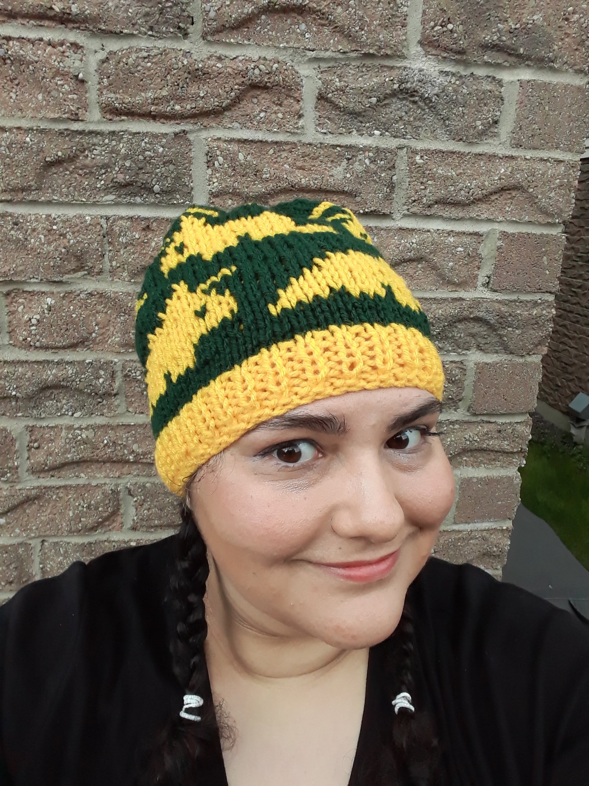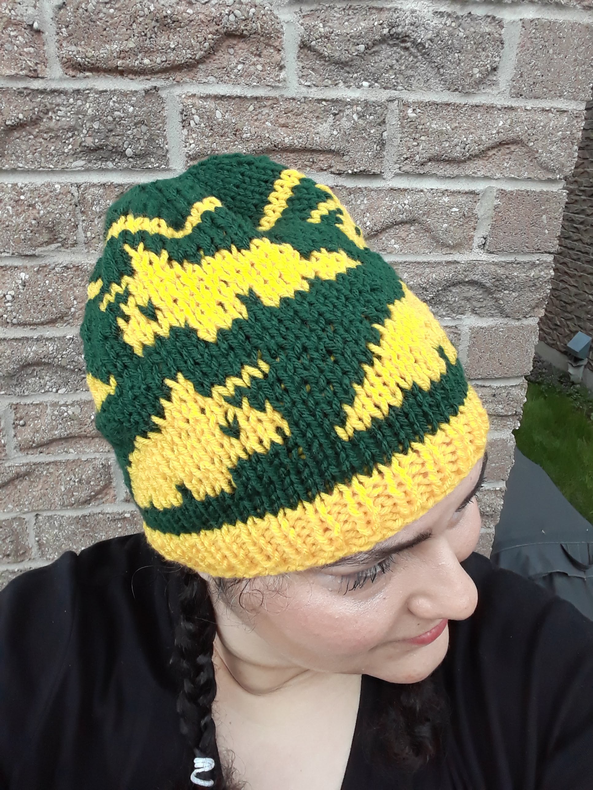 Handknit in Canada, 100% acrylic yarn. Can go in the washing machine; air dry recommended. One size fits most adults.