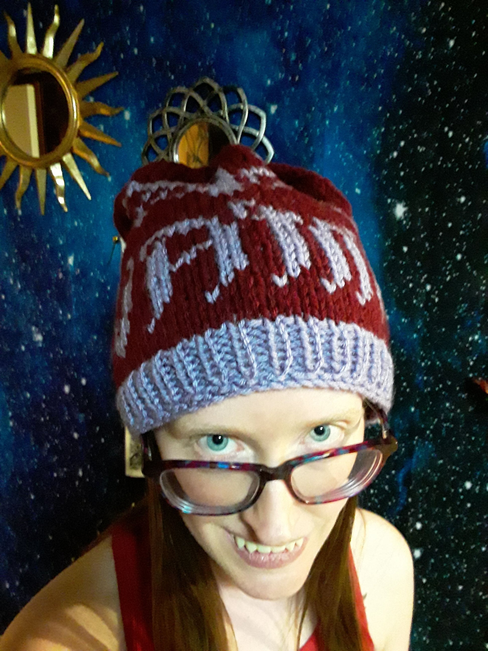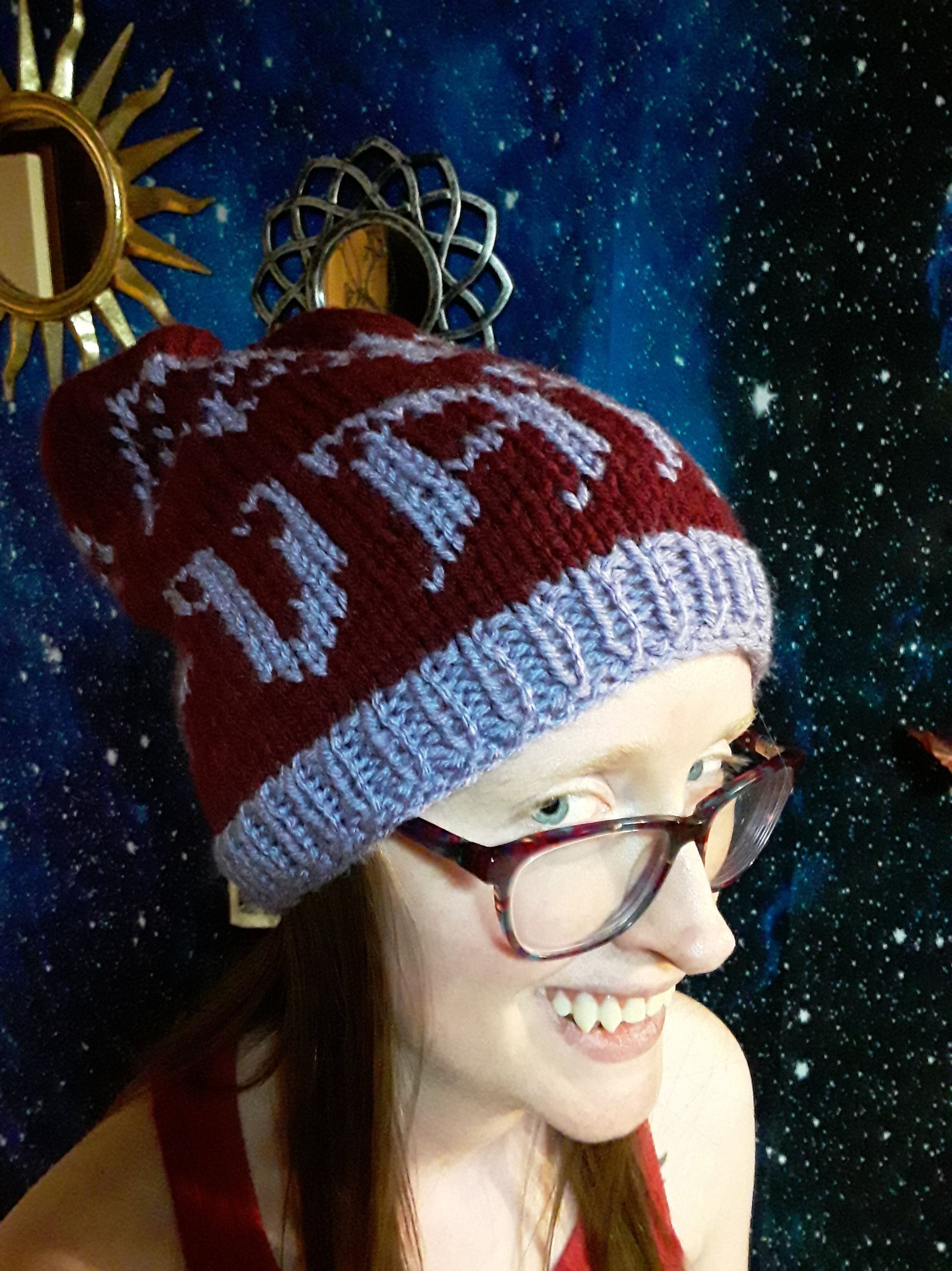 In deep bloody red and mystical lavender, this hat features the word 'VAMP" in huge calligraphy with a large bat stretching overtop. Wear it to the next casual get-together with your vampire brood.