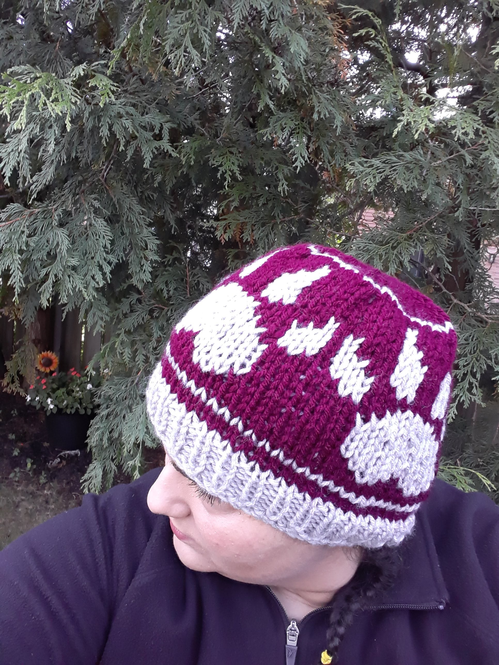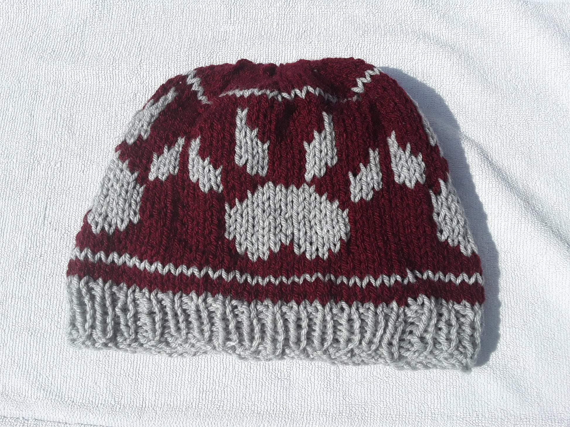 Handknit in Canada, 100% acrylic yarn. Can go in the washing machine; air dry recommended. One size fits most adults.