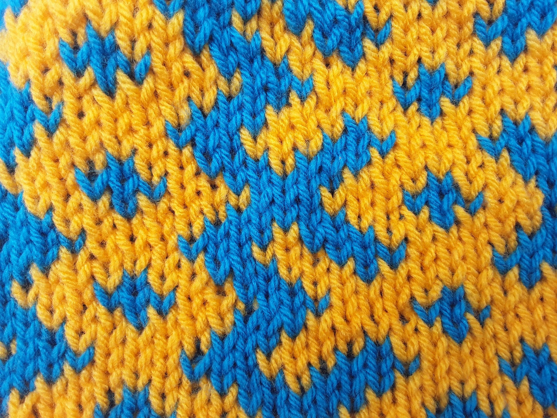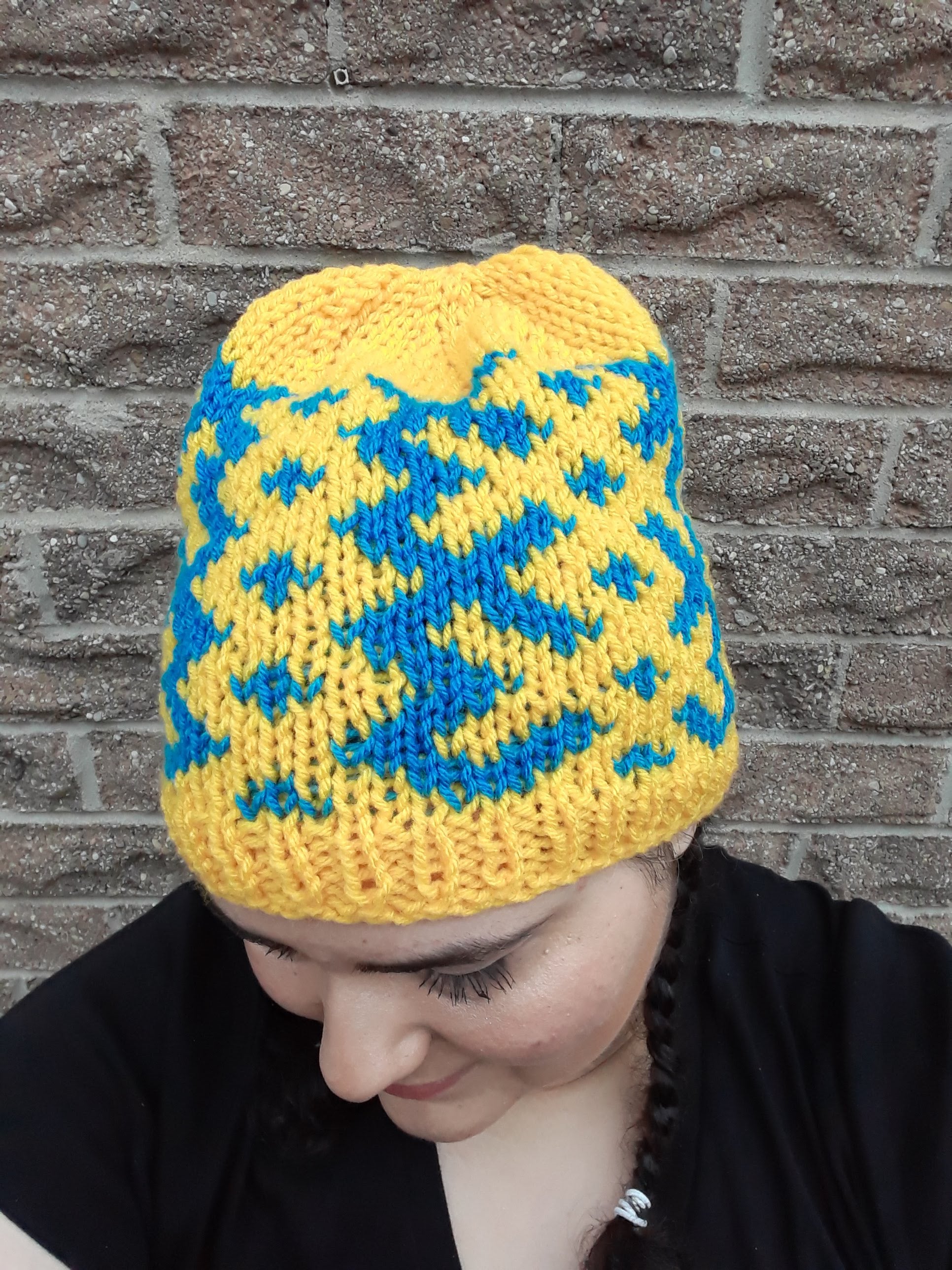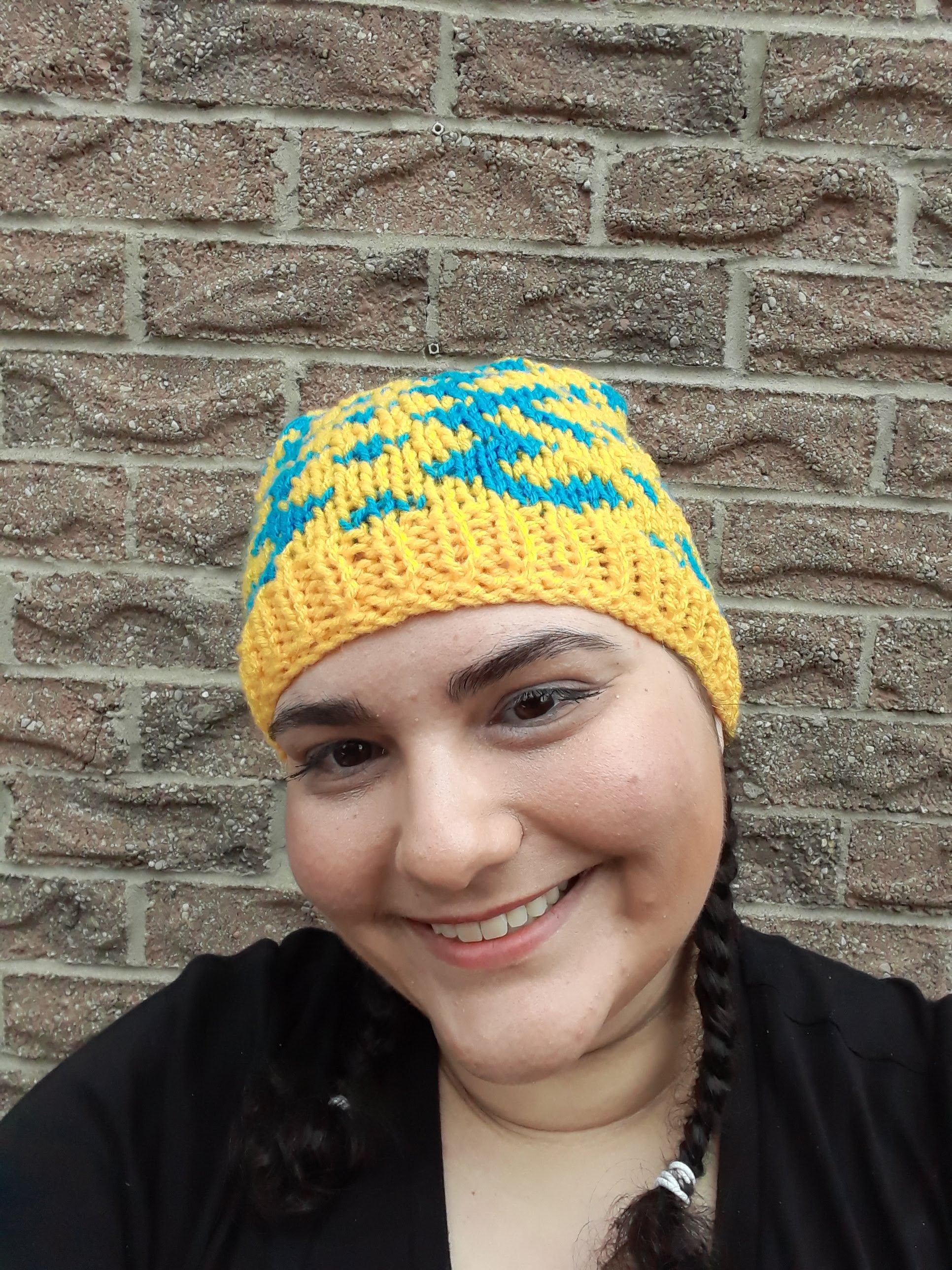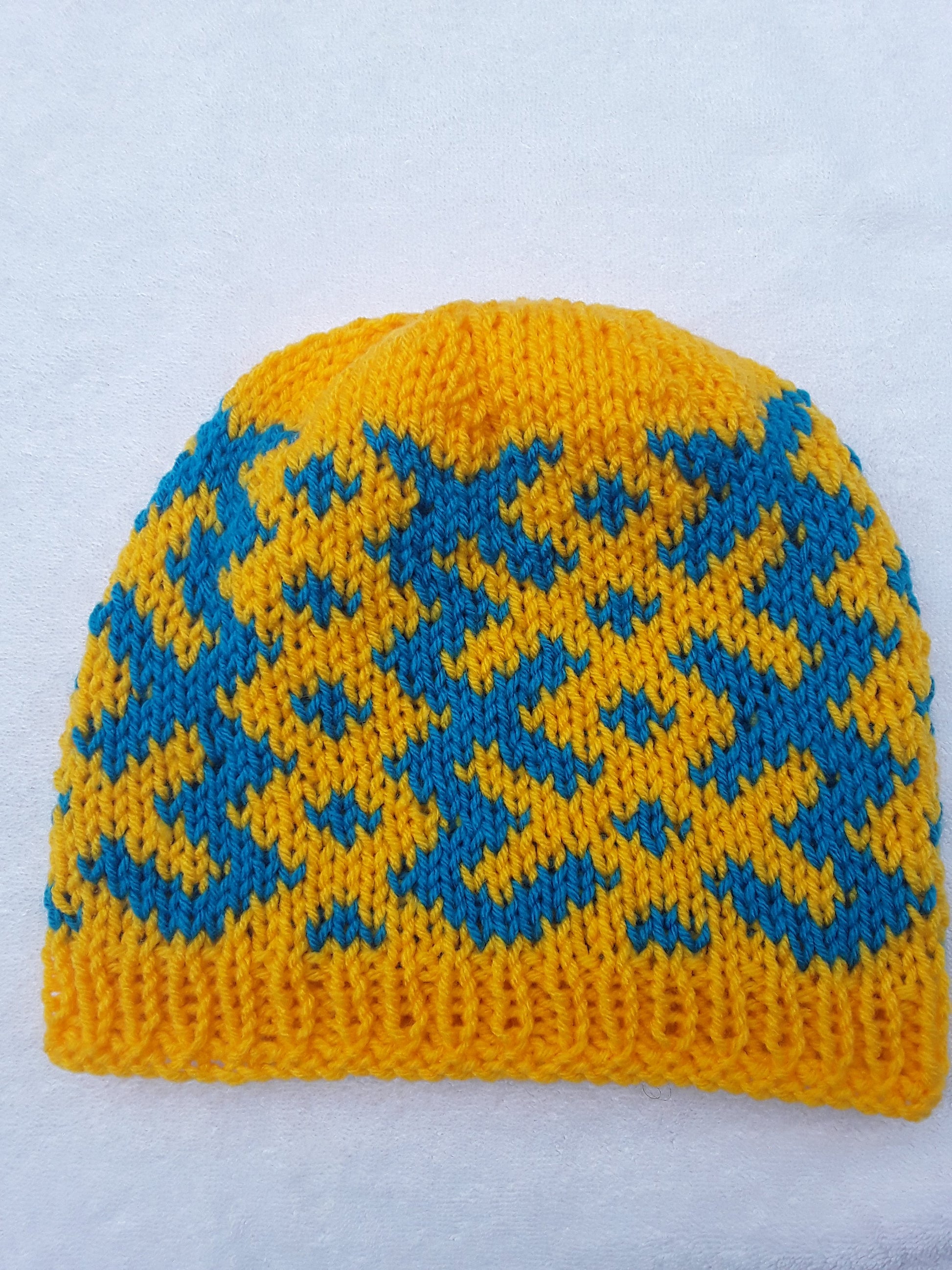 Handknit in Canada, 100% acrylic yarn. Can go in the washing machine; air dry recommended. One size fits most adults.
